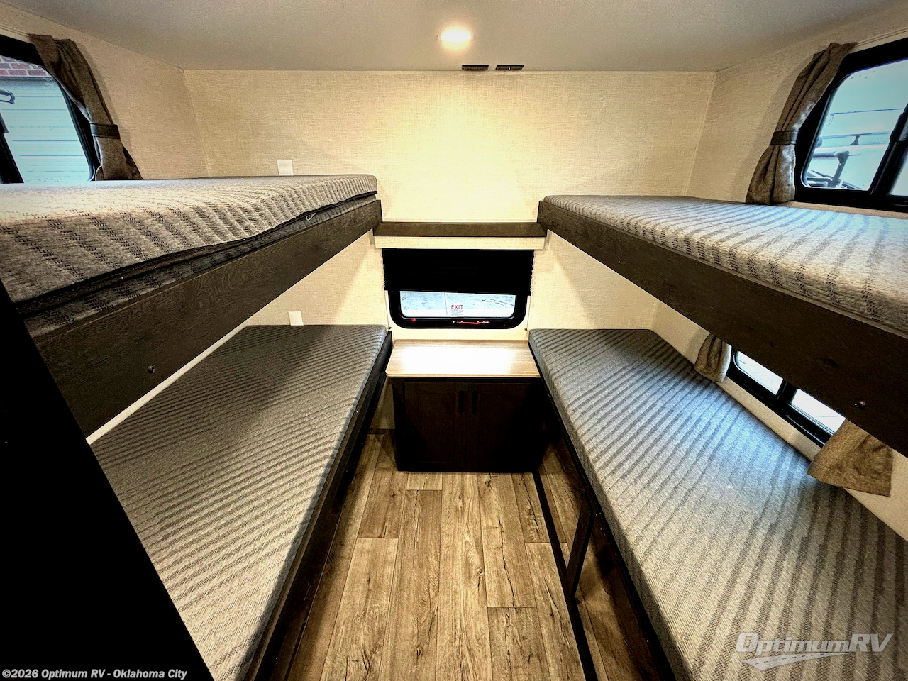 You'll love every minute spent in this spacious travel trailer with a rear private bunkhouse. There are two sets of bunk beds here, and the bottom bunks convert into a king-size bed, giving you options how you want to set up this space. The front private bedroom includes a Sleep Tight queen bed, dual wardrobes, and sliding doors that will help save on space. Your crew can relax on the 70" sofa or Sit N' Slide table within the large slide out and watch a movie with the Smart TV. Since there is an outdoor griddle and refrigerator plus a 20' power awning, you may just find yourselves outside most days!