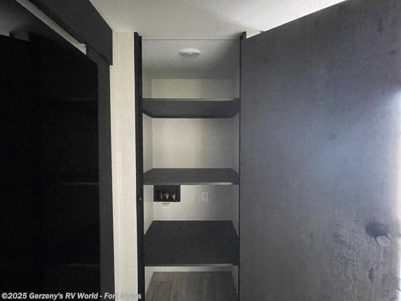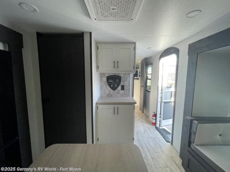 You will be enchanted by this travel trailer features! Starting with the rear bathroom which offers a convenient linen closet, keeping your essentials within reach. Moving forward to the kitchen area, the sit nā slide booth dinette is a fun and functional spot for meals or socializing, also the kitchen is well-equipped with a 10 cu refrigerator, three-burner cooktop, and pantry, making you feel right at home. For the entertainment and leisure, the sofa provides a comfortable spot to relax, and the fireplace adds a cozy touch to the interior plus, the 40ā TV is perfect for family movie nights or enjoying your favorite shows on the go. The front bedroom offers a spacious queen bed, overhead cabinet, and wardrobe. The exterior awning provides shade and protection from the elements, while the pass-through storage will provide ample space for your outdoor gear and equipment.