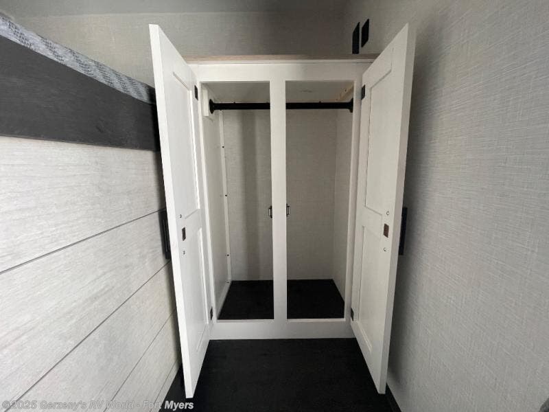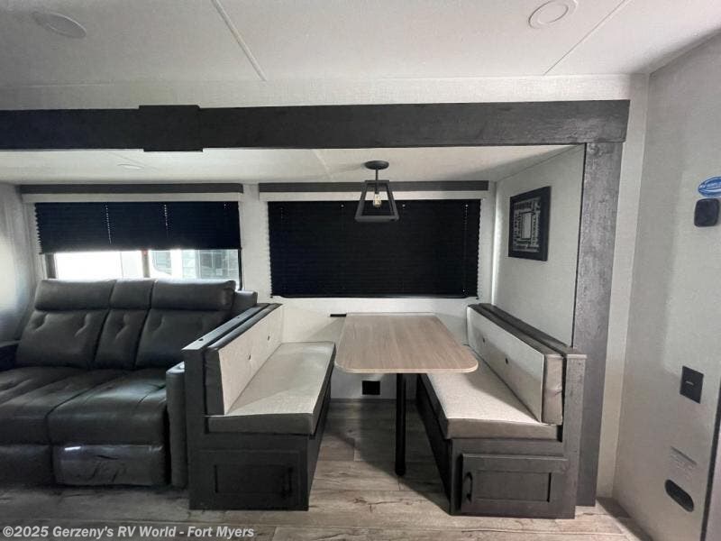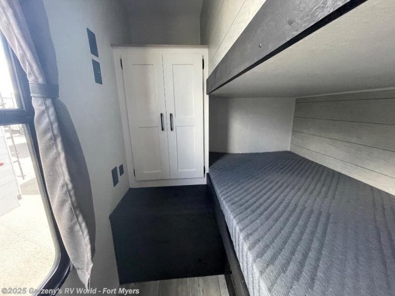 This travel trailer’s bunk beds are perfect for kids, providing ample sleeping space for the whole family. The wardrobes offer plenty of storage for your clothing and essentials.The sofa is a comfortable spot to relax, and the fireplace adds a cozy touch to the interior. The entertainment center is equipped with a 50” TV, perfect for family movie nights or enjoying your favorite shows on the go. The walk-in pantry provides ample storage for your food and snacks, while the 10 cu refrigerator keeps your food and drinks fresh. The sit n’ slide table is a fun and functional spot for meals and adds additional sleeping space. For convenience and comfort the walk-through bath provides easy access and convenience, while the overhead cabinets offer additional storage for your essentials. The front bedroom features a spacious queen bed and overhead cabinet. Head outside and unwind under the shade of the two exterior awnings and store everything you need in the pass-through storage offering ample space for your outdoor gear and equipment.