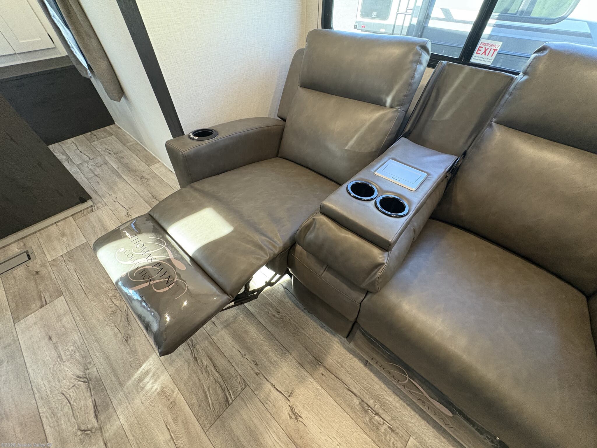 Enjoy the outdoors from the well-appointed exterior, which includes an exterior grill, exterior refrigerator, and an outdoor kitchen, plus a power awning and power stabilizer jacks for easy setup. A pass-thru storage compartment, two entry doors, and rugged PVC roof with roof vents support versatile outdoor living and simple maintenance. Additional safety and convenience items include CO and LP detectors, a fire extinguisher, and a spare tire kit.