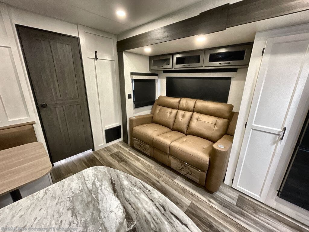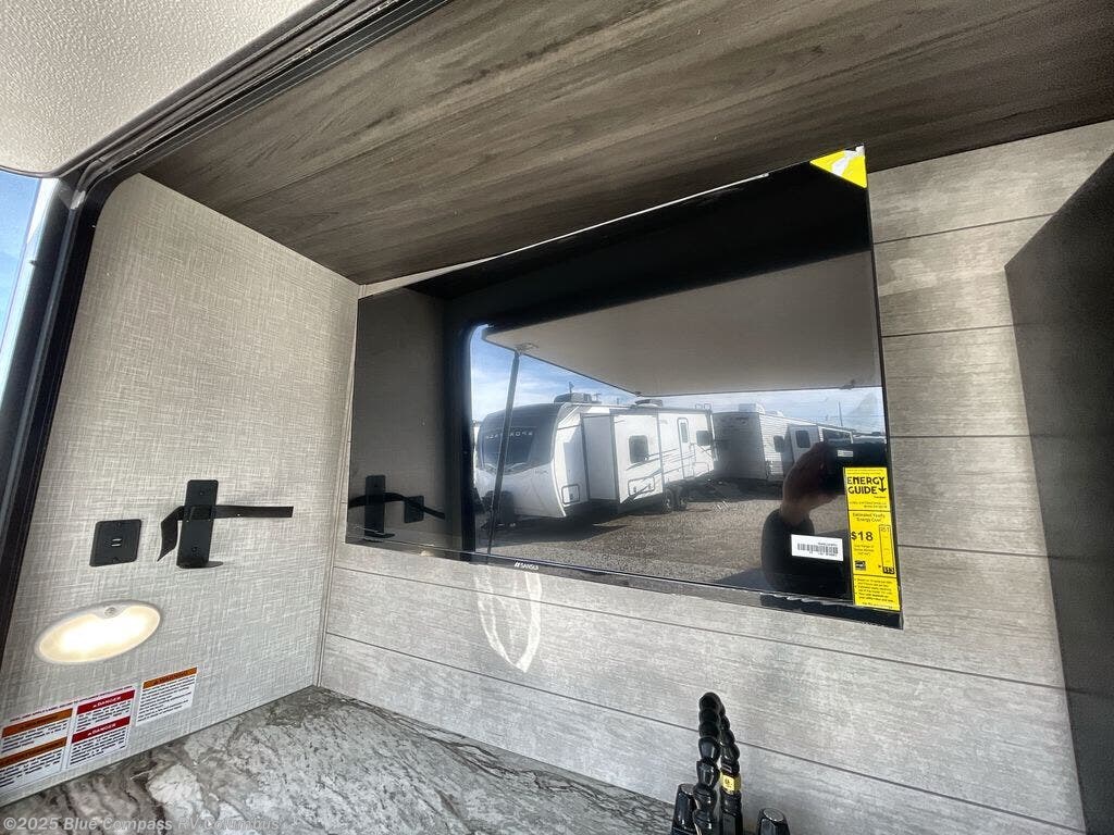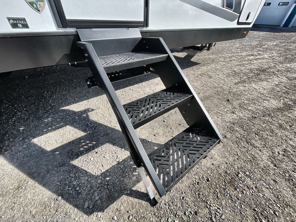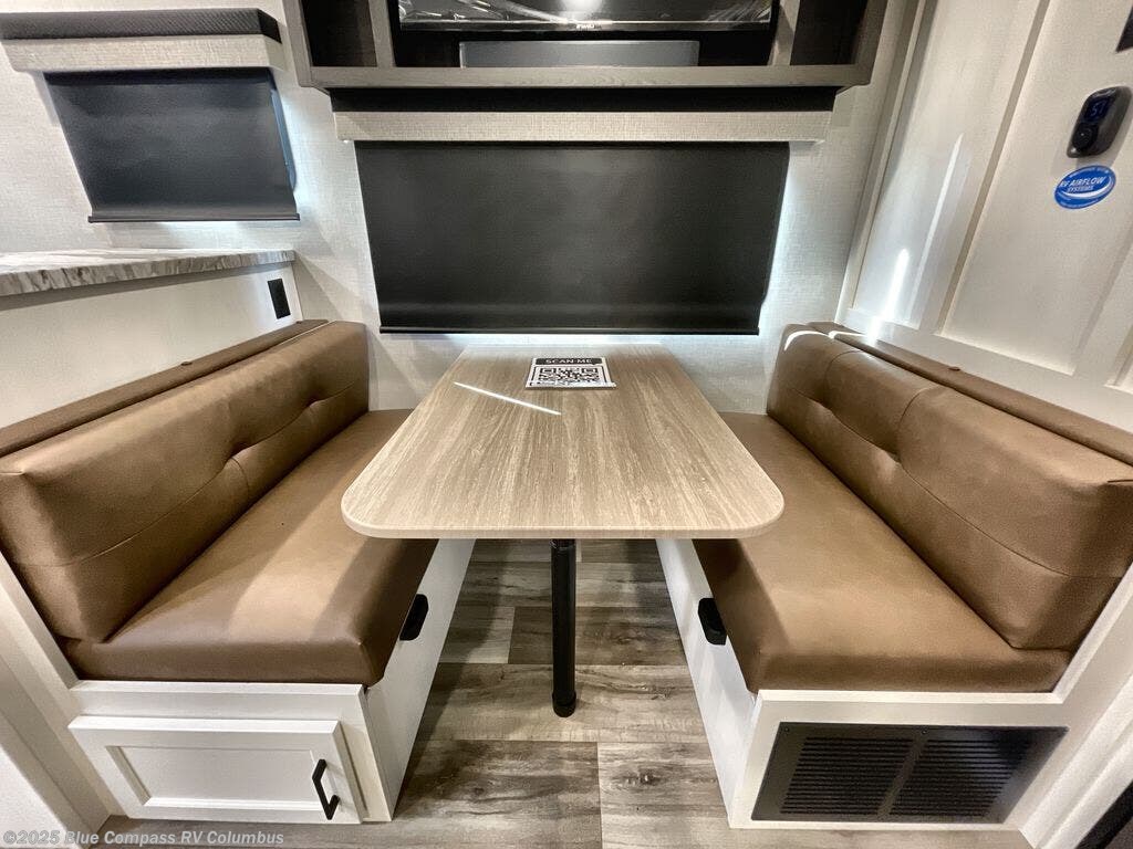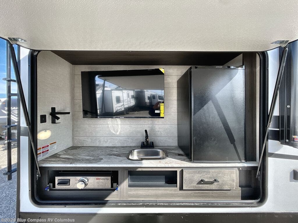 It won't be hard to find comfort in this travel trailer for three to four. Once you arrive at the campground, you can put out the 14' power awning, unload your camp chairs from the pass-thru storage, then start lunch on the exterior kitchen with a griddle. There is also an exterior 40" Smart TV to watch the big game outdoors! If the weather isn't cooperating, you can head inside to relax on the 70" sofa, or play a game at the Sit N' Slide table. You can also choose optional theater seats or a tri-fold sofa in place of the sofa if you prefer this seating arrangements. The kitchen includes appliances to make home-cooked meals, including a 27" oven with a air fryer. The Sleep Tight queen bed in the front private bedroom is sure to bring a great night's rest after you've played all day, and don't overlook the full rear bath, complete with an optional washer and dryer!