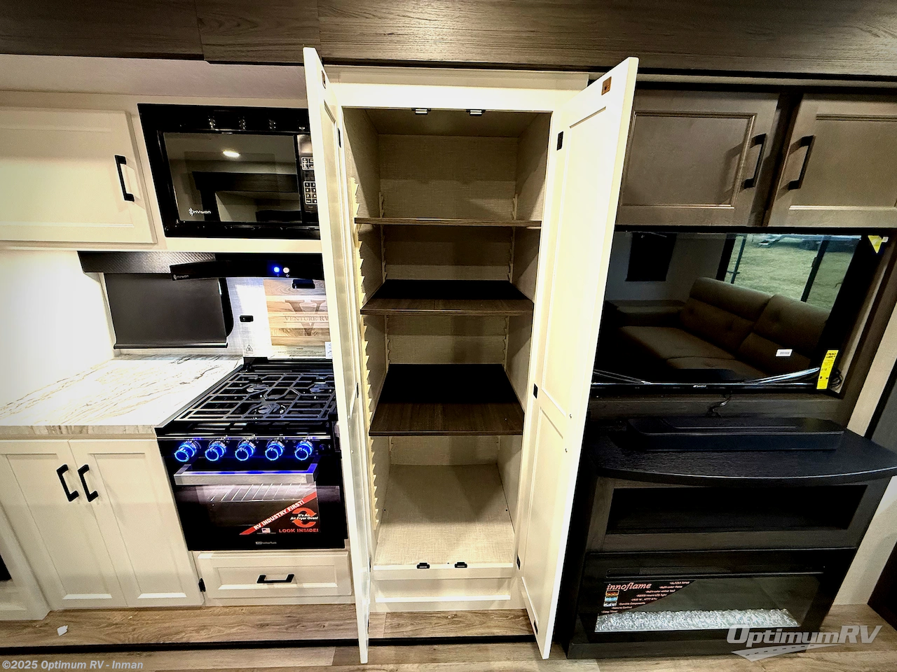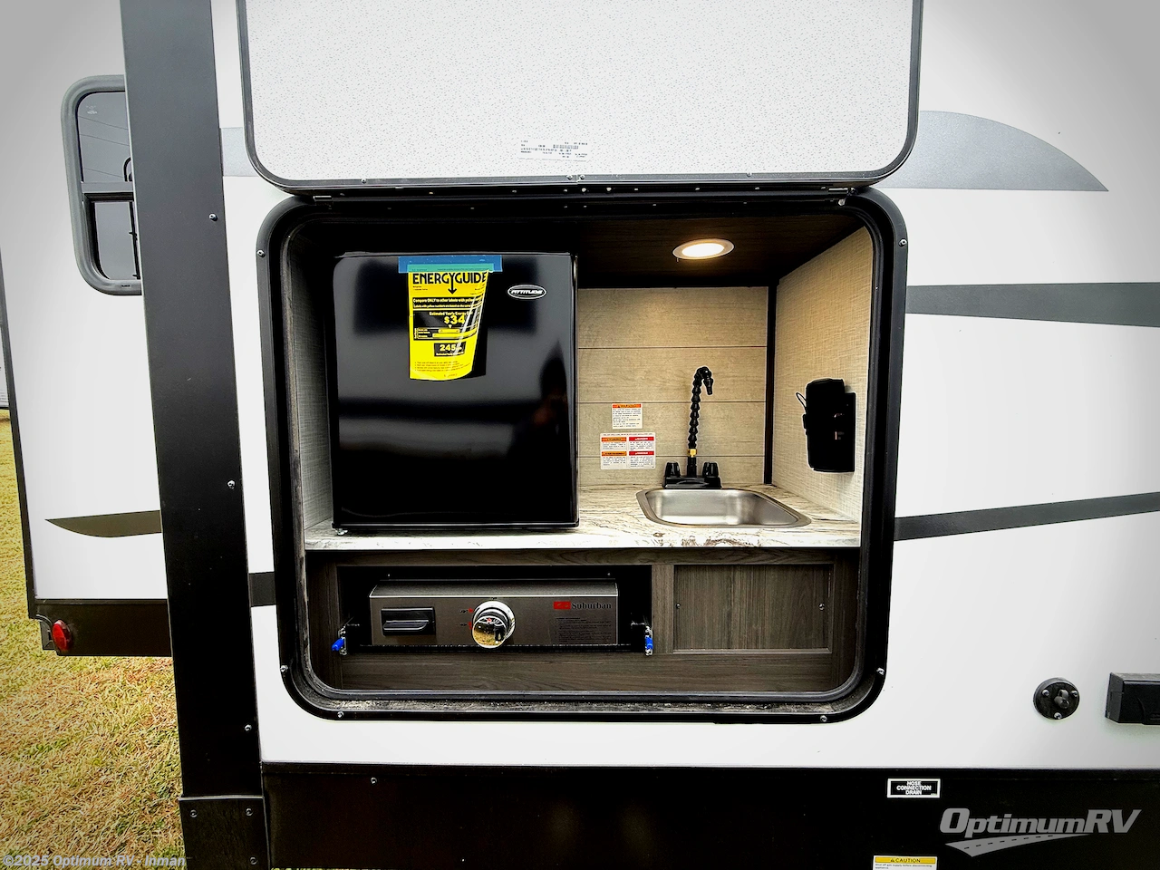 You will feel right at home camping in this travel trailer! From the front private bedroom with a Sleep Tight queen bed to the rear living area with a 70" sofa. The living area also has theater seating with USB ports across from the entertainment center that has a 40" TV for all to see, even those preparing dinner at the kitchen island. Breathe in some fresh air and enjoy a sunrise breakfast as you cook pancakes on the griddle at the outside campfire café. You can store your dishes in the hutch and play games at the Sit N' Slide table with flipside reversible cushions. After a fun day at the beach, head to the dual entry bathroom to rinse the sand out of your hair in the 34" radius shower and grab your towel from the convenient linen closet!