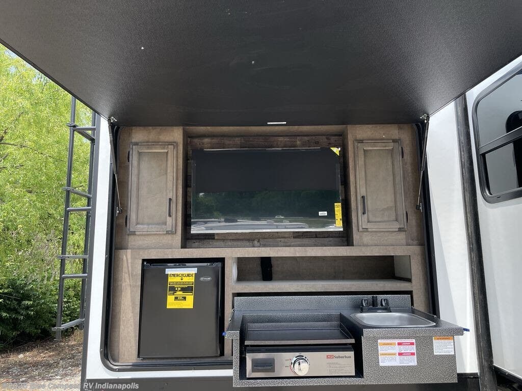 Stay protected rain or shine with the two 10' legless awnings with wind sensors on this travel trailer! Some other exterior features you will enjoy include a campfire café with a 40" TV to watch the big game while you grill steaks on the griddle, and the pass-through storage area with slam latch baggage doors will keep your gear in place. Inside, there is a rear private bunkhouse with a closet, a 32" x 70" flip-up bunk above a 70" sofa with a table, and a 28" x 70" bunk above a 40" x 70" bottom bunk. The living area has a sofa across from an entertainment center with a frameless fireplace and a 40" TV with a swing arm so others can watch it from the Sit N' Slide table. The dual entry bathroom has a 34" radius shower to freshen up in, and is easy to access, especially those staying in the front private bedroom!