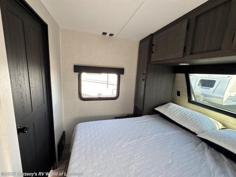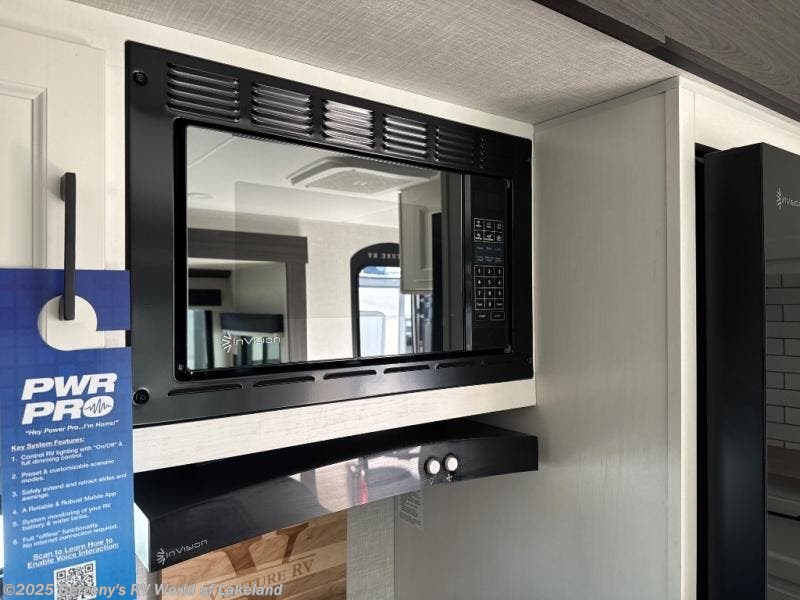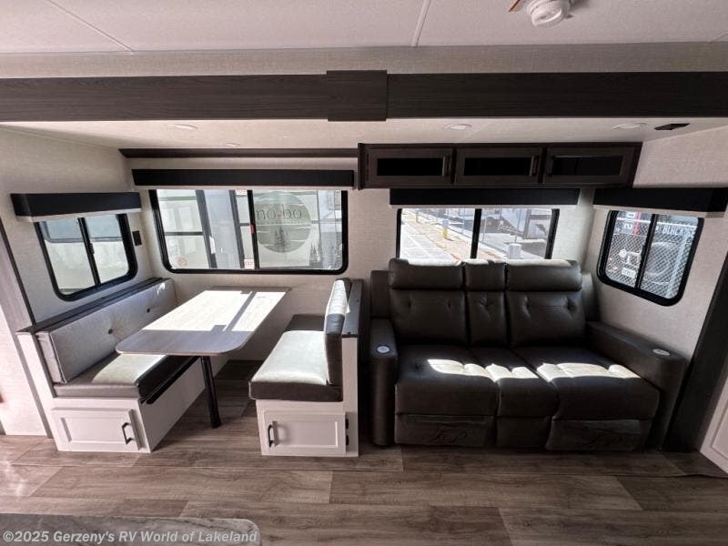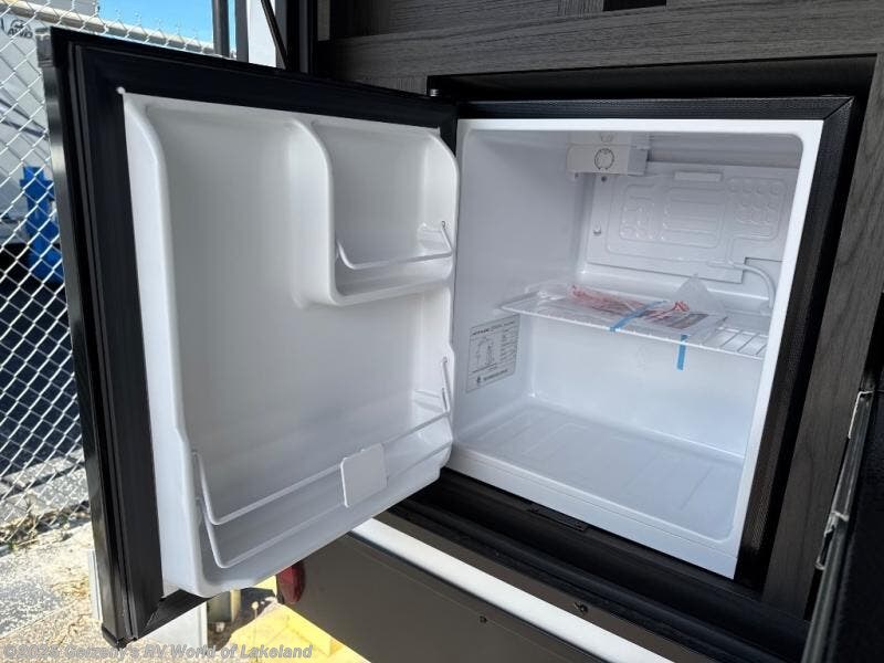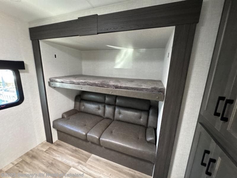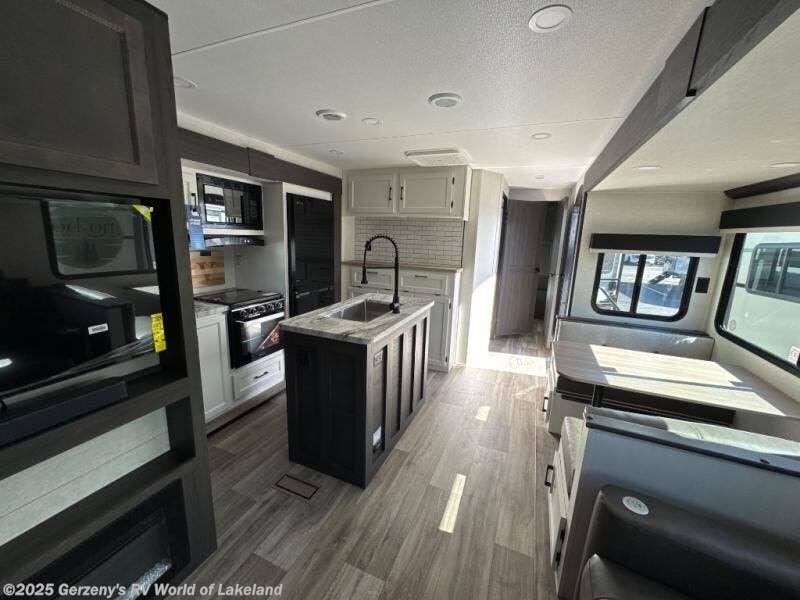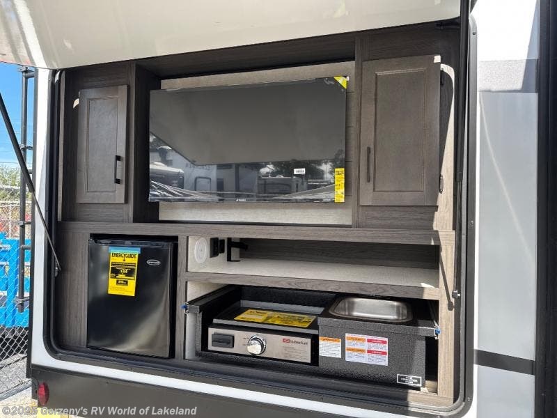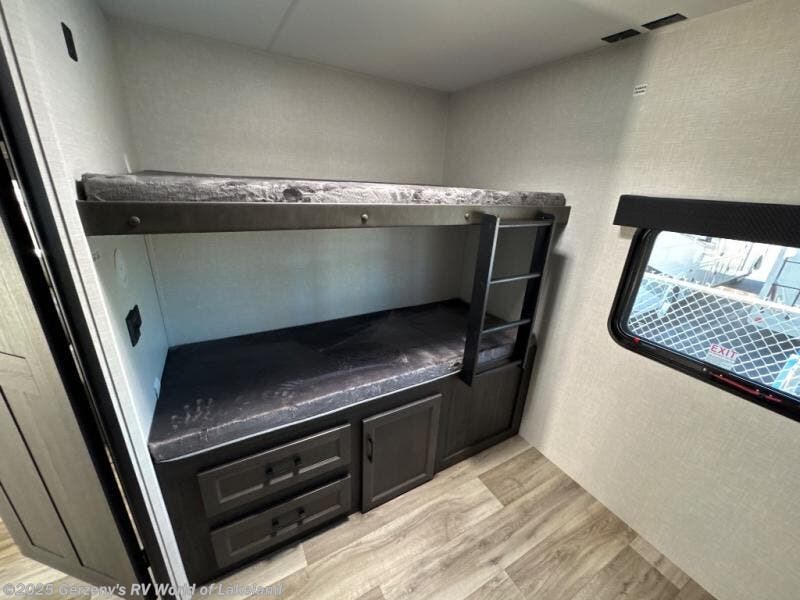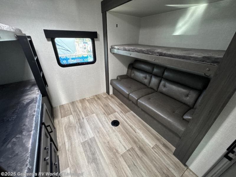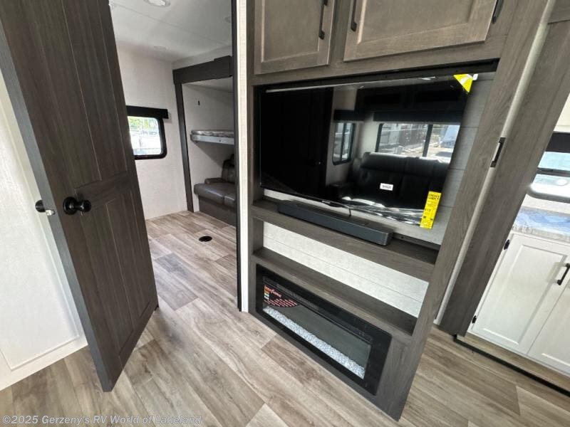 Stay protected rain or shine with the two 10' legless awnings with wind sensors on this travel trailer! Some other exterior features you will enjoy include a campfire café with a 40" TV to watch the big game while you grill steaks on the griddle, and the pass-through storage area with slam latch baggage doors will keep your gear in place. Inside, there is a rear private bunkhouse with a closet, a 32" x 70" flip-up bunk above a 70" sofa with a table, and a 28" x 70" bunk above a 40" x 70" bottom bunk. The living area has a sofa across from an entertainment center with a frameless fireplace and a 40" TV with a swing arm so others can watch it from the Sit N' Slide table. The dual entry bathroom has a 34" radius shower to freshen up in, and is easy to access, especially those staying in the front private bedroom!