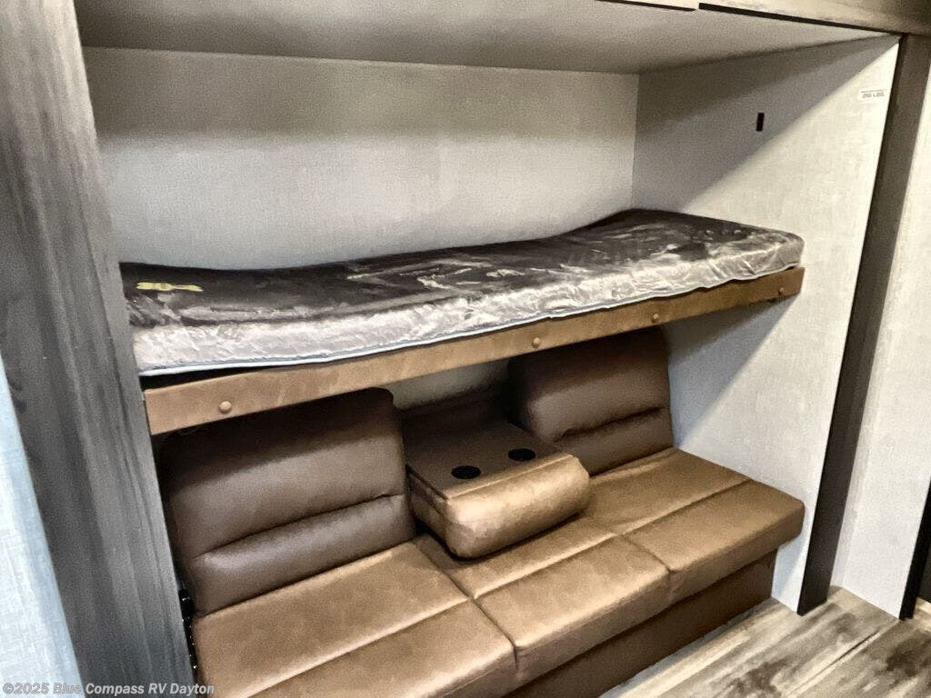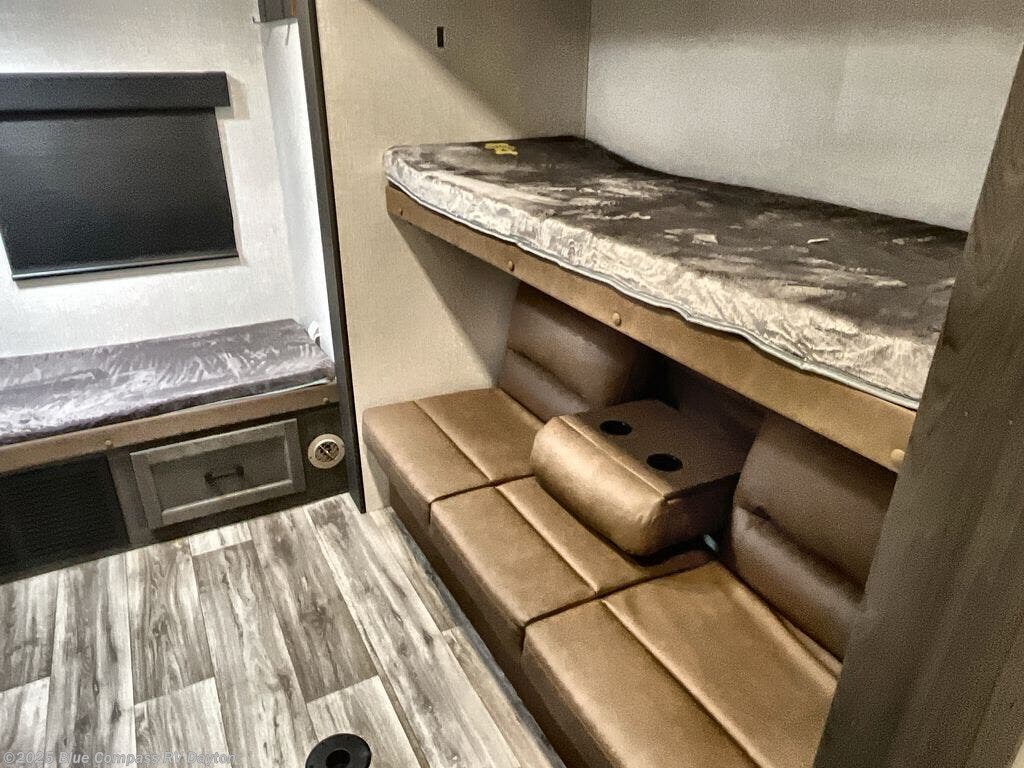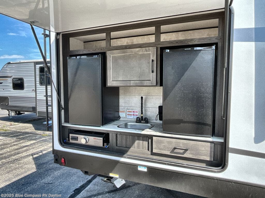 It's a clean decision with a bath and a half to take this travel trailer on your next camping trip! The rear private bunkhouse is decked out with a 28" x 70" bunk bed, a 32" x 70" top bunk, a 28" x 73" flip-up bunk above a 72" sofa with table, and a flip desk to do some school work. The half bathroom has an entry/exit door so you can get back to cooking at the outdoor campfire café which has two outdoor 3 cu. ft. refrigerators, a sink, griddle, and storage. Your clean up will be a breeze thanks to the kitchen island with a large sink and dish drying rack. If you need extra sleeping space then simply convert the 70" sofa at night. There is also a Sit N' Slide table with flipside reversible cushions. Those staying in the front private bedroom will enjoy a good night's rest on the Sleep Tight queen bed and have the convenience of accessing the dual entry bathroom!