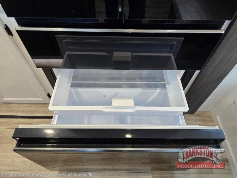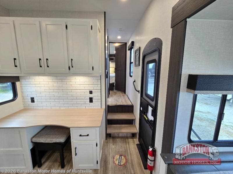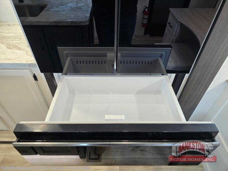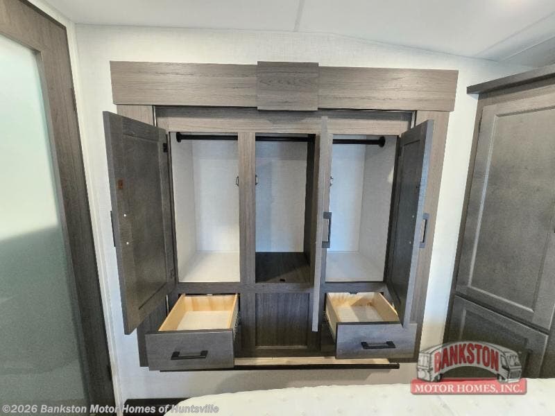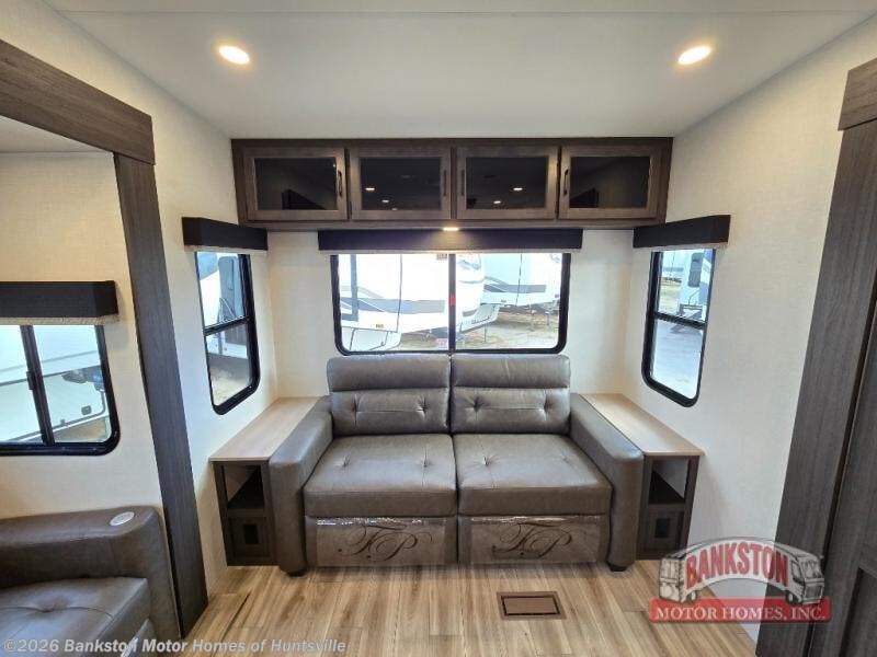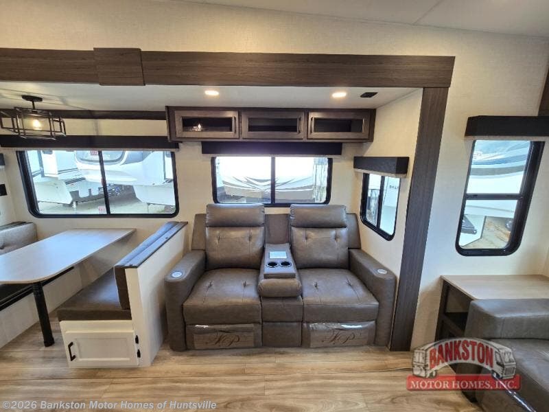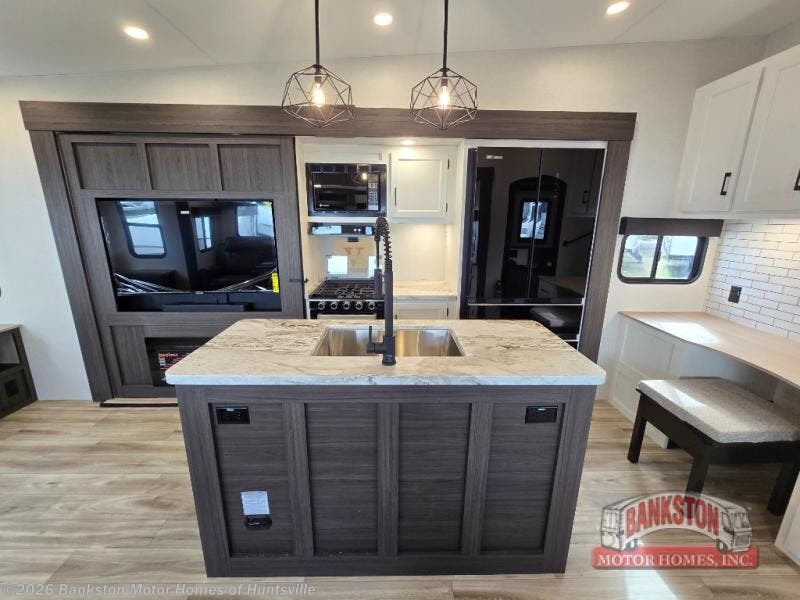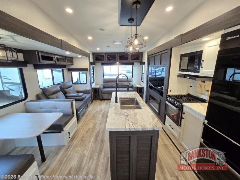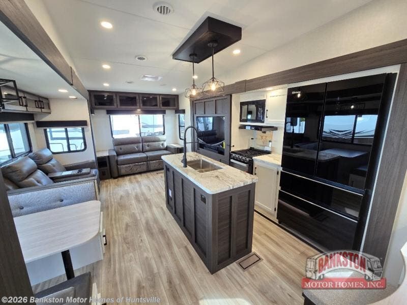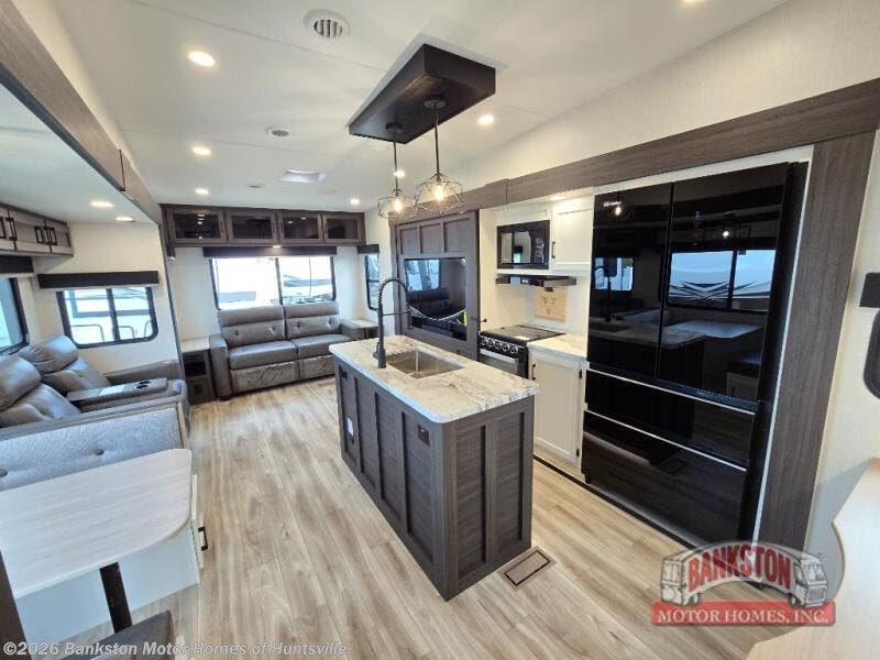 At the front of the fifth wheel, you’ll find a private bedroom designed for rest and relaxation, featuring a 60" x 80" Sleep Tight queen bed and a spacious slide-out wardrobe, with additional wardrobes on each side for all your clothing and essentials. Down the hall, the full bathroom offers residential comfort with a 30" x 36" shower with glass slider door, a porcelain foot-flush toilet, and an oval stainless-steel sink. In the center and rear, the open living and kitchen area features dual opposing slides for generous floor space. The fully equipped kitchen includes a pantry, three-burner range with flush-mount glass cover, 21" oven with air fryer, microwave, and a large 18 cu. ft. refrigerator, plus a center island with sink and added counter space. Nearby, a desk and hutch provide versatility for work or storage, while the table with chairs and Versa benches and theater seating make it easy to dine or relax. At the rear, a 70" tri-fold sofa offers the perfect spot to unwind and easily converts into extra-sleeping space when needed.