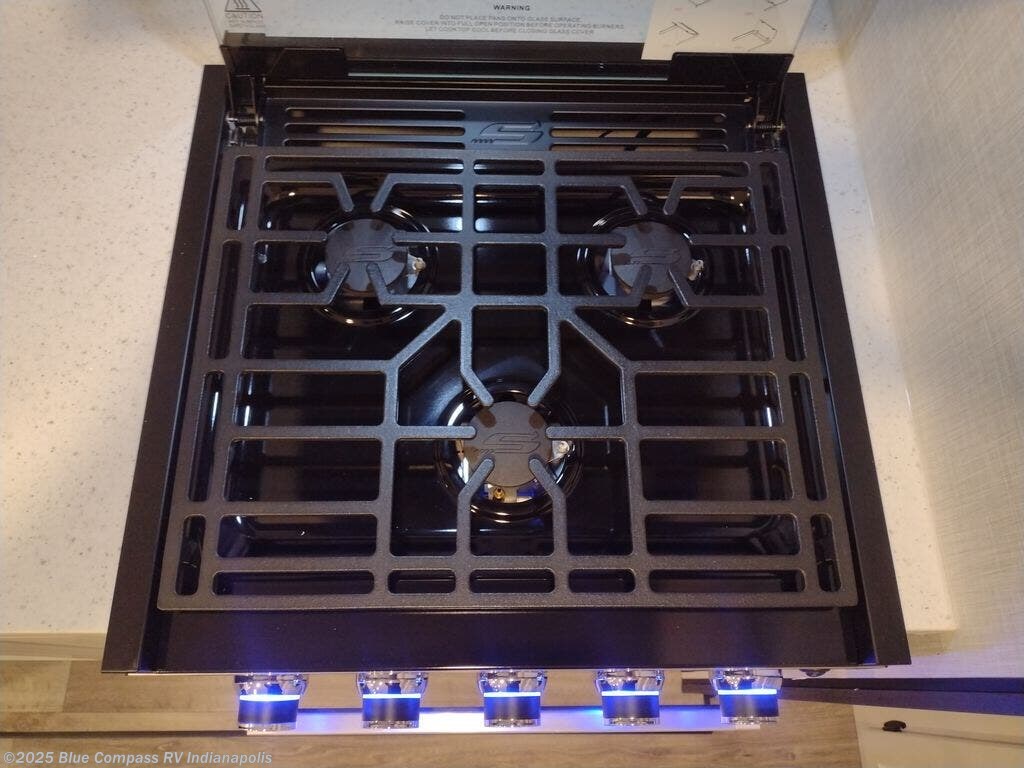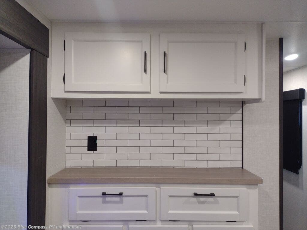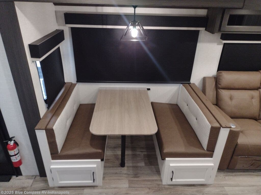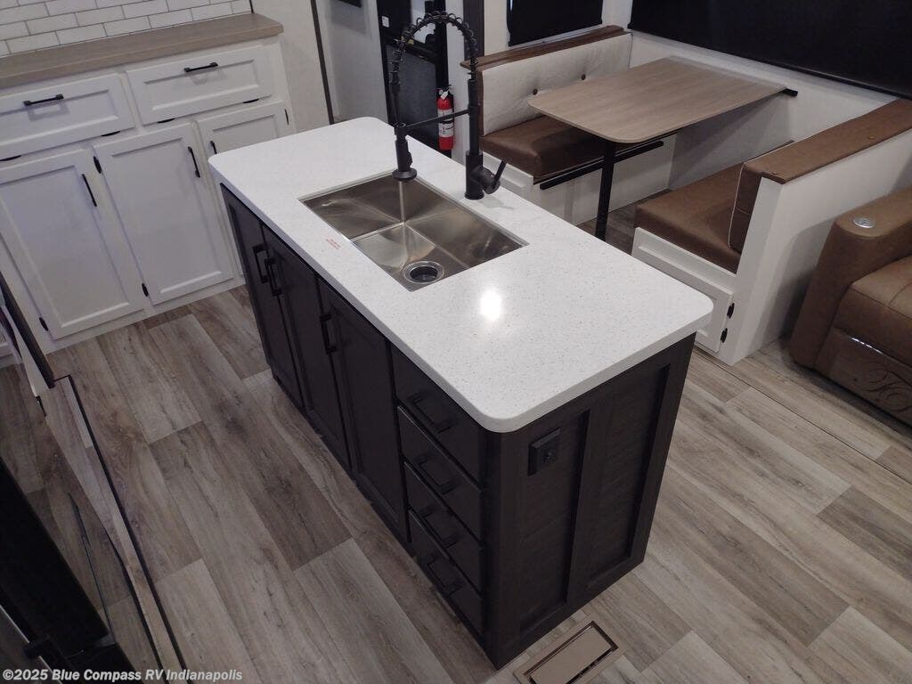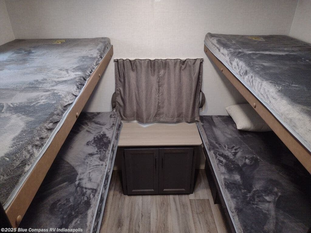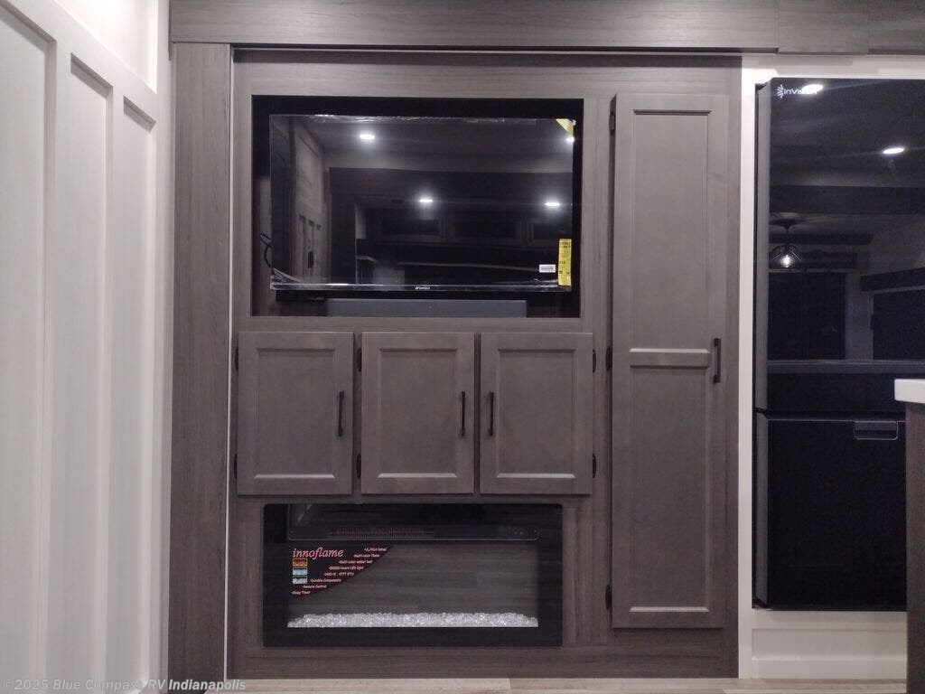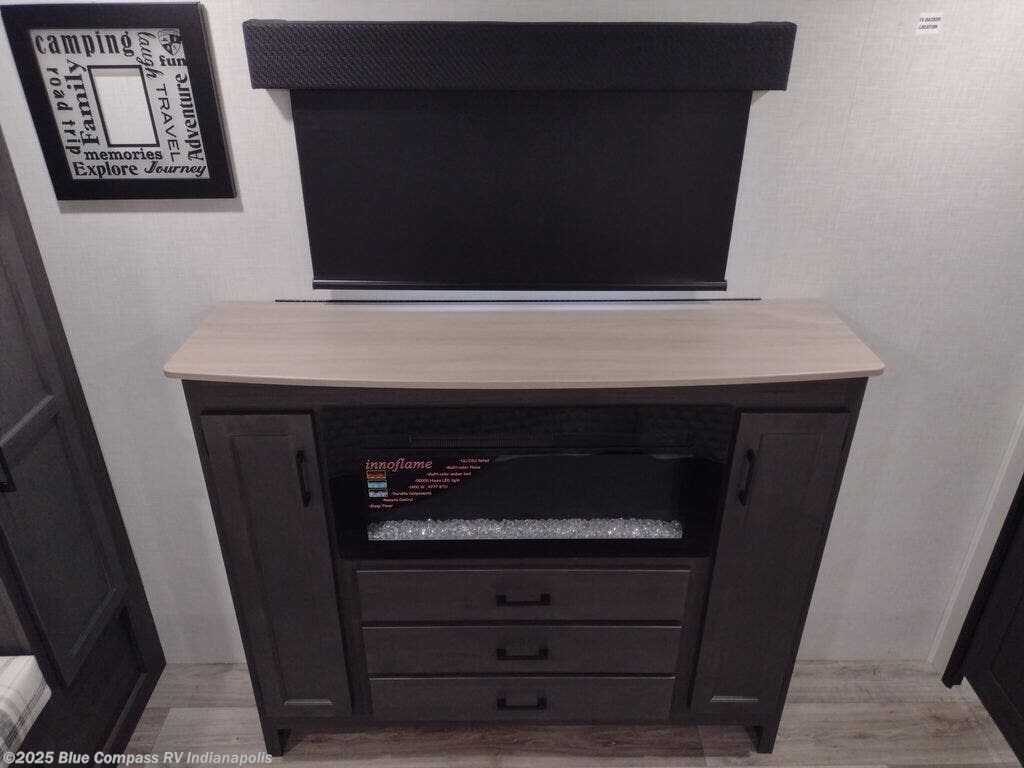 Versatility abounds in this travel trailer! The rear private bunkhouse has a set of 32" x 70" bunk beds and a set of 28" x 70" flip up bunk beds, but what is really special about this room is its ability to convert to a flex room with a desk, king bed, extra storage or a pet palace. The chef will enjoy having their choice of either cooking indoors with the kitchen island and three burner cooktop or cooking at the exterior campfire café with a refrigerator, a griddle, and a sink with countertop space. Relax each night in true comfort with a 70" tri-fold sofa across from the entertainment center with a 30" frameless fireplace, plus the front private bedroom has a 30" frameless fireplace across from a 60" x 80" queen bed slide. You can even transform the sofa and the Sit N' Slide table into extra sleeping spaces. The bedroom also has a window seat so you can look out at your beautiful scenery while reading a book and an interior wall wardrobe with washer and dryer prep!