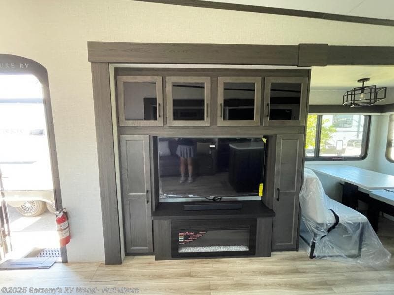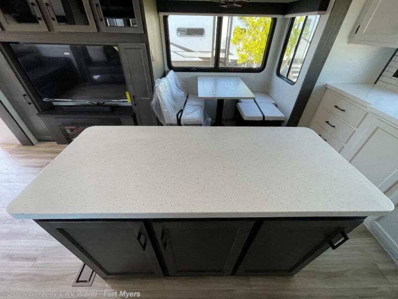 The chef will love cooking in the rear kitchen of this fifth wheel! The front private bedroom has a Serta king mattress to lay your head on at night, a window seat to comfortably read a book while enjoying the 5,000 BTU fireplace, a shelf storage closet, and a prepped area for a washer and dryer. Freshen up each morning with the 48" fiberglass shower with a seat in the full bathroom then head down the floating steps with shoe storage to whip up a delicious breakfast. The fully equipped kitchen even comes with a 18" GE stainless steel dishwasher at the rear sink with countertops on either side for easy clean up. Enjoy your meals at the table with two chairs and two Versa benches. You could even cook at the outside campfire cafe with the griddle. Inside the middle living area, you will find a tri-fold sofa with overhead cabinets and theater seating with USB charging across from the entertainment center with a 5,000 BTU fireplace!