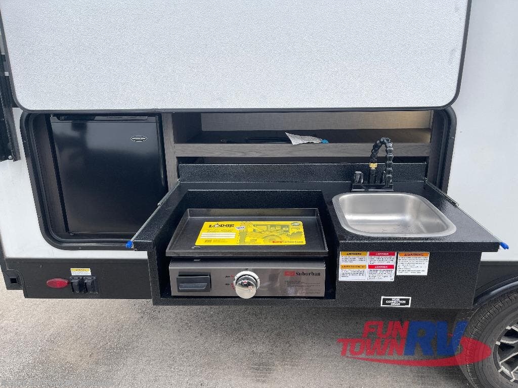 Sleep tight with your family on the road! This travel trailer is special for the whole family since it has plenty of space for sleep. First we have the 60" x 80" queen bed, the 51" x 75" double size bunk bed, and you can also sleep two people on the 88" x 48" U shaped dinette. Cook delicious dinner in the incredible kitchen. The L-shape counter includes stainless steel sink with cover and dish drying racks, three cooktop burner, refrigerator, pantry and an overhead cabinet. However, you can also have an amazing cooking time outside thanks to the outdoor kitchen, ideal to share a meal with your family while enjoying nature and its surroundings. Store your belongings in the dual wardrobes beside the bed and also in the pass thru storage. Finally, take a relaxing bath in the full bathroom furnished with a 30" x 36" shower.