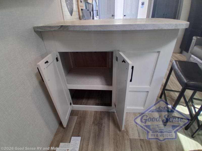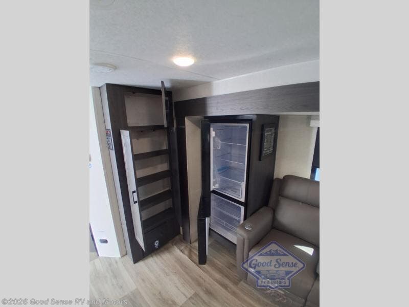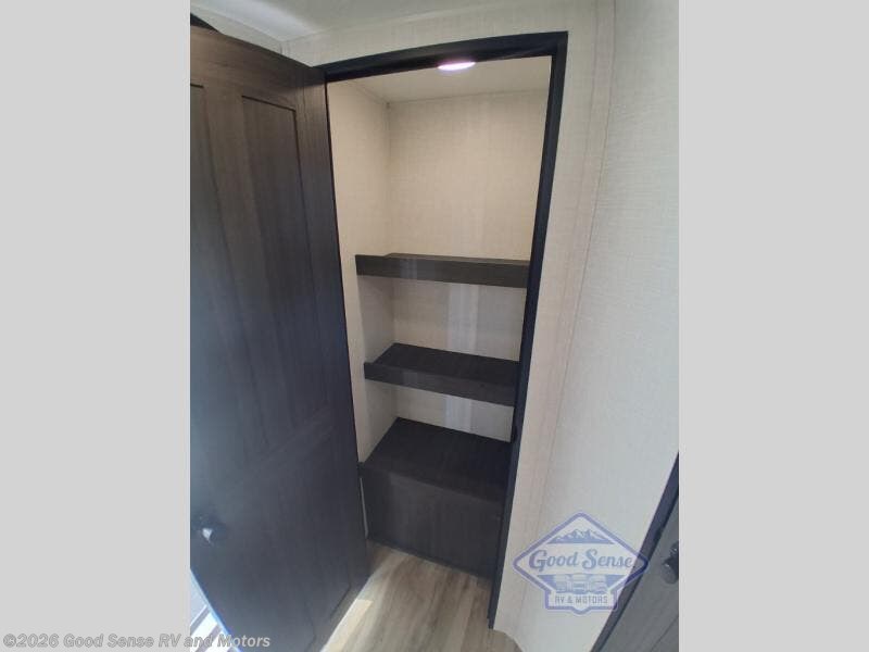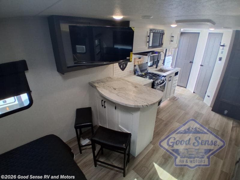 This travel trailer is perfect for two people who wish to escape the hustle and bustle of everyday life! You will enjoy a good night's rest on the sleep tight queen bed with shelves and wardrobes on either side to hang your clothes, and if you want an extra guest or two to tag along then you can transform the 88" x 42" U-shaped dinette into an extra sleeping space. Everyone will stay clean and refreshed with a rear corner bathroom that has a 34" radius shower. Grab your dry goods from the walk-in pantry, your perishables from the 10 cu. ft. refrigerator, and cook them all on the three burner cooktop. The bar top with two bar stools is the perfect place to enjoy your morning coffee and eggs!