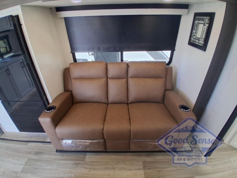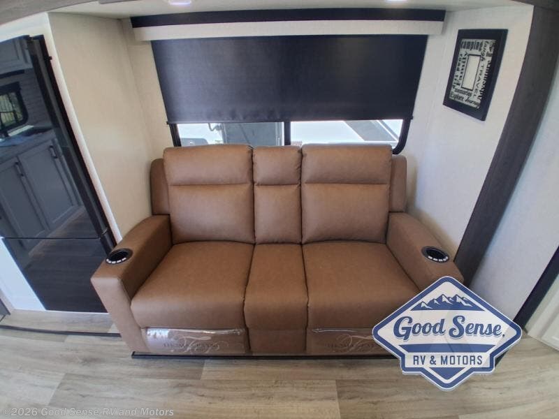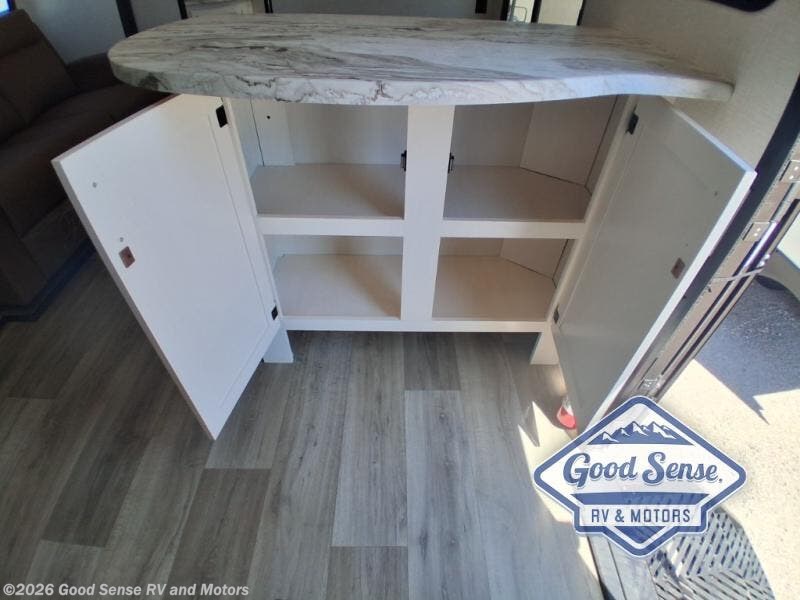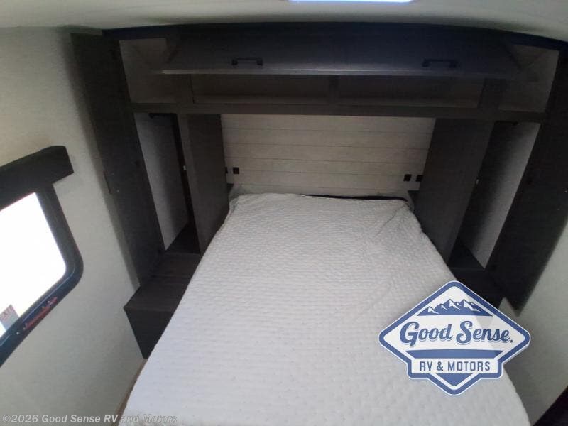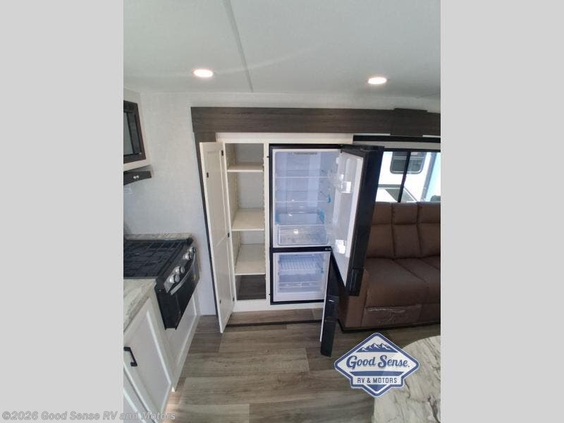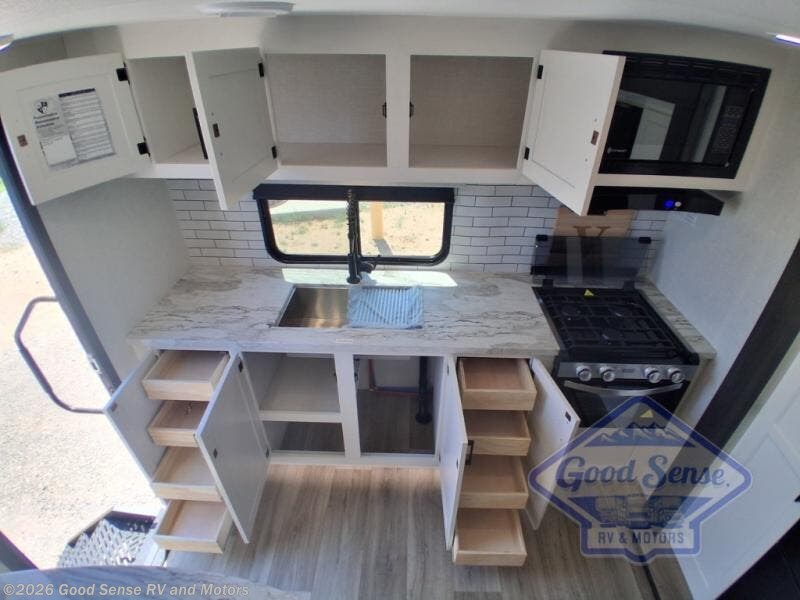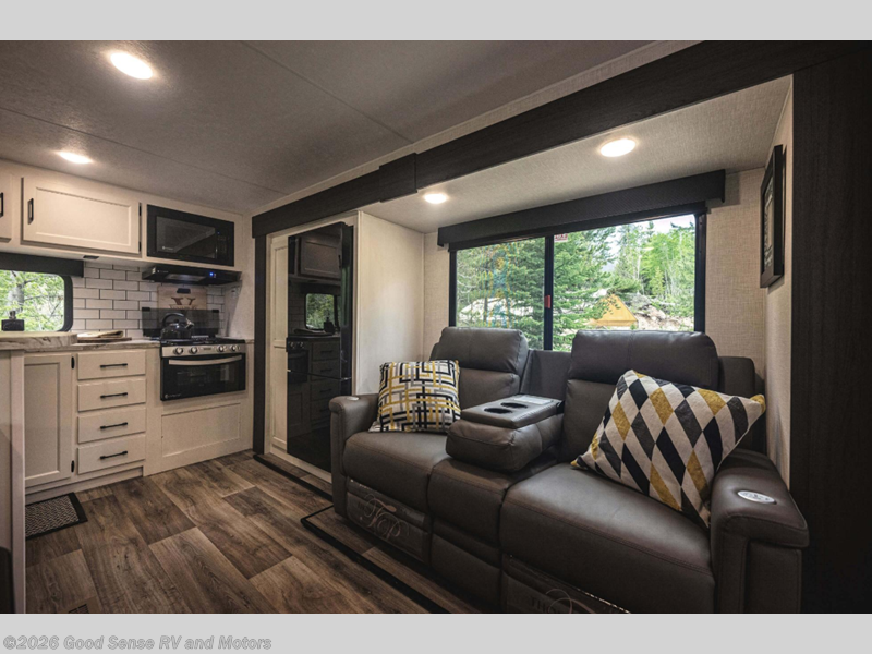 Sleep tight on the road! This travel trailer is special for four. First we have the 60" x 80" queen bed, and two people can easily fit on the sit n' slide dinette. Cook delicious dinner in the incredible kitchen. The counter includes a stainless steel sink with cover and dish drying racks, three cooktop burner, and an overhead cabinet. There is also a 10 cu. fridge and pantry for food storage. You can also have a relaxing time on the theater seating with USB port on each side. Store your belongings in the dual wardrobe beside the bed and also on the pass thru storage. Finally, take a relaxing bath in the walk thru bathroom furnished with a 30" x 36" shower.