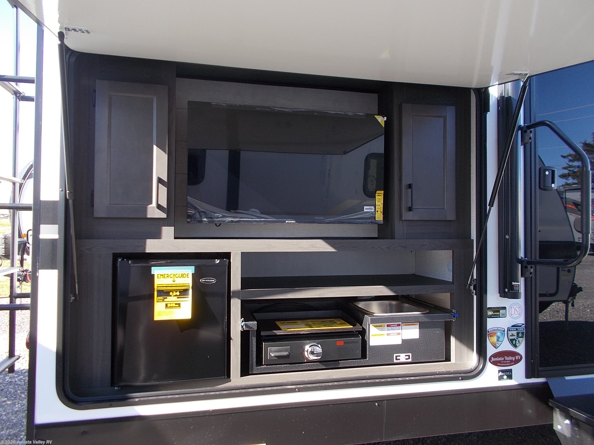 Black Tank Flush, Detachable, Detachable Power Cord, Enclosed Underbelly, External Shower, Fiberglass Sidewalls, Griddle, Hitch, Ladder, Outside Kitchen, Pass Thru Storage, Power Awning, Power Hitch Jack, Power Stabilizer Jacks, PVC Roof, Roof Vent, Screen Door, Second Roof A/C, Skylight, Slam Latch Baggage Doors, Slideout, Spare Tire Kit, Stabilizer Jacks, Tinted Windows -