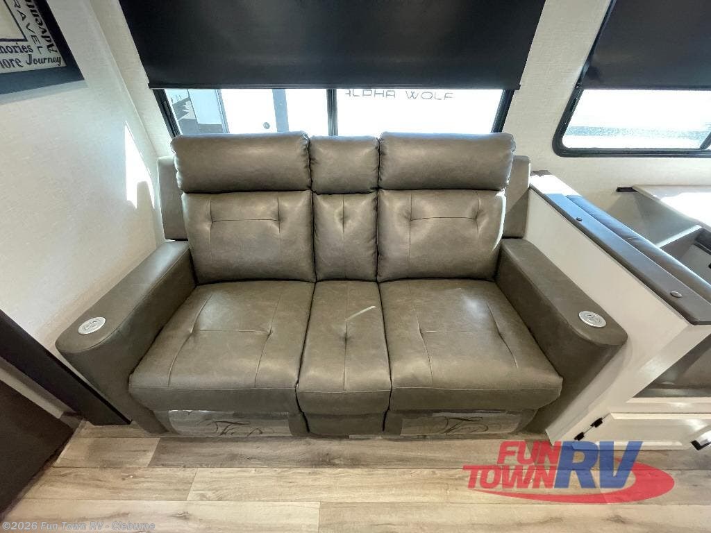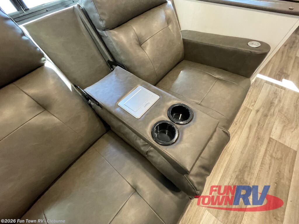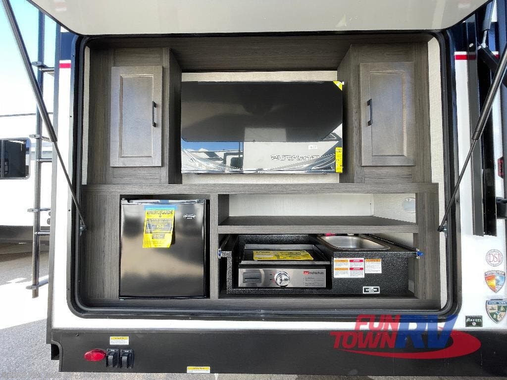 You're going to feel right at home in this Stratus single slide unit! There is not only a fully equipped kitchen with a three burner cooktop, but also an outside campfire café with a griddle, refrigerator, sink, and even an exterior 40" TV for your entertainment. As you enter the unit, you will notice to the right a walk-in pantry with coat hooks, and to the left is the full rear bathroom with a 30" x 36" shower, a three door linen closet, and a cabinet prepped to add an optional washer and dryer. If mother nature rains on your parade then relax inside on either the 70" sofa or the sit n' slide table dinette across from the entertainment center.