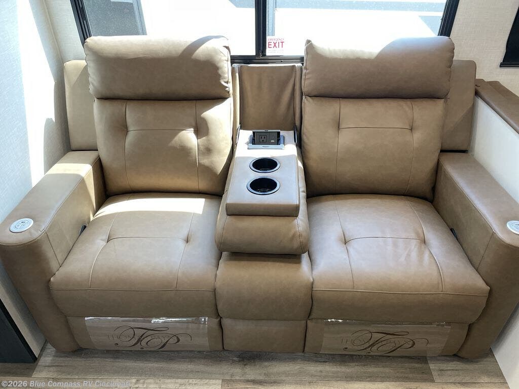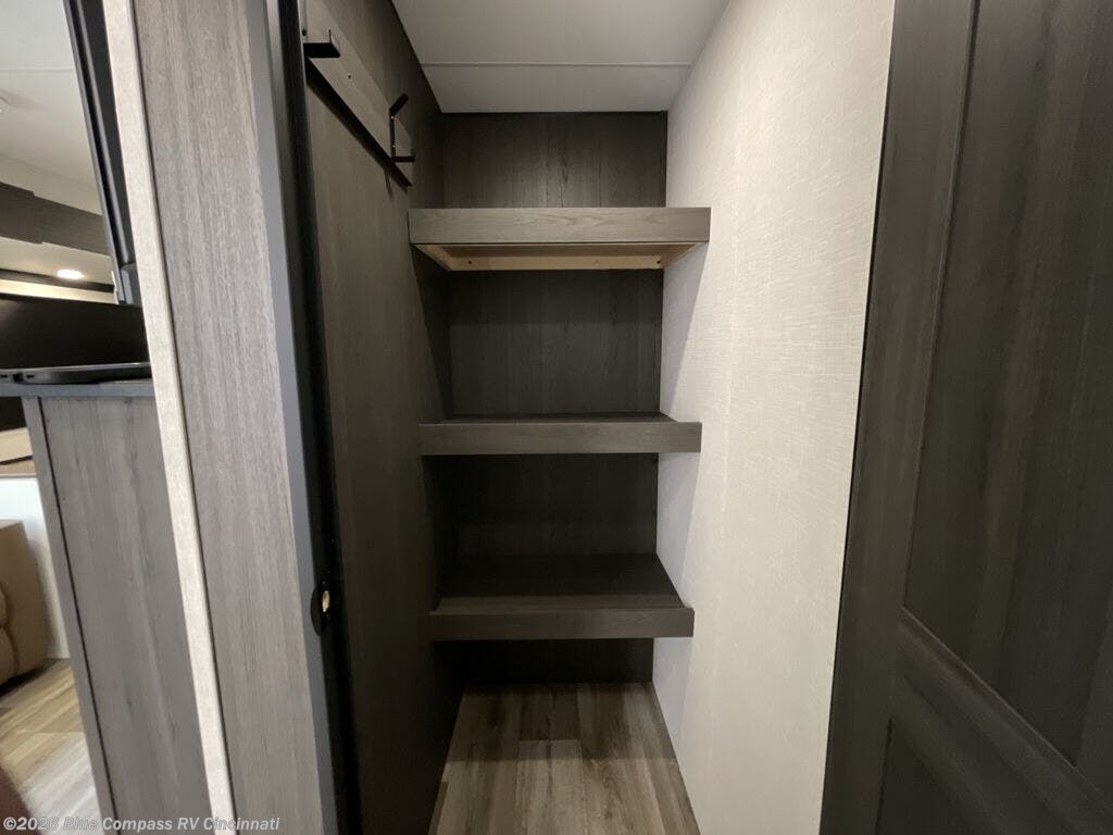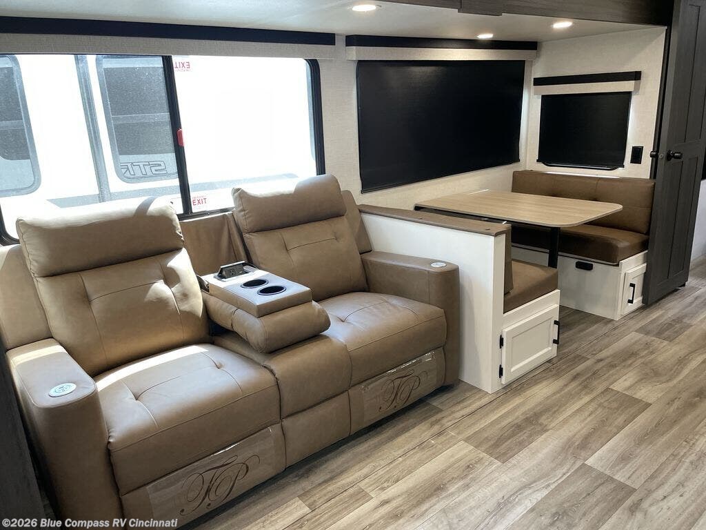 You're going to feel right at home in this Stratus single slide unit! There is not only a fully equipped kitchen with a three burner cooktop, but also an outside campfire café with a griddle, refrigerator, sink, and even an exterior 40" TV for your entertainment. As you enter the unit, you will notice to the right a walk-in pantry with coat hooks, and to the left is the full rear bathroom with a 30" x 36" shower, a three door linen closet, and a cabinet prepped to add an optional washer and dryer. If mother nature rains on your parade then relax inside on either the 70" sofa or the sit n' slide table dinette across from the entertainment center.