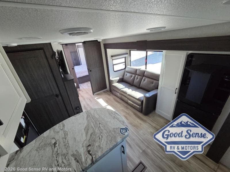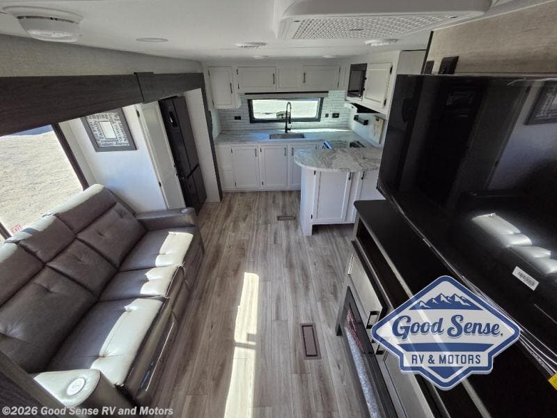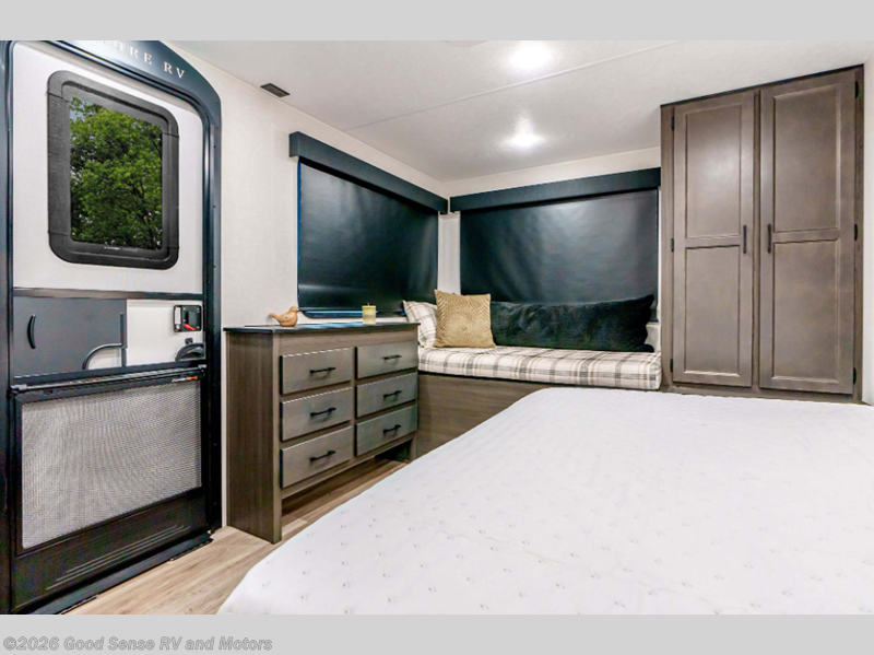 This travel trailer is special for two. Sleep tight in the bedroom on the 60" x 80" queen bed also, store your belongings inside the dresser, and closet, this last one has a bench with sit for added comfort plus, delight yourself with the astonishing panoramic view window. Cook delicious dinner in the incredible spacious front kitchen. It includes stainless steel sink with cover and dish drying racks, three cooktop burner, refrigerator, pantry, bar with stools and an over head cabinet. In addition, experience a fun moment in the living room thanks to the 40" TV, theater sitting with USB ports on each side of it and fireplace for full coziness. Finally, take a relaxing bath in the walk thru bathroom furnished with a 30" x 36" shower.