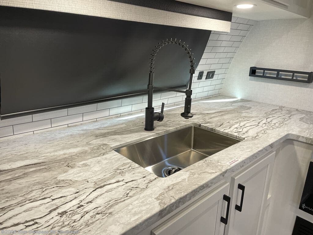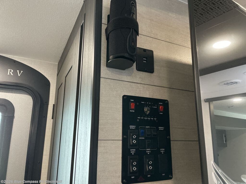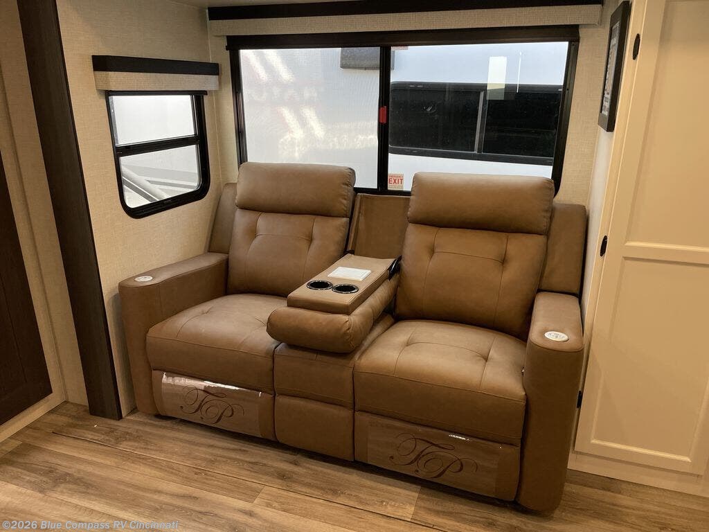 This travel trailer is special for two. Sleep tight in the bedroom on the 60" x 80" queen bed also, store your belongings inside the dresser, and closet, this last one has a bench seat for added comfort plus, delight yourself with the astonishing panoramic view window. Cook delicious dinner in the incredible spacious front kitchen. It includes a stainless steel sink with cover and dish drying racks, three cooktop burners, refrigerator, pantry, bar with stools and overhead cabinets. In addition, experience a fun moment in the living room thanks to the 40" TV, theater seating with USB ports on each side and a fireplace for full coziness. Finally, take a relaxing bath in the walk thru bathroom featuring a 30" x 36" shower for your comfort.