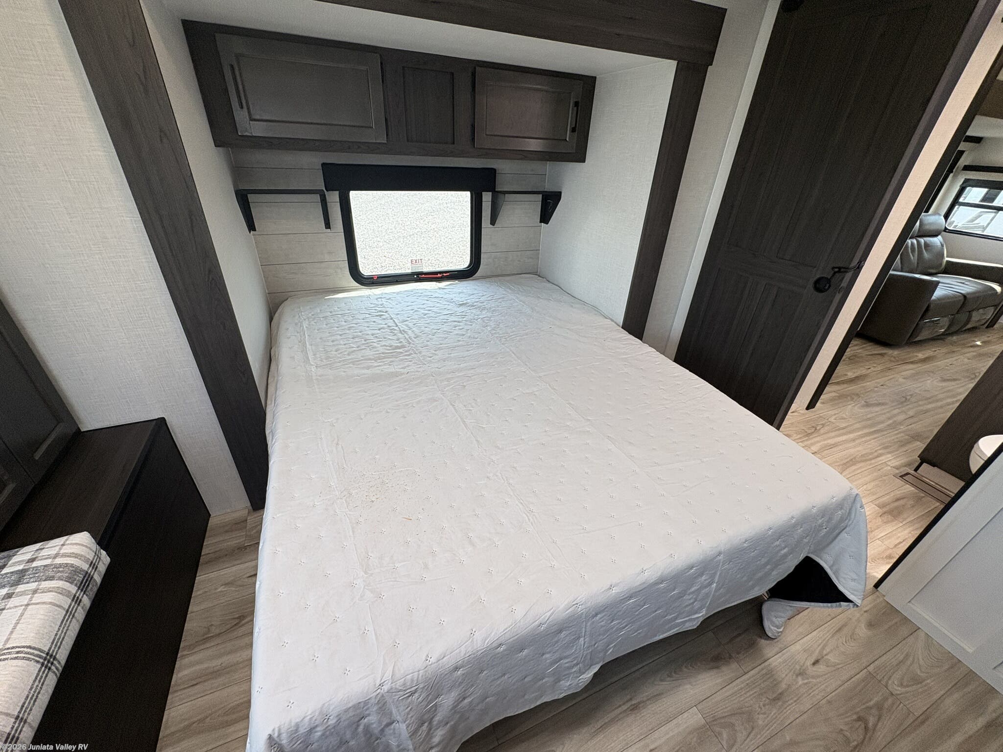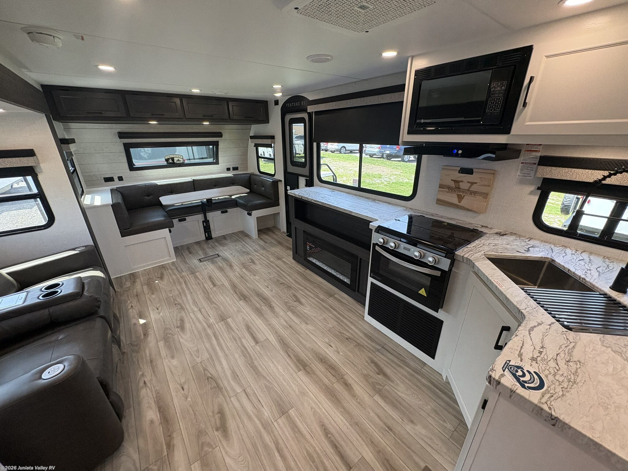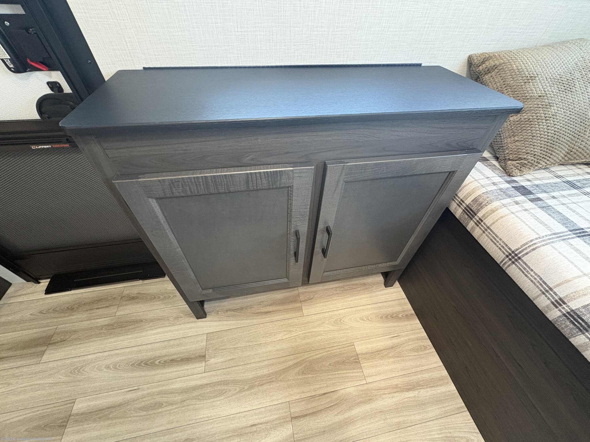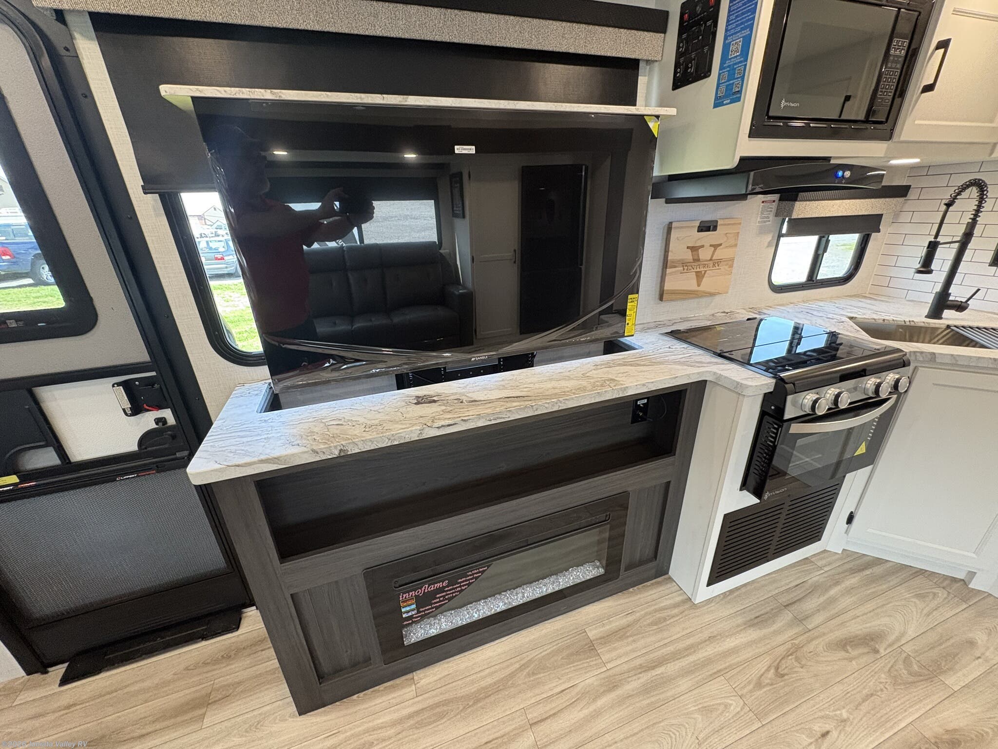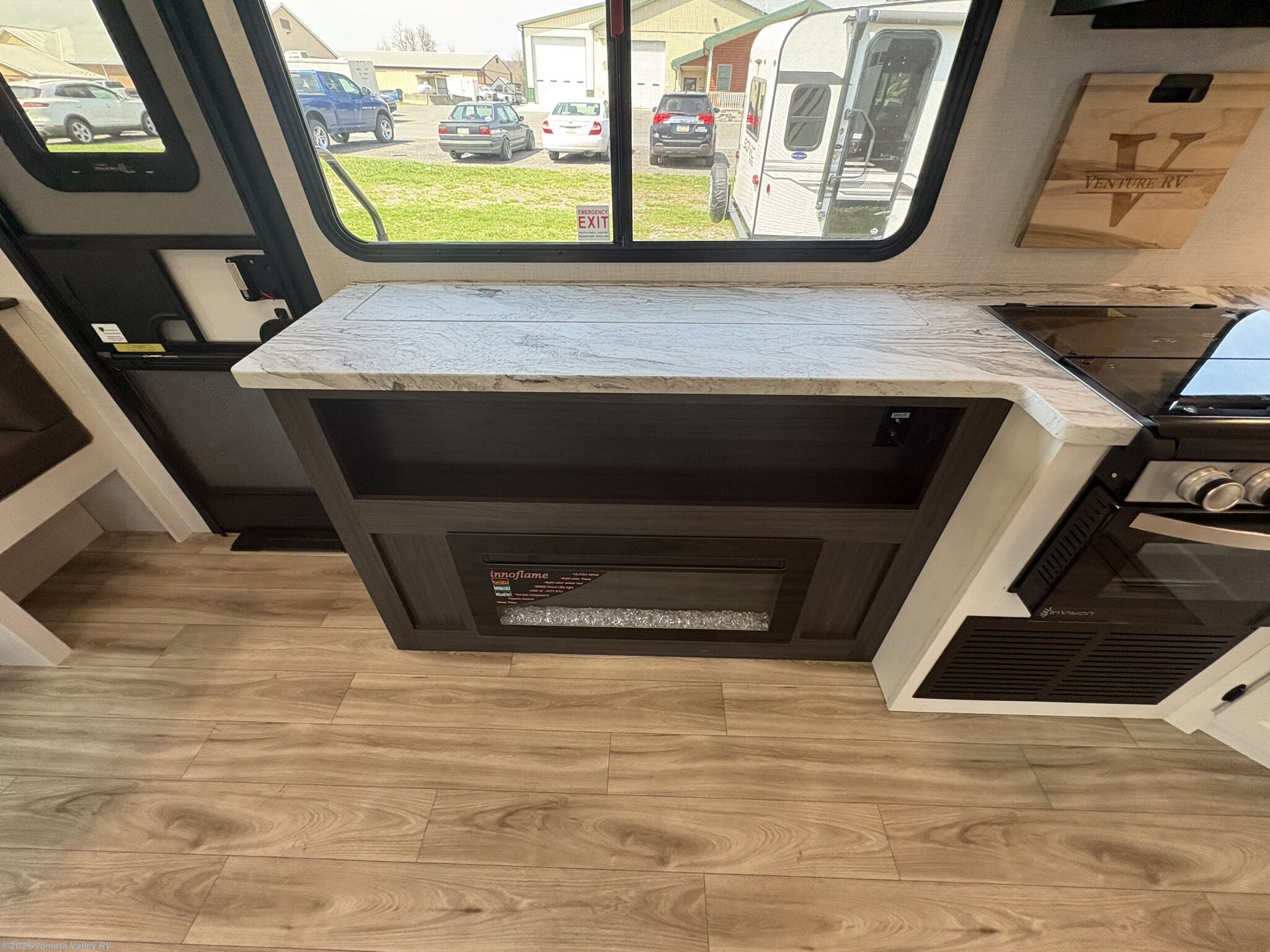 The SR282VFD floorplan emphasizes comfort, versatility, and convenience. Inside you’ll find a thoughtful layout with a rear bedroom, a front living area, and a mid-kitchen that keeps cooking and conversation central. The design accommodates up to three sleepers and includes bunk beds for flexible sleeping arrangements, a U-shaped dinette, theater seating, and a cozy fireplace for relaxing evenings. A Queen-sized bed provides a peaceful retreat, while day/night shades and overhead cabinetry enhance the homey feel. Practical touches like a pantry, medicine cabinet, and pass-through storage help keep your RV organized on the road.