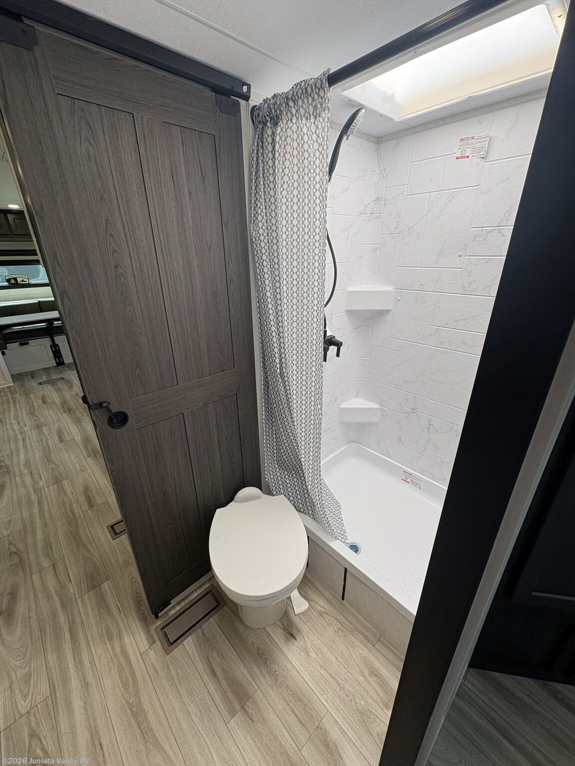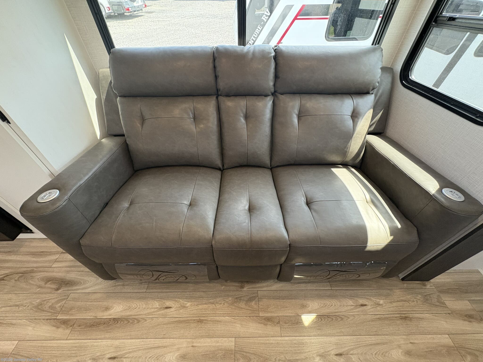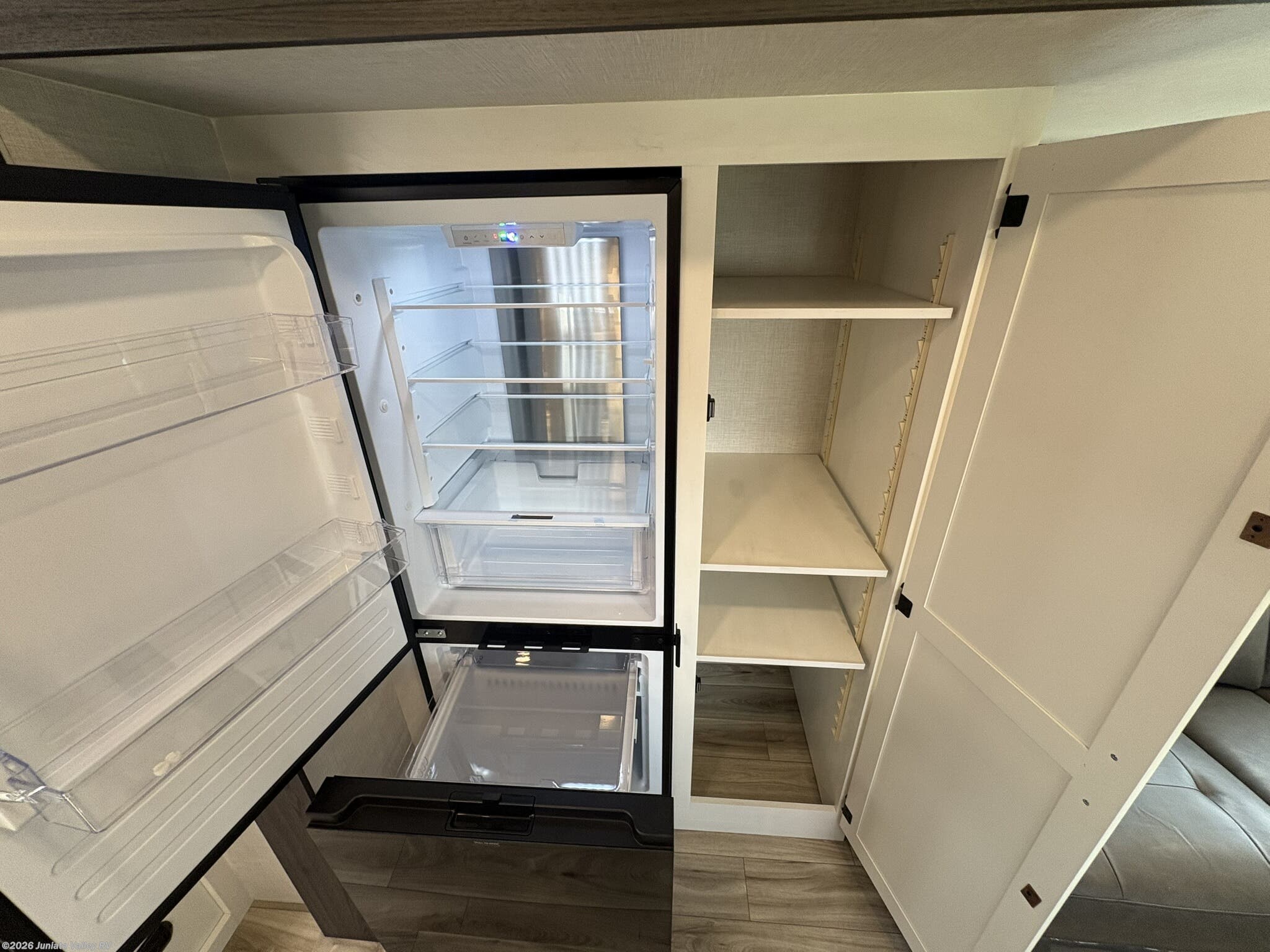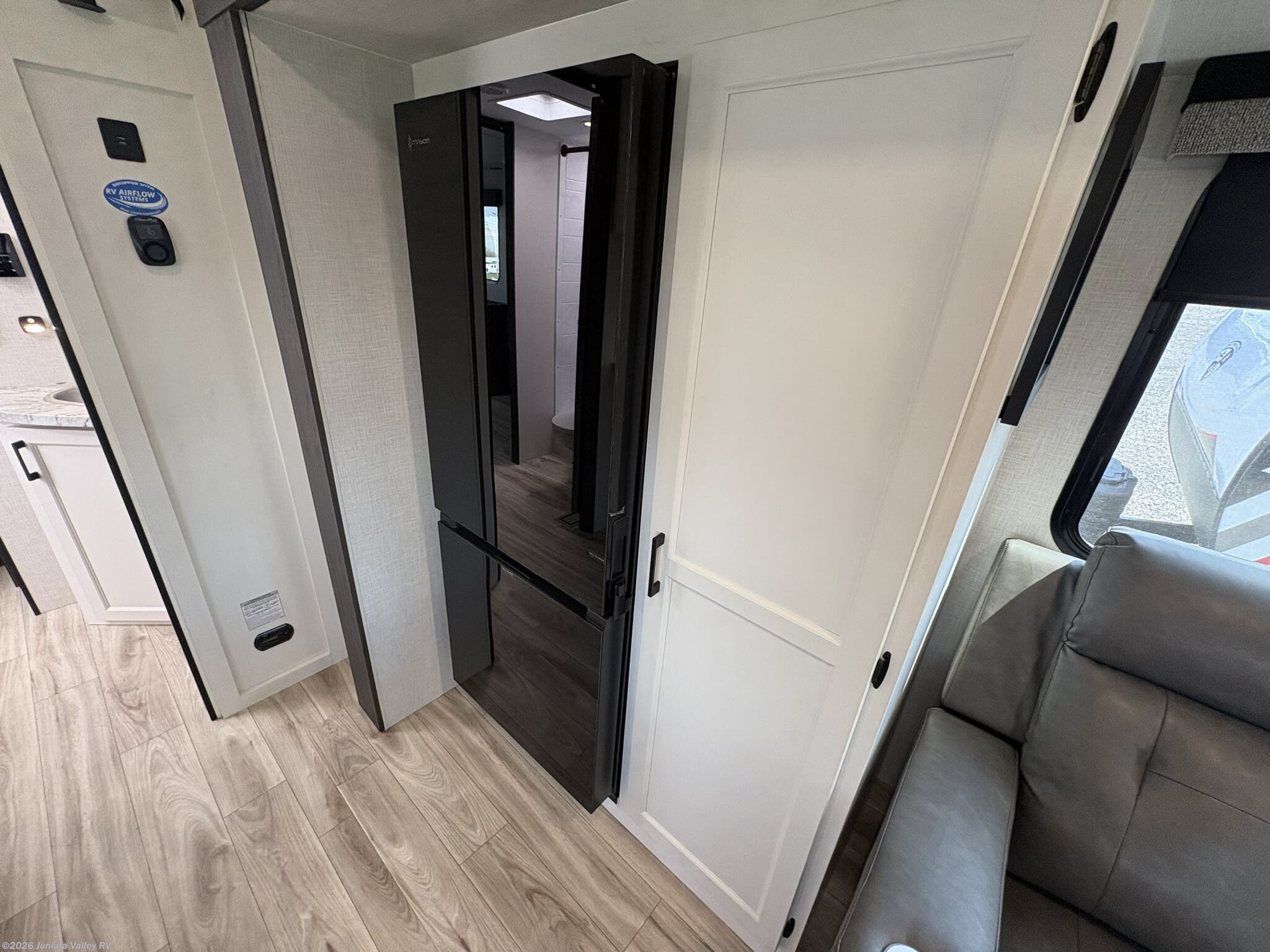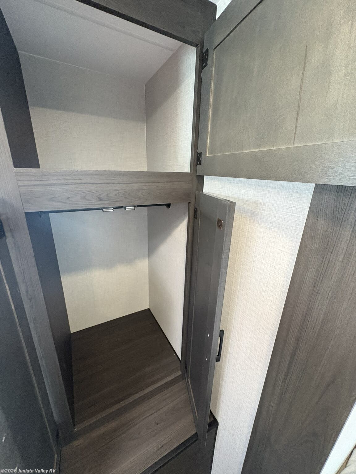 The SR282VFD floorplan emphasizes comfort, versatility, and convenience. Inside you’ll find a thoughtful layout with a rear bedroom, a front living area, and a mid-kitchen that keeps cooking and conversation central. The design accommodates up to three sleepers and includes bunk beds for flexible sleeping arrangements, a U-shaped dinette, theater seating, and a cozy fireplace for relaxing evenings. A Queen-sized bed provides a peaceful retreat, while day/night shades and overhead cabinetry enhance the homey feel. Practical touches like a pantry, medicine cabinet, and pass-through storage help keep your RV organized on the road.