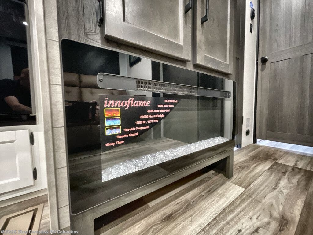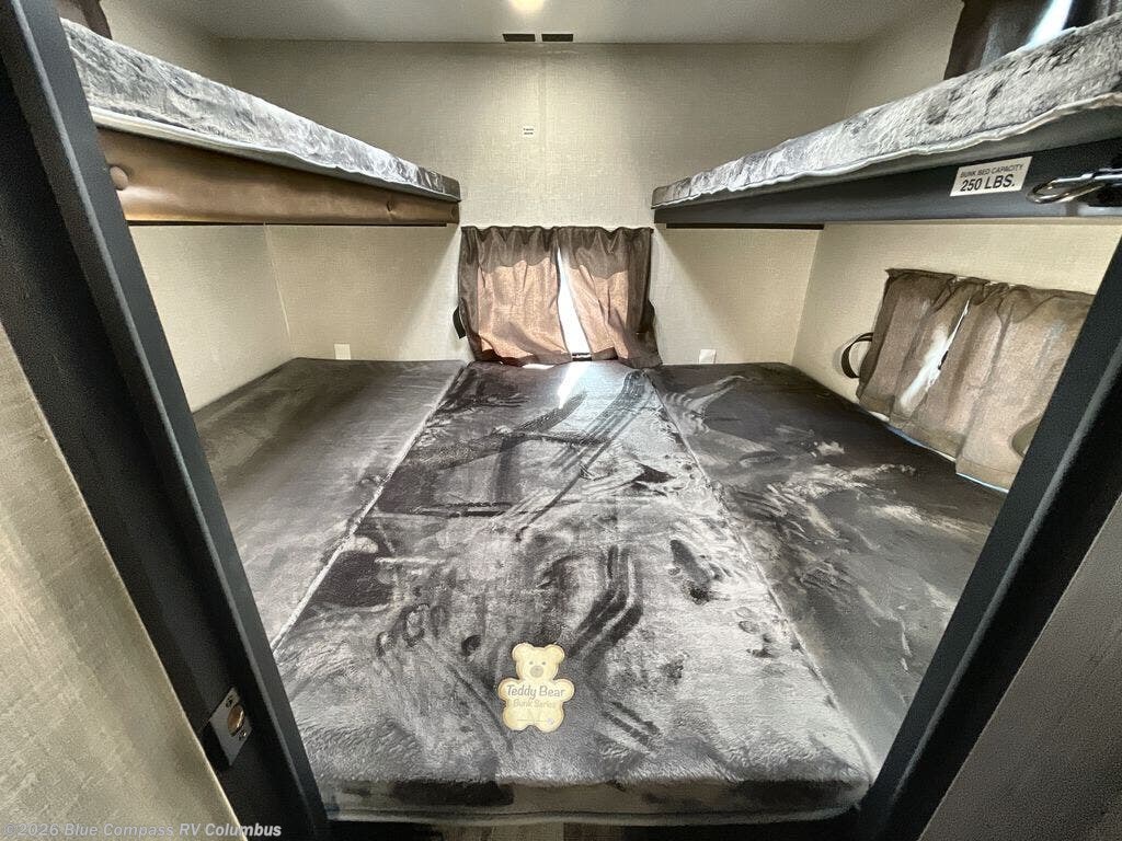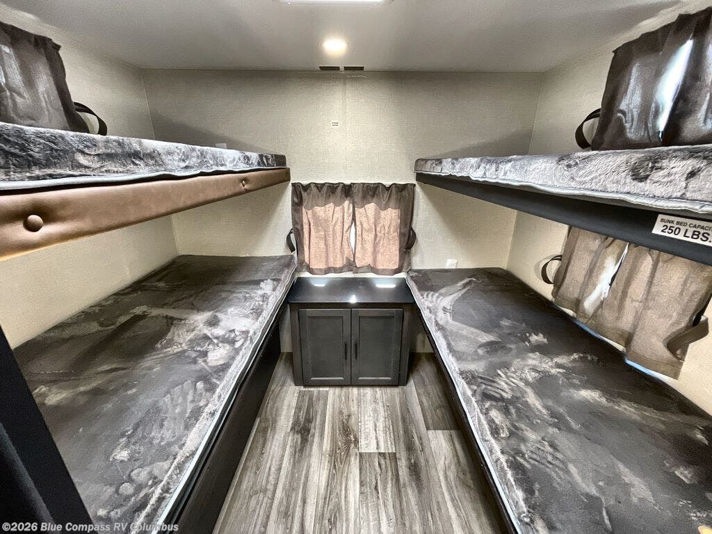 You, your kids and/or friends, and your pets can all have a relaxing camping trip in this travel trailer! The unique rear private bunkhouse has a set of 32" x 70" bunk beds, and a set of 28" x 70" bunks where the top bunk flips up, and its ability to convert into a desk, king bed, storage, or a pet palace. Just outside the bunkhouse is a full bathroom with a 30" x 36" shower to freshen up in each morning. Everyone can gather together at the 70" sofa and 42" booth dinette while watching a movie and enjoying the fireplace at the entertainment center. The front private bedroom has sliding doors to shut when you're ready to sleep on the sleep tight queen bed. Prepare your meals either indoors with the three burner cooktop or at the outside campfire café with the griddle, refrigerator, and sink!