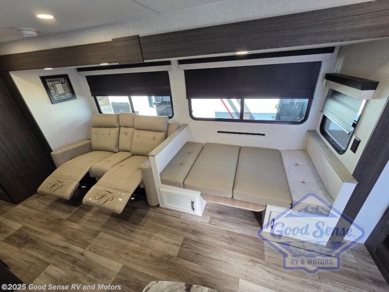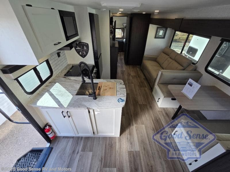 You, your kids and/or friends, and your pets can all have a relaxing camping trip in this travel trailer! The unique rear private bunkhouse has a set of 32" x 70" bunk beds, and a set of 28" x 70" bunks where the top bunk flips up, and its ability to convert into a desk, king bed, storage, or a pet palace. Just outside the bunkhouse is a full bathroom with a 30" x 36" shower to freshen up in each morning. Everyone can gather together at the 70" sofa and 42" booth dinette while watching a movie and enjoying the fireplace at the entertainment center. The front private bedroom has sliding doors to shut when you're ready to sleep on the sleep tight queen bed. Prepare your meals either indoors with the three burner cooktop or at the outside campfire café with the griddle, refrigerator, and sink!