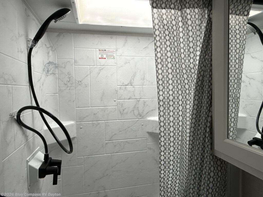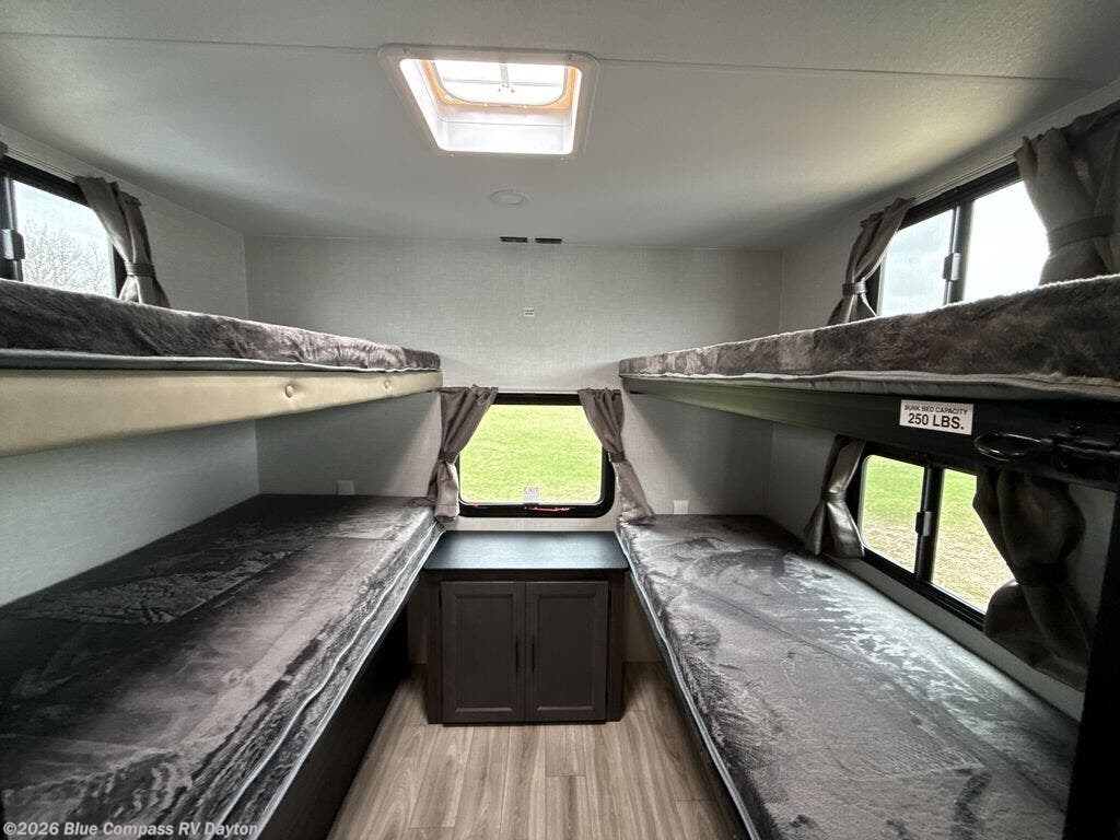 You, your kids and/or friends, and your pets can all have a relaxing camping trip in this travel trailer! The unique rear private bunkhouse has a set of 32" x 70" bunk beds, and a set of 28" x 70" bunks where the top bunk flips up, and its ability to convert into a desk, king bed, storage, or a pet palace. Just outside the bunkhouse is a full bathroom with a 30" x 36" shower to freshen up in each morning. Everyone can gather together at the 70" sofa and sit n' slide table dinette while watching a movie and enjoying the fireplace at the entertainment center. The front private bedroom has sliding doors to shut when you're ready to rest on the sleep tight queen bed. Prepare your meals either indoors with the three-burner cooktop or at the outside campfire café with the griddle, refrigerator, and sink!