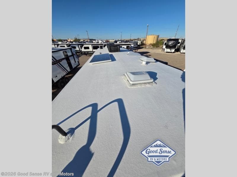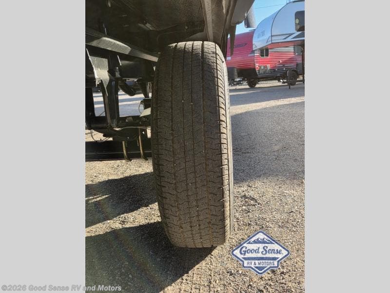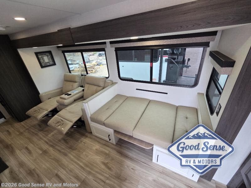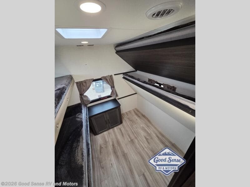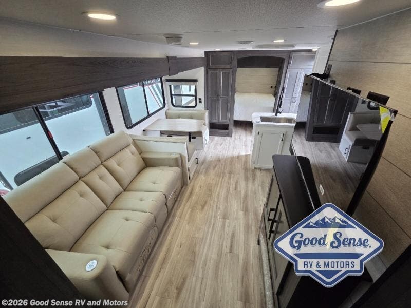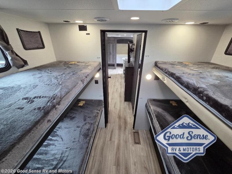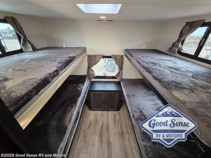 You, your kids and/or friends, and your pets can all have a relaxing camping trip in this travel trailer! The unique rear private bunkhouse has a set of 32" x 70" bunk beds, and a set of 28" x 70" bunks where the top bunk flips up, and its ability to convert into a desk, king bed, storage, or a pet palace. Just outside the bunkhouse is a full bathroom with a 30" x 36" shower to freshen up in each morning. Everyone can gather together at the 70" sofa and sit n' slide table dinette while watching a movie and enjoying the fireplace at the entertainment center. The front private bedroom has sliding doors to shut when you're ready to rest on the sleep tight queen bed. Prepare your meals either indoors with the three-burner cooktop or at the outside campfire café with the griddle, refrigerator, and sink!