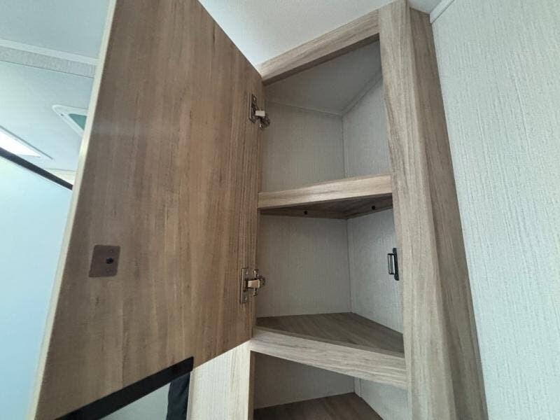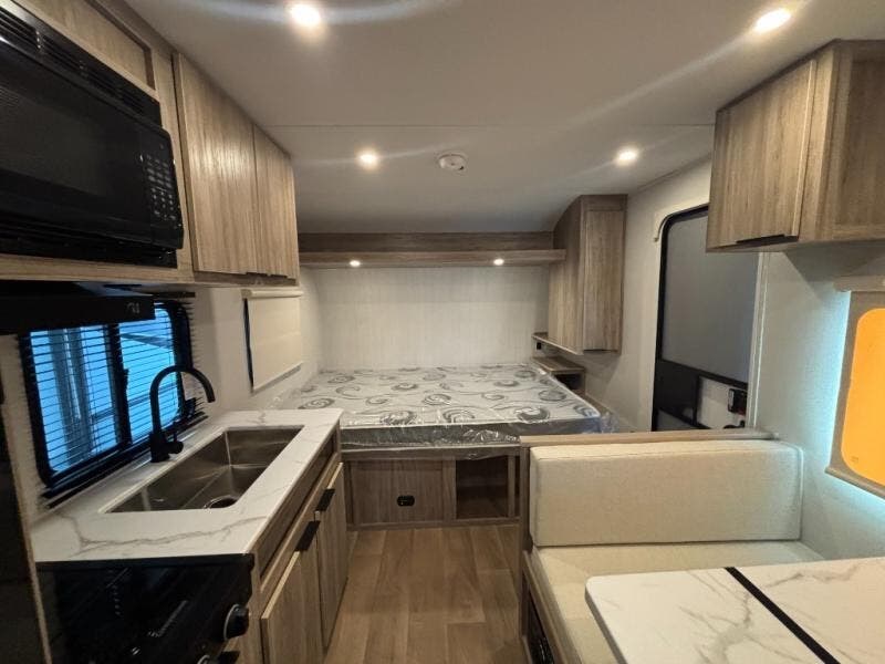 This travel trailer is designed to make camping more comfortable, affordable, and fun for the whole family! The front 60" x 80" queen bed offers a comfortable place to lay your head at night and a shirt closet to hang your clothes. There are a set of 48" x 68" bunk beds for others to sleep, and you can even transform the 38" x 68" booth dinette into extra sleeping space. The fully equipped kitchen has everything you need to prepare a delicious home cooked meal and a 12V refrigerator to store any leftovers. After a fun-filled day, head to the rear corner bathroom to freshen up in the 30" x 36" shower with a skylight to let in some natural lighting!
