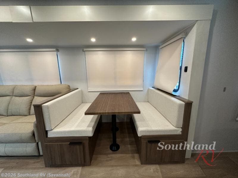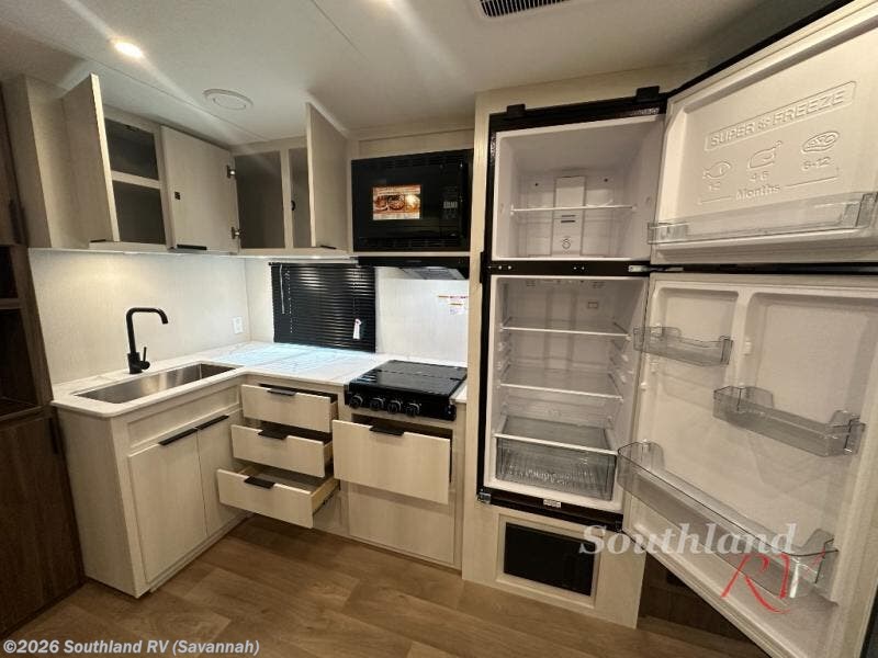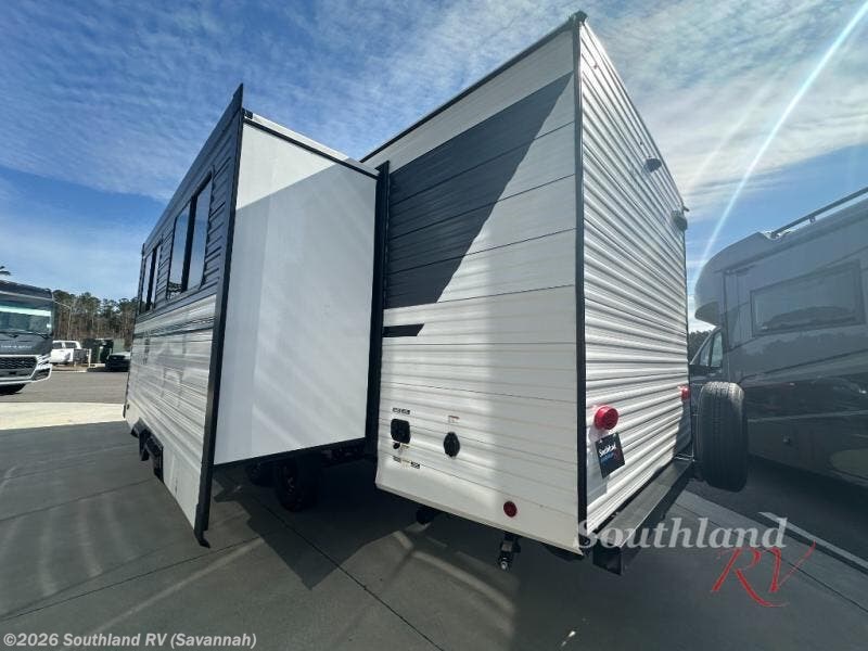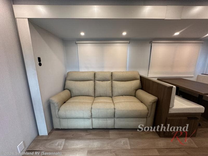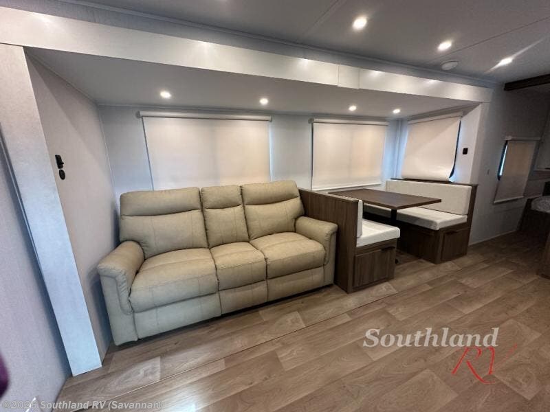You'll feel right at home when you camp in this travel trailer! The large slide out gives you plenty of space to relax on the theater seating, play games at the booth dinette, and cook in the full kitchen. An adult or two little ones can sleep on the booth dinette at night, and if you're needing additional sleeping space, just choose the optional tri-fold sofa in place of the theater seating. You'll appreciate having the front private bedroom all to yourselves, complete with an Olympic queen bed, dual bedside wardrobes, and underbed storage. And don't overlook the full bath conveniently tucked in the back of the unit for added privacy!