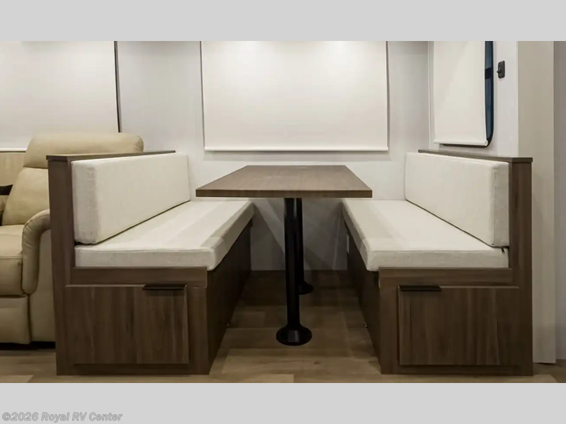 You'll feel right at home when you camp in this travel trailer! The large slide out gives you plenty of space to relax on the theater seating, play games at the booth dinette, and cook in the full kitchen. An adult or two little ones can sleep on the booth dinette at night, and if you're needing additional sleeping space, just choose the optional tri-fold sofa in place of the theater seating. You'll appreciate having the front private bedroom all to yourselves, complete with an Olympic queen bed, dual bedside wardrobes, and underbed storage. And don't overlook the full bath conveniently tucked in the back of the unit for added privacy!