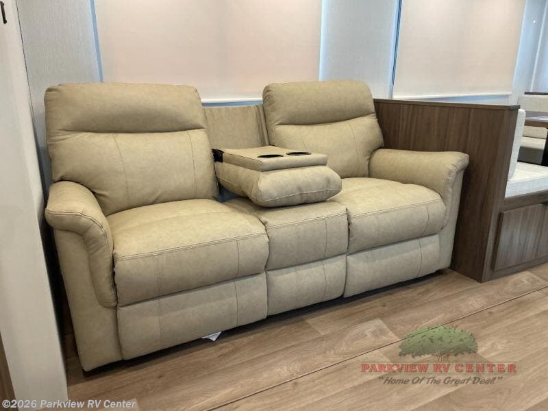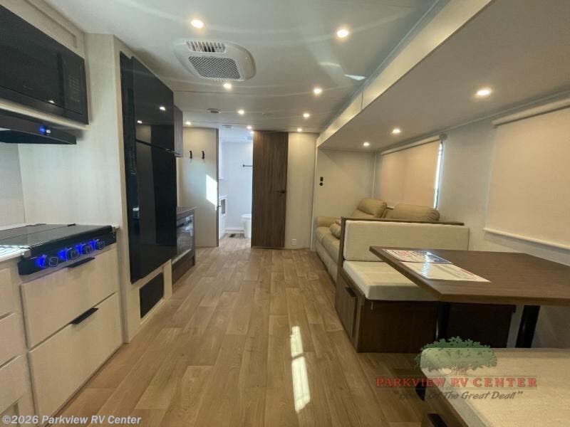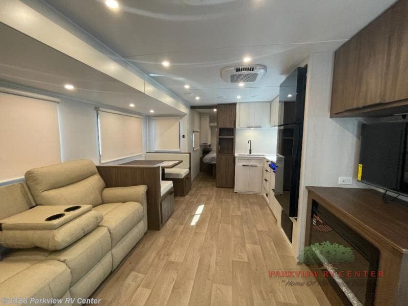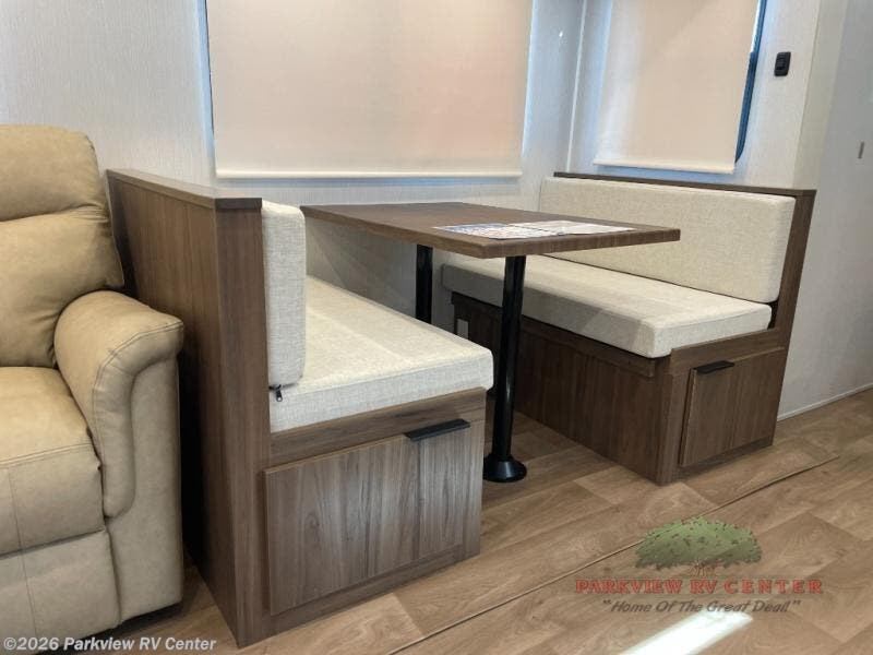 You'll feel right at home when you camp in this travel trailer! The large slide out gives you plenty of space to relax on the theater seating, play games at the booth dinette, and cook in the full kitchen. An adult or two little ones can sleep on the booth dinette at night, and if you're needing additional sleeping space, just choose the optional tri-fold sofa in place of the theater seating. You'll appreciate having the front private bedroom all to yourselves, complete with an Olympic queen bed, dual bedside wardrobes, and underbed storage. And don't overlook the full bath conveniently tucked in the back of the unit for added privacy!