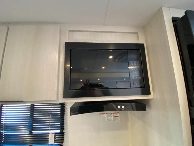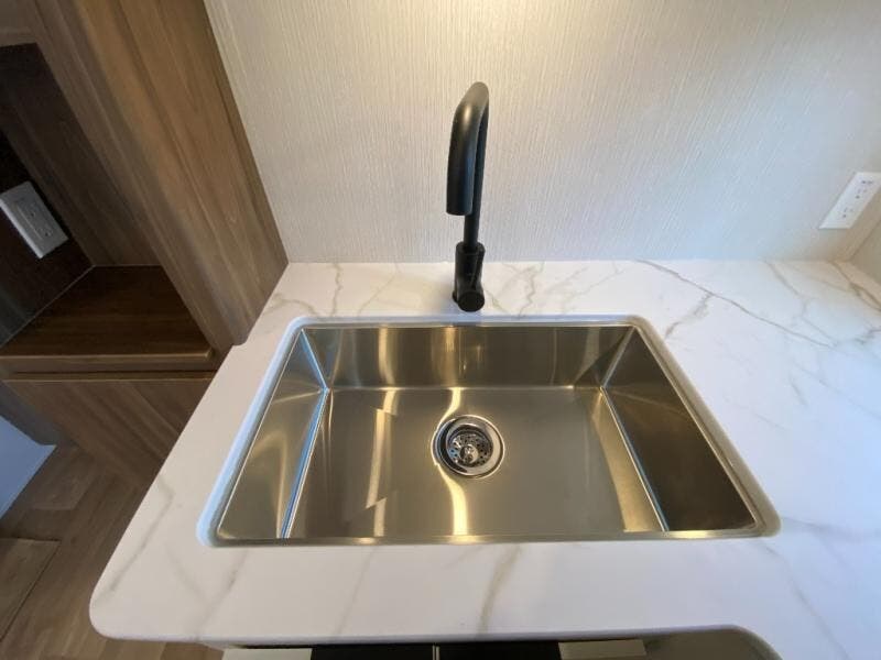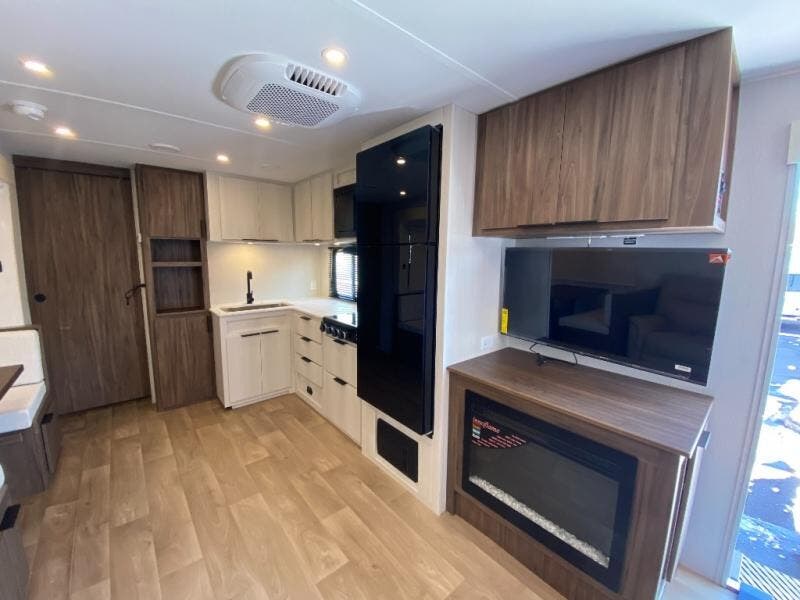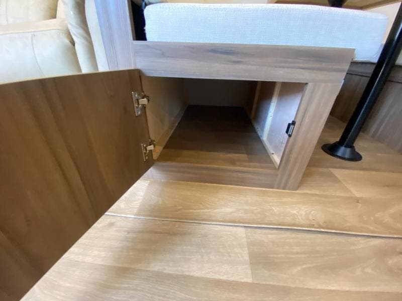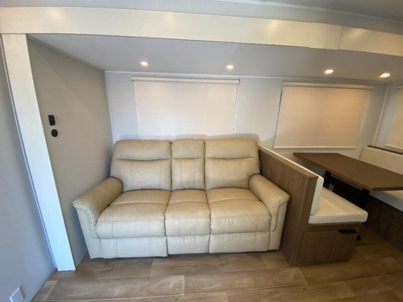 You'll feel right at home when you camp in this travel trailer! The large slide out gives you plenty of space to relax on the theater seating, play games at the booth dinette, and cook in the full kitchen. An adult or two little ones can sleep on the booth dinette at night, and if you're needing additional sleeping space, just choose the optional tri-fold sofa in place of the theater seating. You'll appreciate having the front private bedroom all to yourselves, complete with an Olympic queen bed, dual bedside wardrobes, and underbed storage. And don't overlook the full bath conveniently tucked in the back of the unit for added privacy!