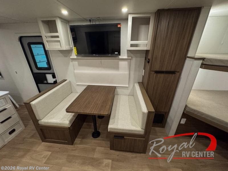 Weekend trips to the campground are made easy in this spacious travel trailer for eight! There is a front private bedroom with a space saving sliding door, a 66" x 80" queen bed, and dual wardrobes to keep your things tidy. The bunks in the back will provide compact sleeping space for guests, and there is a tri-fold sofa slide out and a booth dinette in the combined kitchen and living area for even more accommodations. A wardrobe/pantry is found beside the booth dinette to keep snacks stocked, and an optional TV can be added if you want to enjoy movie nights! The chef of your group is sure to appreciate the flip-up counter for more prep space, along with all the appliances needed to create their best meals.