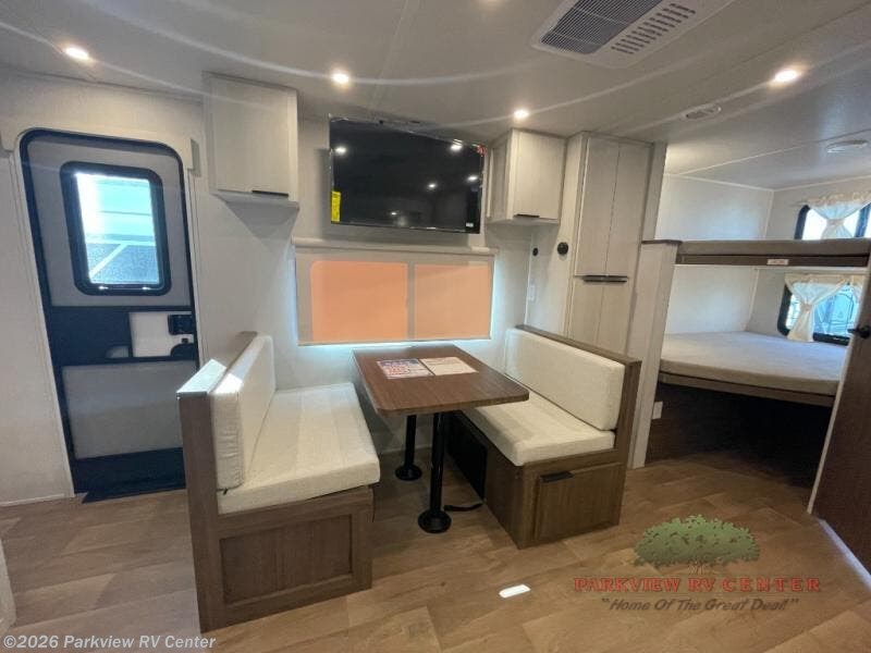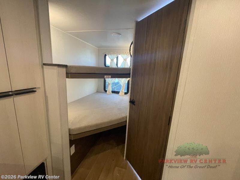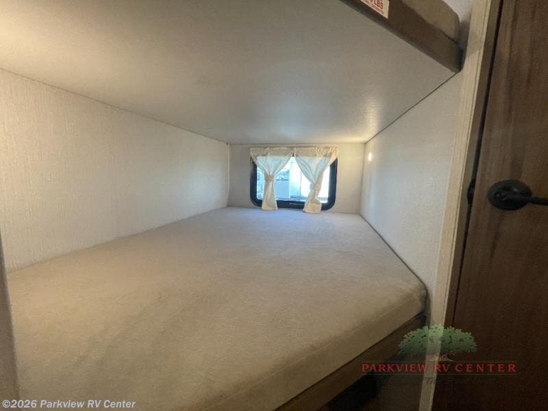 Weekend trips to the campground are made easy in this spacious travel trailer for eight! There is a front private bedroom with a space saving sliding door, a 66" x 80" Olympic queen bed, and dual wardrobes to keep your things tidy. The bunks in the back will provide compact sleeping space for guests, and there is a tri-fold sofa slide out and a booth dinette in the combined kitchen and living area for even more accommodations. A storage cabinet is found beside the booth dinette to keep snacks stocked, and a TV will let you enjoy movie nights! The chef of your group is sure to appreciate the flip-up counter for more prep space, along with all the appliances needed to create their best meals.