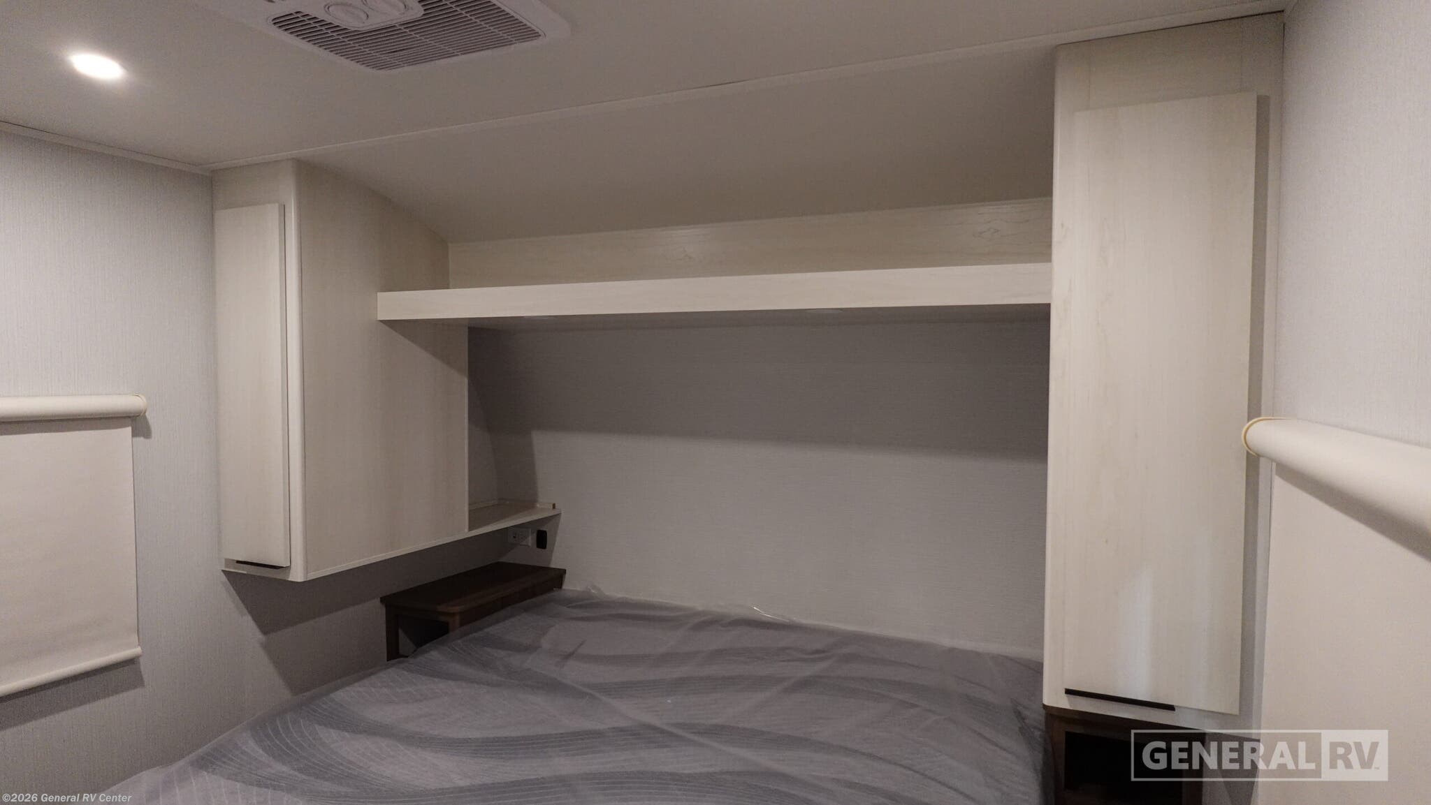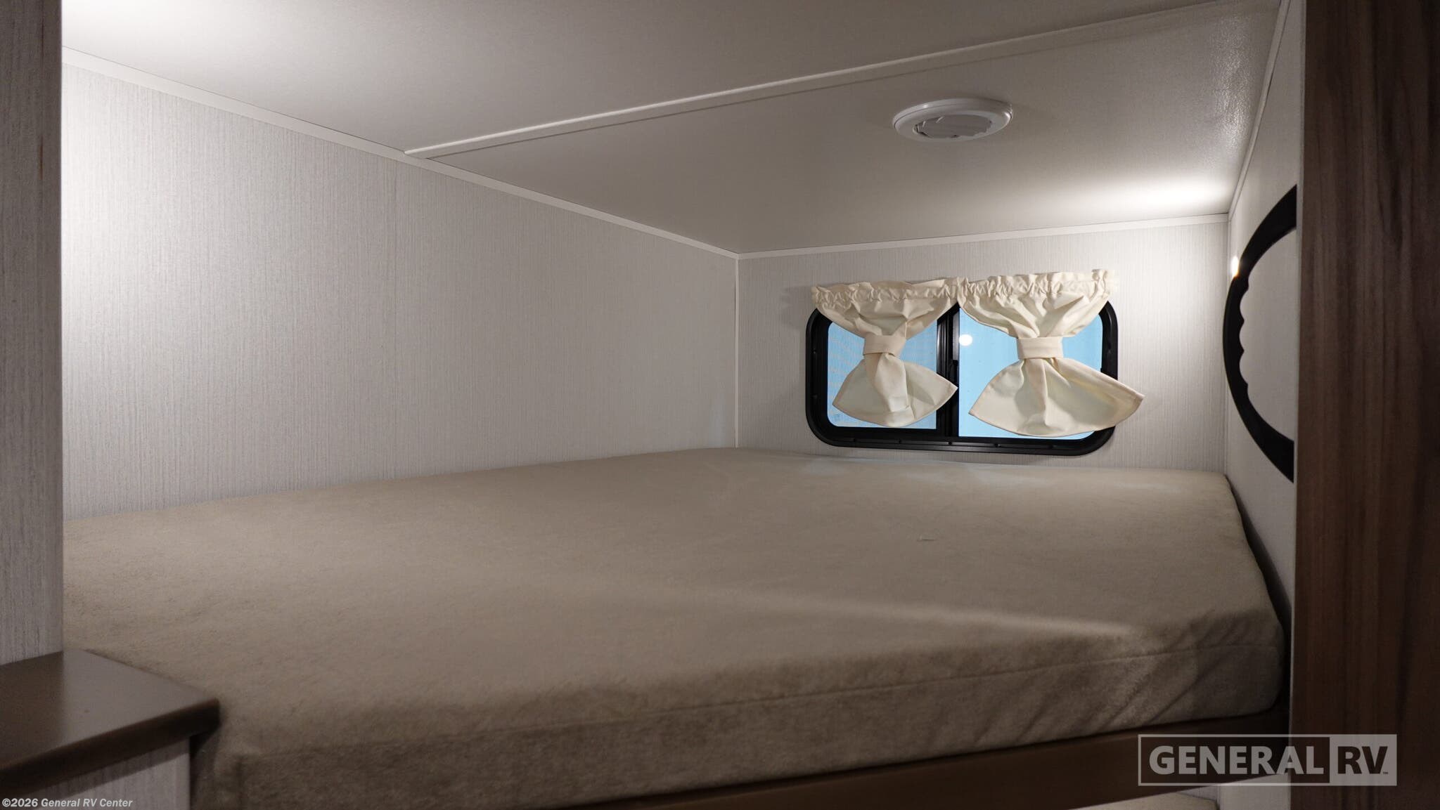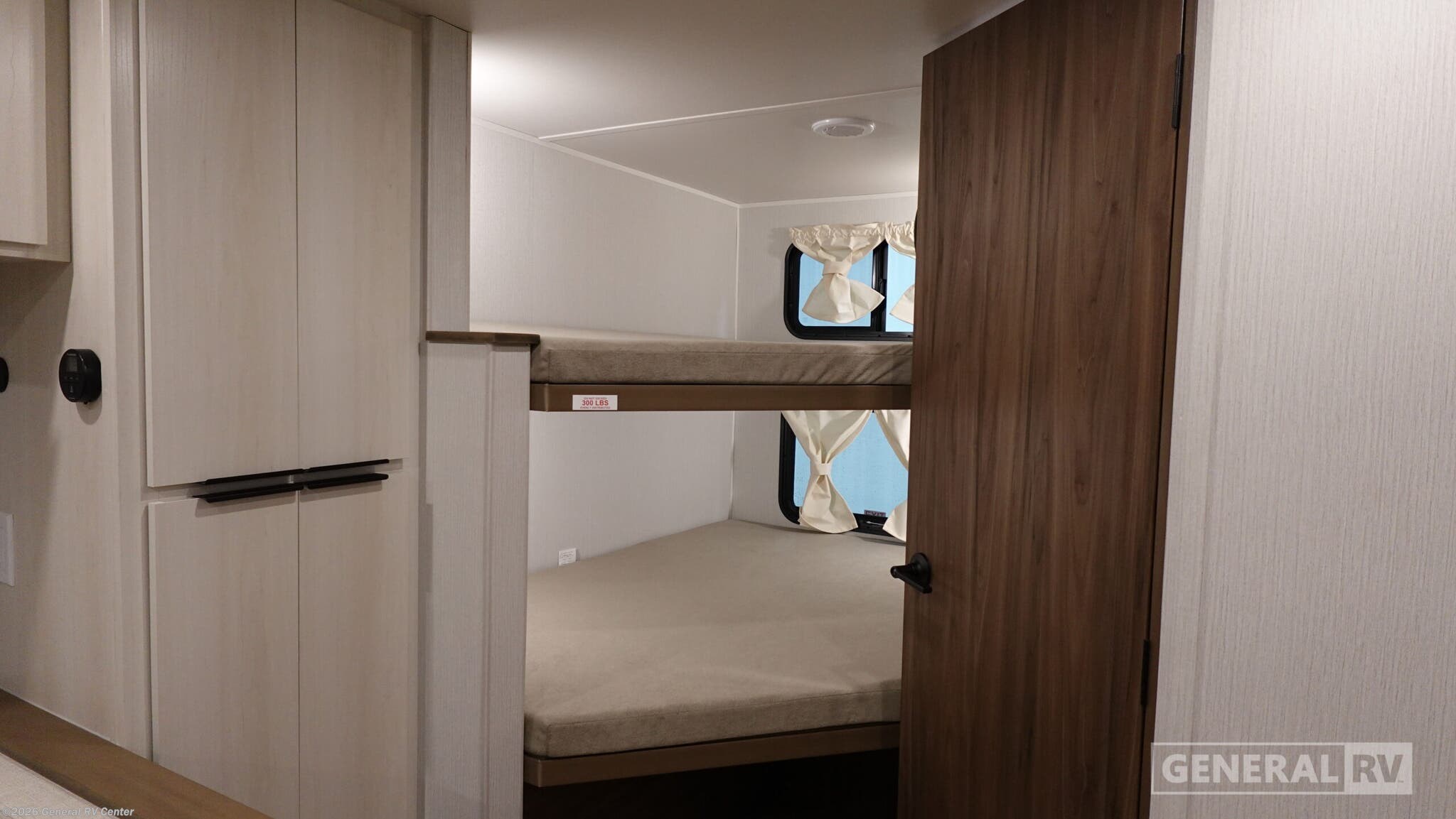 **Winnebago Access travel trailer 25BH highlights:** - Double-Size Bunk Beds - Exterior Refrigerator - Front Private Bedroom - Rear Corner Full Bath Weekend trips to the campground are made easy in this spacious travel trailer for eight! There is a front private bedroom with a space saving sliding door, a 66" x 80" queen bed, and dual wardrobes to keep your things tidy. The bunks in the back will provide compact sleeping space for guests, and there is a tri-fold sofa slide out and a booth dinette in the combined kitchen and living area for even more accommodations. A wardrobe/pantry is found beside the booth dinette to keep snacks stocked. The chef of your group is sure to appreciate the flip-up counter for more prep space, along with all the appliances needed to create their best meals. With any Winnebago Access travel trailer you will find thoughtful, clean, and contemporary designs filled with premium features that all have come to expect on any Winnebago towable. There are single and tandem axle models available, each with superior storage, durable construction, and spacious interiors. The functional galley kitchen will make time at the campground easier than ever, and the stylish roller shades will provide privacy and shade when you need it!