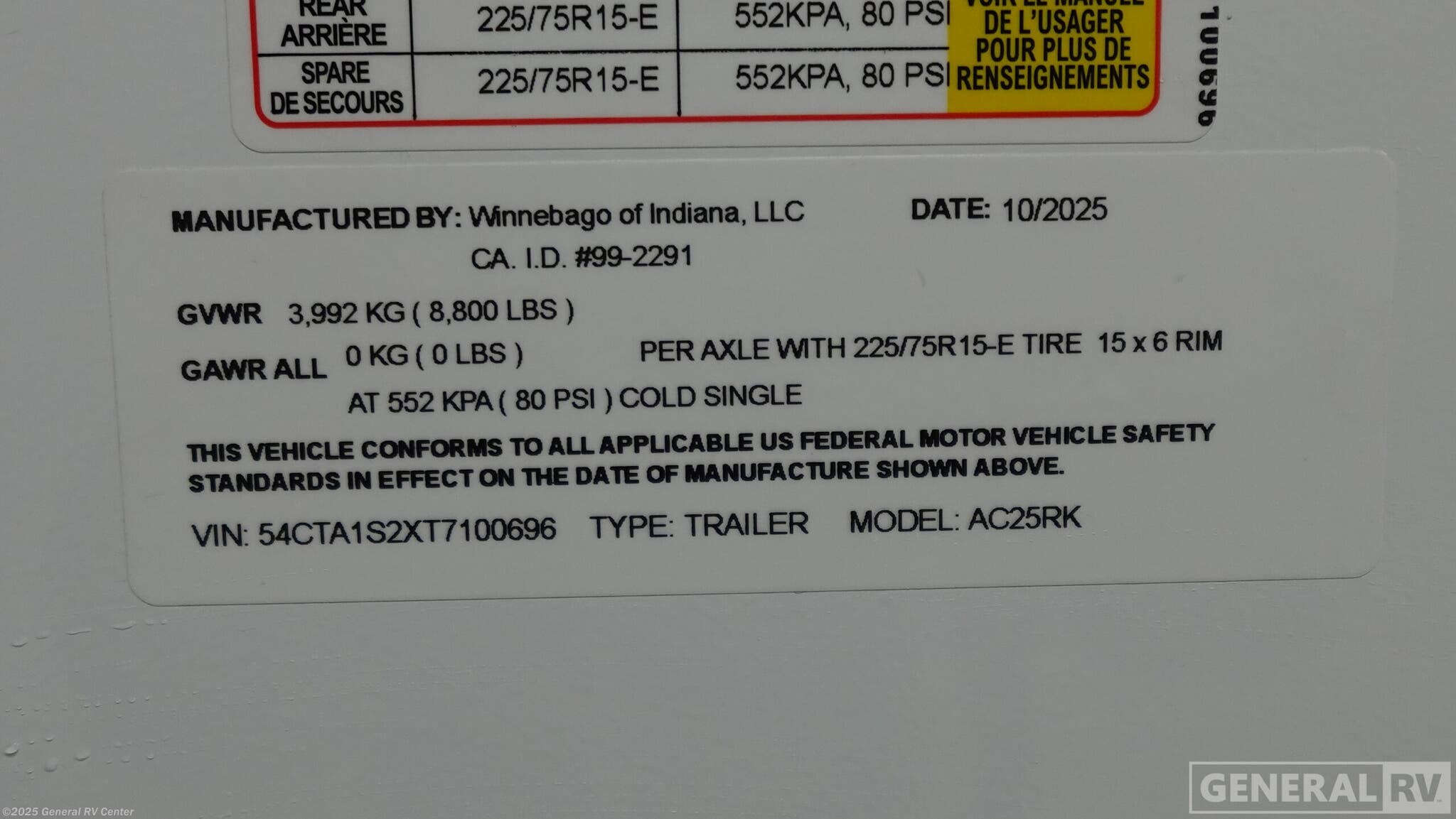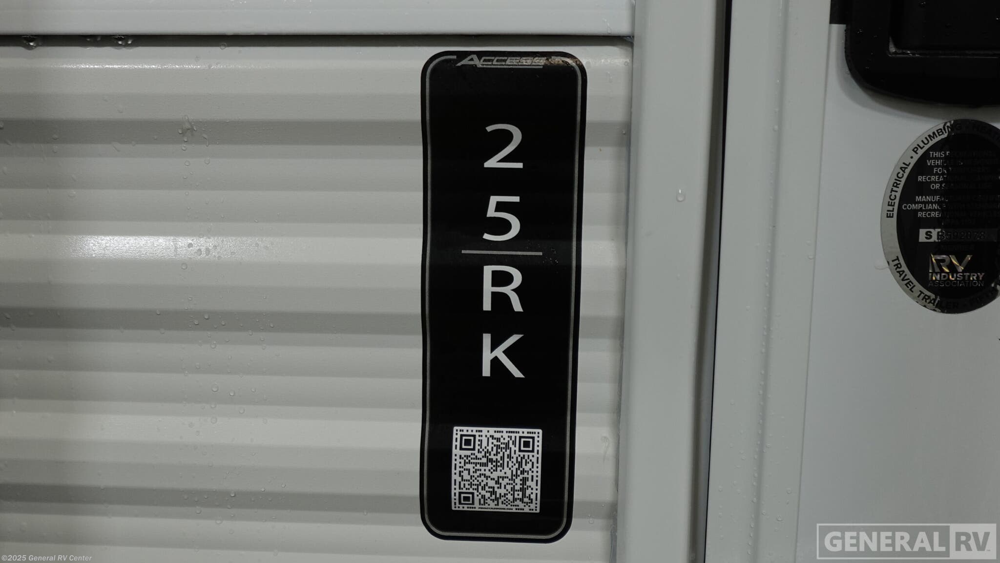 Winnebago Access travel trailer 25RK highlights: Rear Kitchen Booth Dinette 66" x 80" Queen Bed Exterior Baggage Doors You'll love every minute spent in this spacious travel trailer! With dual entry doors, you can enter in through the rear kitchen or the front private bedroom! There are dual beside wardrobes here and a closet so you can keep your space organized, and the full bath is right next to the bedroom for easy nighttime use. Back to the kitchen, you'll find ample counter space to prep meals, a three-burner cooktop, plus a pantry and 10 cu. ft. 12V refrigerator for food storage. Your crew can dine at the booth dinette, then relax on the tri-fold sofa slide after dinner. And both of these pieces of furniture can double as sleeping space for guests! With any Winnebago Access travel trailer you will find thoughtful, clean, and contemporary designs filled with premium features that all have come to expect on any Winnebago towable. There are single and tandem axle models available, each with superior storage, durable construction, and spacious interiors. The functional galley kitchen will make time at the campground easier than ever, and the stylish roller shades will provide privacy and shade when you need it!