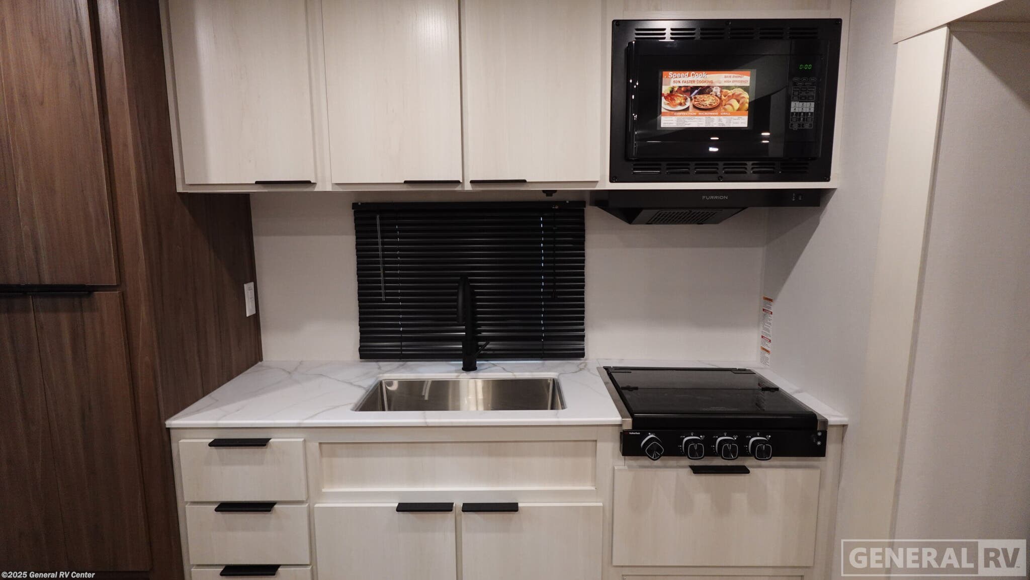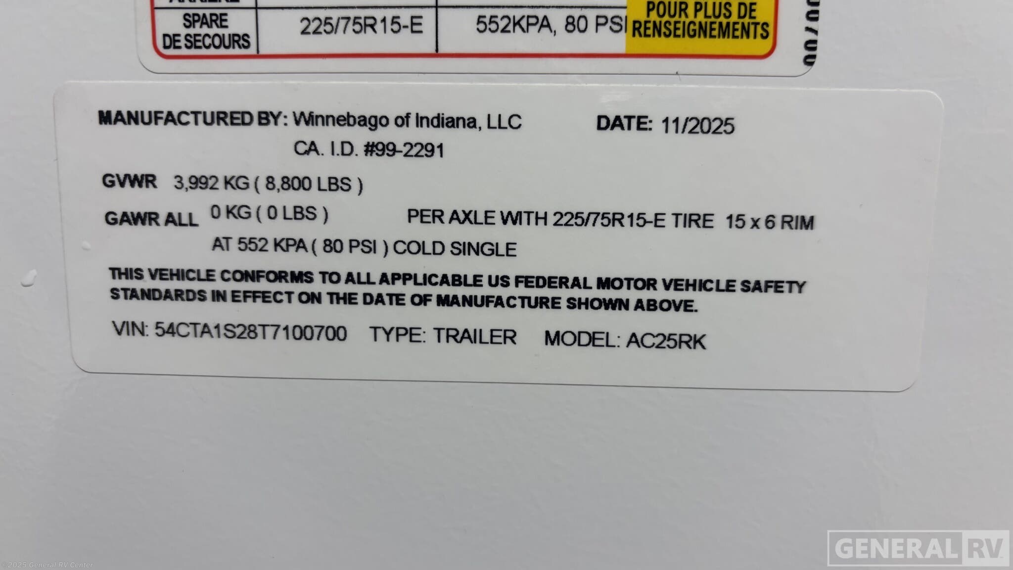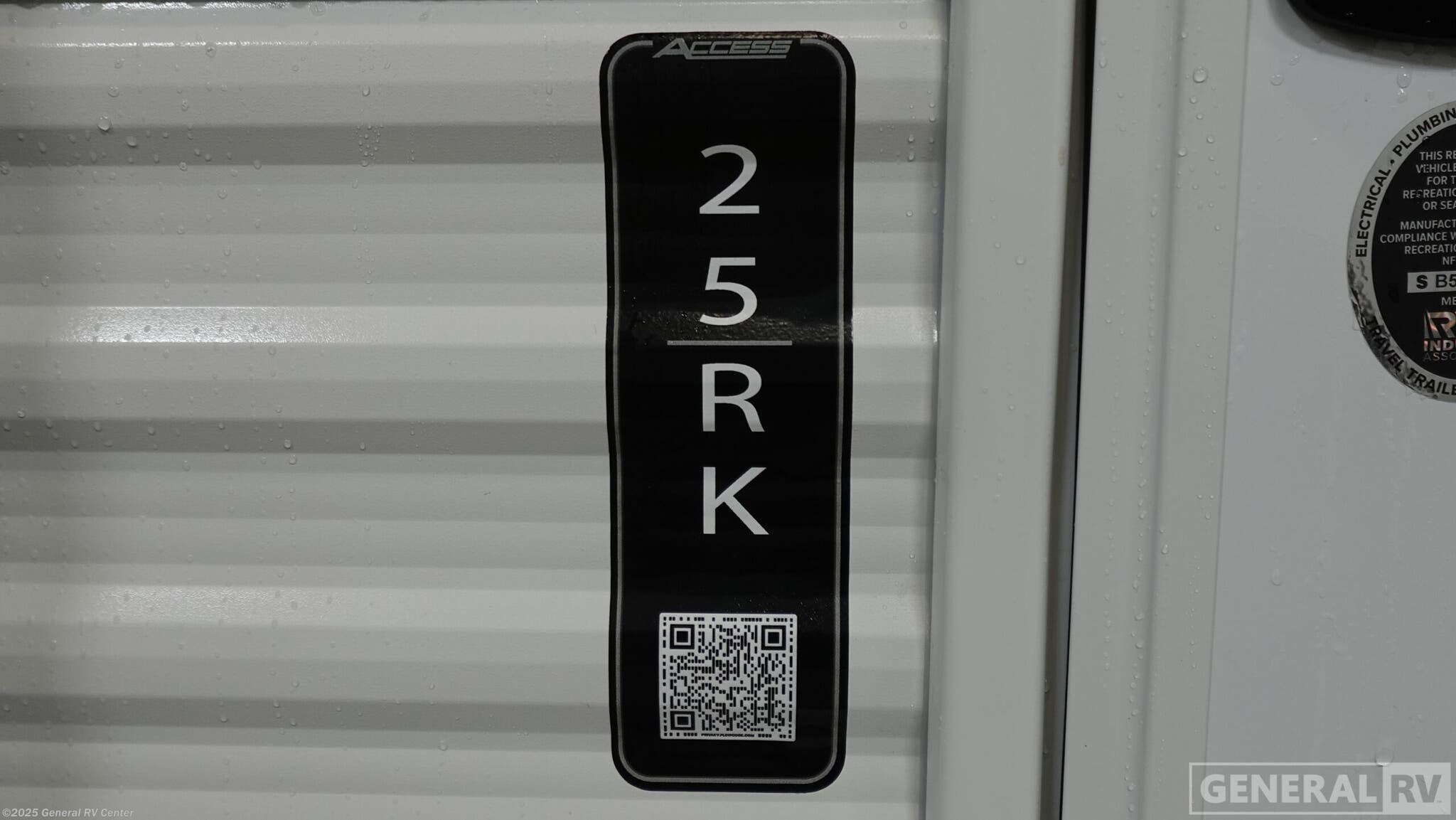 Winnebago Access travel trailer 25RK highlights: Rear Kitchen Booth Dinette 66" x 80" Queen Bed Exterior Baggage Doors You'll love every minute spent in this spacious travel trailer! With dual entry doors, you can enter in through the rear kitchen or the front private bedroom! There are dual beside wardrobes here and a closet so you can keep your space organized, and the full bath is right next to the bedroom for easy nighttime use. Back to the kitchen, you'll find ample counter space to prep meals, a three-burner cooktop, plus a pantry and 10 cu. ft. 12V refrigerator for food storage. Your crew can dine at the booth dinette, then relax on the tri-fold sofa slide after dinner. And both of these pieces of furniture can double as sleeping space for guests! With any Winnebago Access travel trailer you will find thoughtful, clean, and contemporary designs filled with premium features that all have come to expect on any Winnebago towable. There are single and tandem axle models available, each with superior storage, durable construction, and spacious interiors. The functional galley kitchen will make time at the campground easier than ever, and the stylish roller shades will provide privacy and shade when you need it!