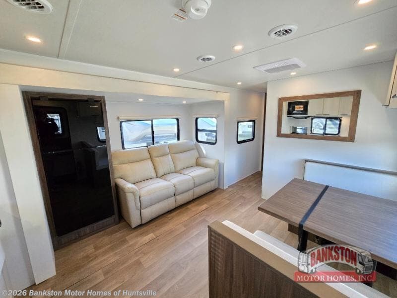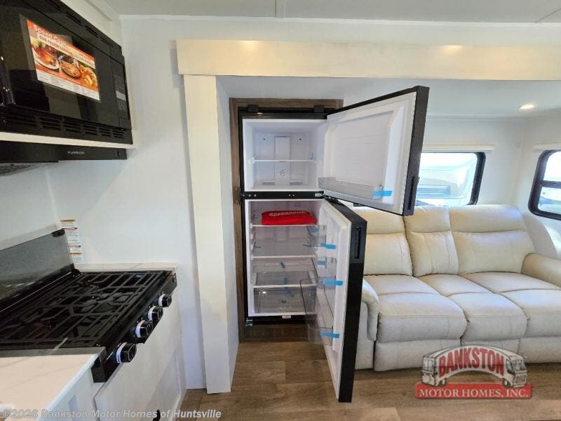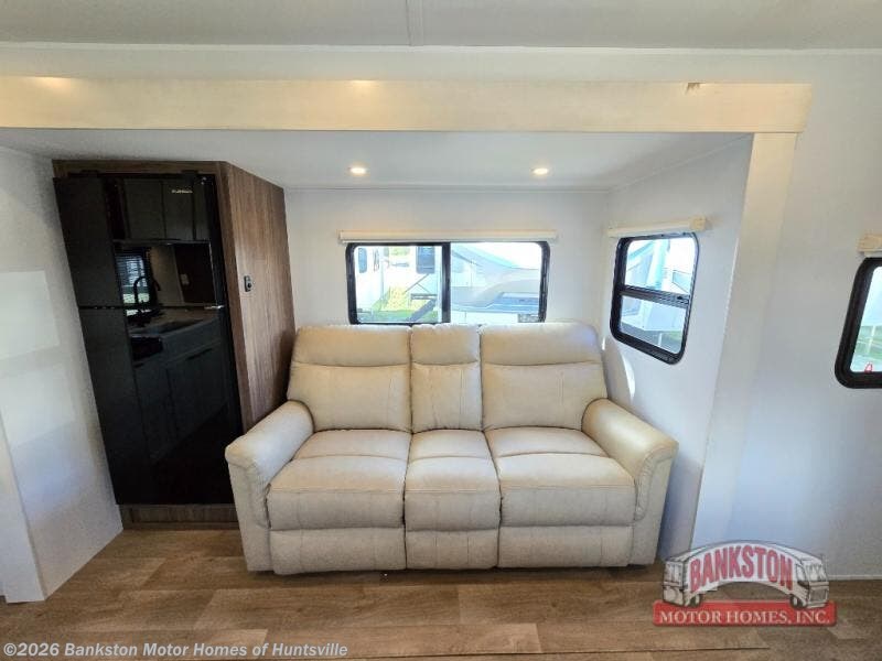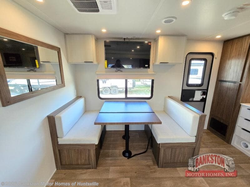 You'll love every minute spent in this spacious travel trailer! With dual entry doors, you can enter in through the rear kitchen or the front private bedroom! There are dual beside wardrobes here and a closet so you can keep your space organized, and the full bath is right next to the bedroom for easy nighttime use. Back to the kitchen, you'll find ample counter space to prep meals, a three-burner cooktop, plus a pantry and 10 cu. ft. 12V refrigerator for food storage. Your crew can dine at the booth dinette, then relax on the tri-fold sofa slide after dinner. And both of these pieces of furniture can double as sleeping space for guests!
