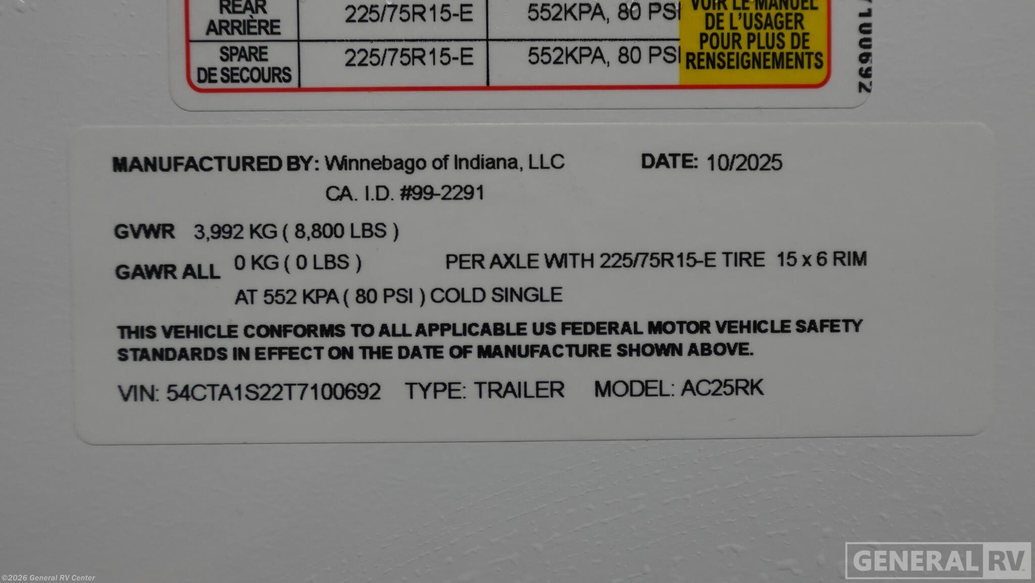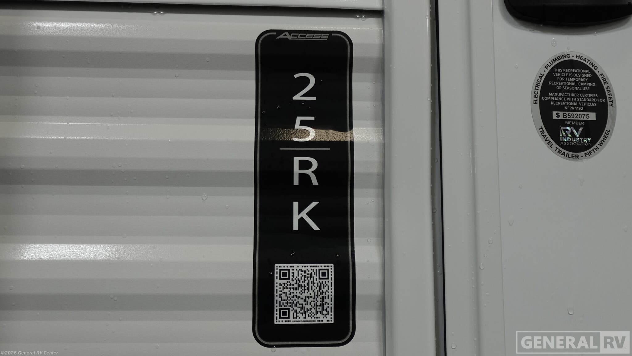 Winnebago Access travel trailer 25RK highlights: Rear Kitchen Booth Dinette 66" x 80" Queen Bed Exterior Baggage Doors You'll love every minute spent in this spacious travel trailer! With dual entry doors, you can enter in through the rear kitchen or the front private bedroom! There are dual beside wardrobes here and a closet so you can keep your space organized, and the full bath is right next to the bedroom for easy nighttime use. Back to the kitchen, you'll find ample counter space to prep meals, a three-burner cooktop, plus a pantry and 10 cu. ft. 12V refrigerator for food storage. Your crew can dine at the booth dinette, then relax on the tri-fold sofa slide after dinner. And both of these pieces of furniture can double as sleeping space for guests! With any Winnebago Access travel trailer you will find thoughtful, clean, and contemporary designs filled with premium features that all have come to expect on any Winnebago towable. There are single and tandem axle models available, each with superior storage, durable construction, and spacious interiors. The functional galley kitchen will make time at the campground easier than ever, and the stylish roller shades will provide privacy and shade when you need it!