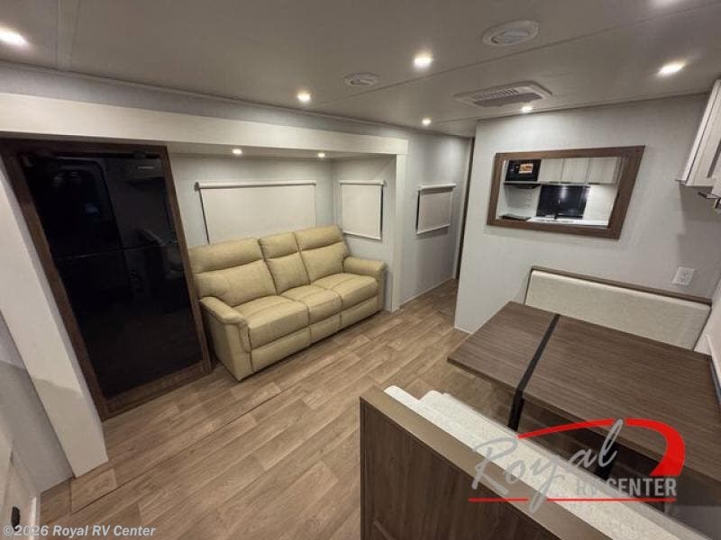The main living space includes a booth dinette and tri-fold sofa slide, giving everyone a comfortable place to relax. Both can convert into additional sleeping space for guests, making this trailer flexible for families or visitors.