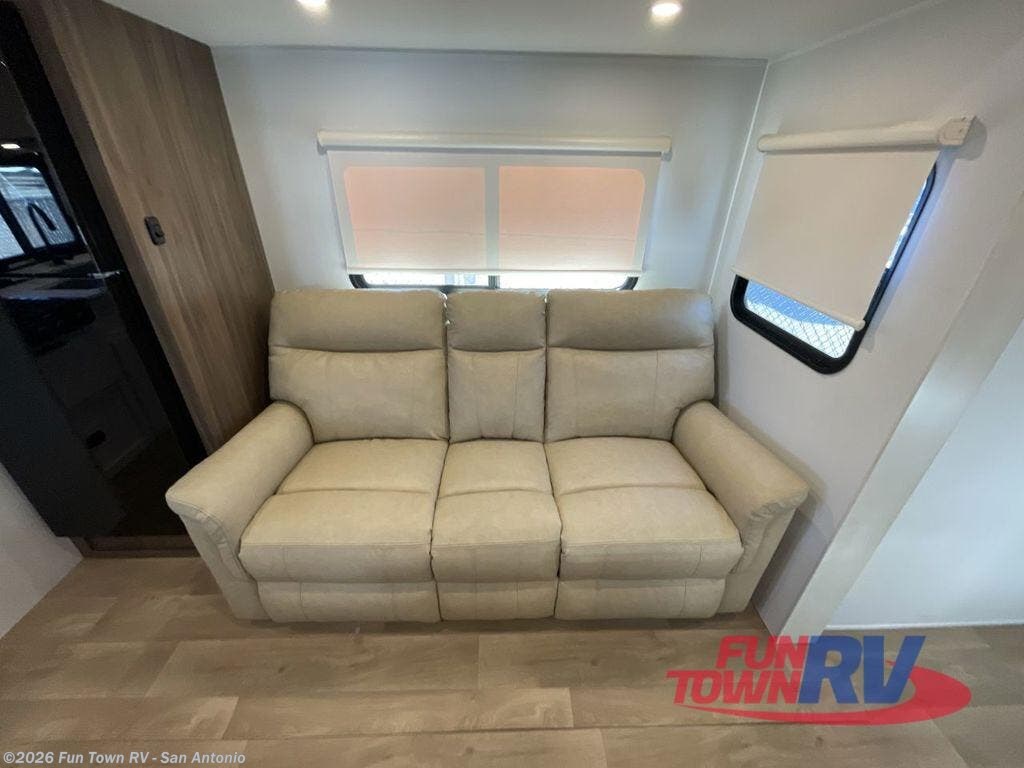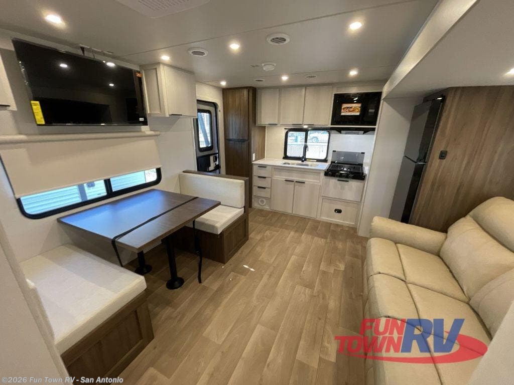 You'll love every minute spent in this spacious travel trailer! With dual entry doors, you can enter in through the rear kitchen or the front private bedroom! There are dual beside wardrobes here and a closet so you can keep your space organized, and the full bath is right next to the bedroom for easy nighttime use. Back to the kitchen, you'll find ample counter space to prep meals, a three-burner cooktop, plus a pantry and 10 cu. ft. 12V refrigerator for food storage. Your crew can dine at the booth dinette, then relax on the tri-fold sofa slide after dinner. And both of these pieces of furniture can double as sleeping space for guests!