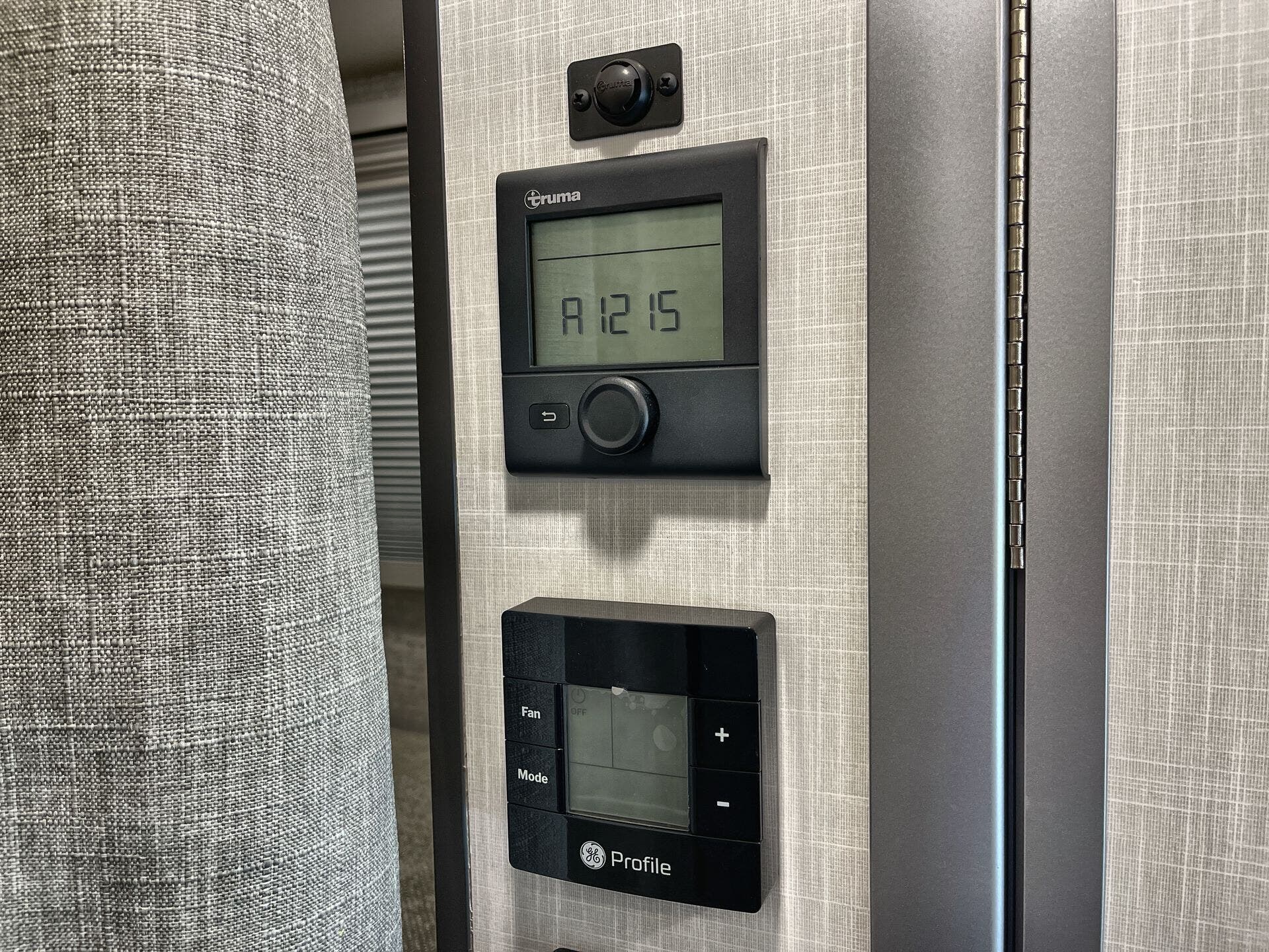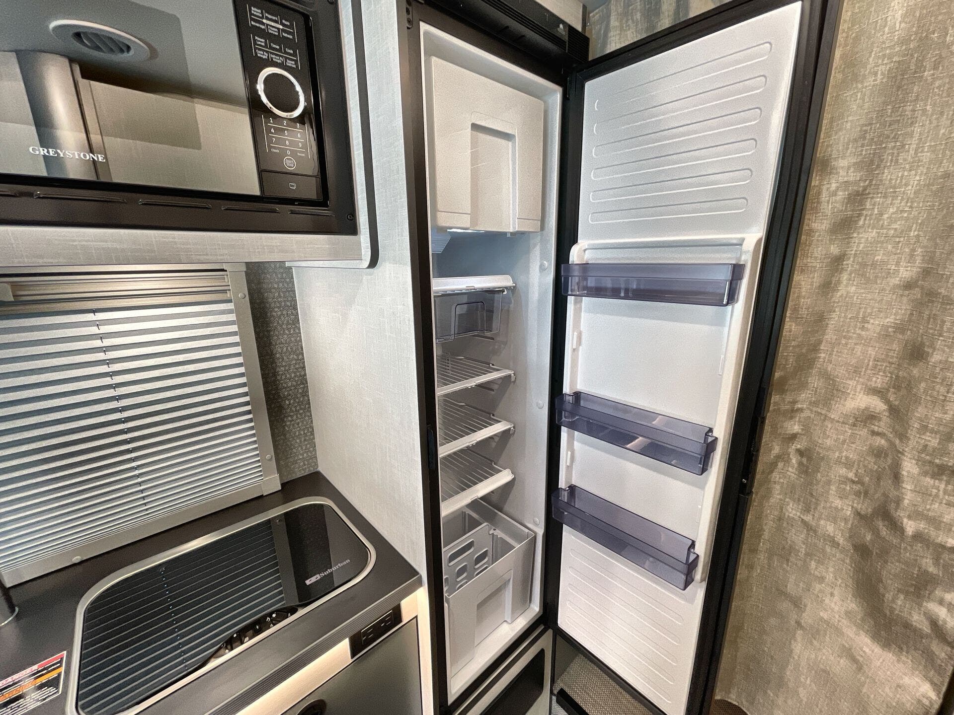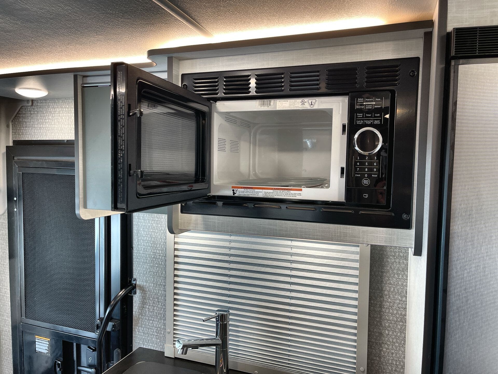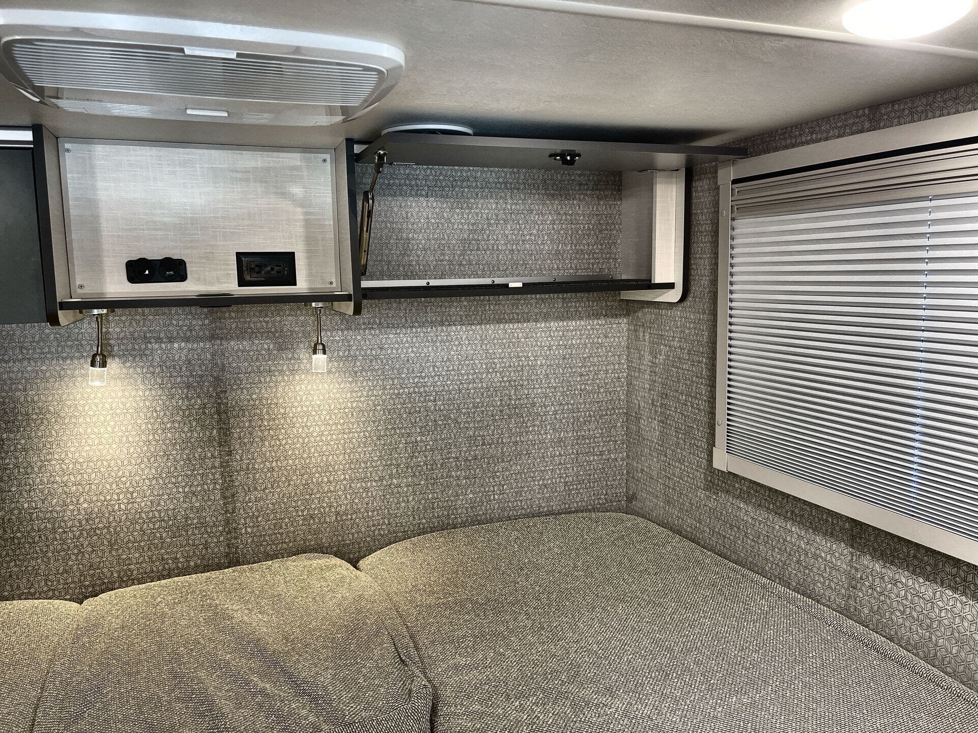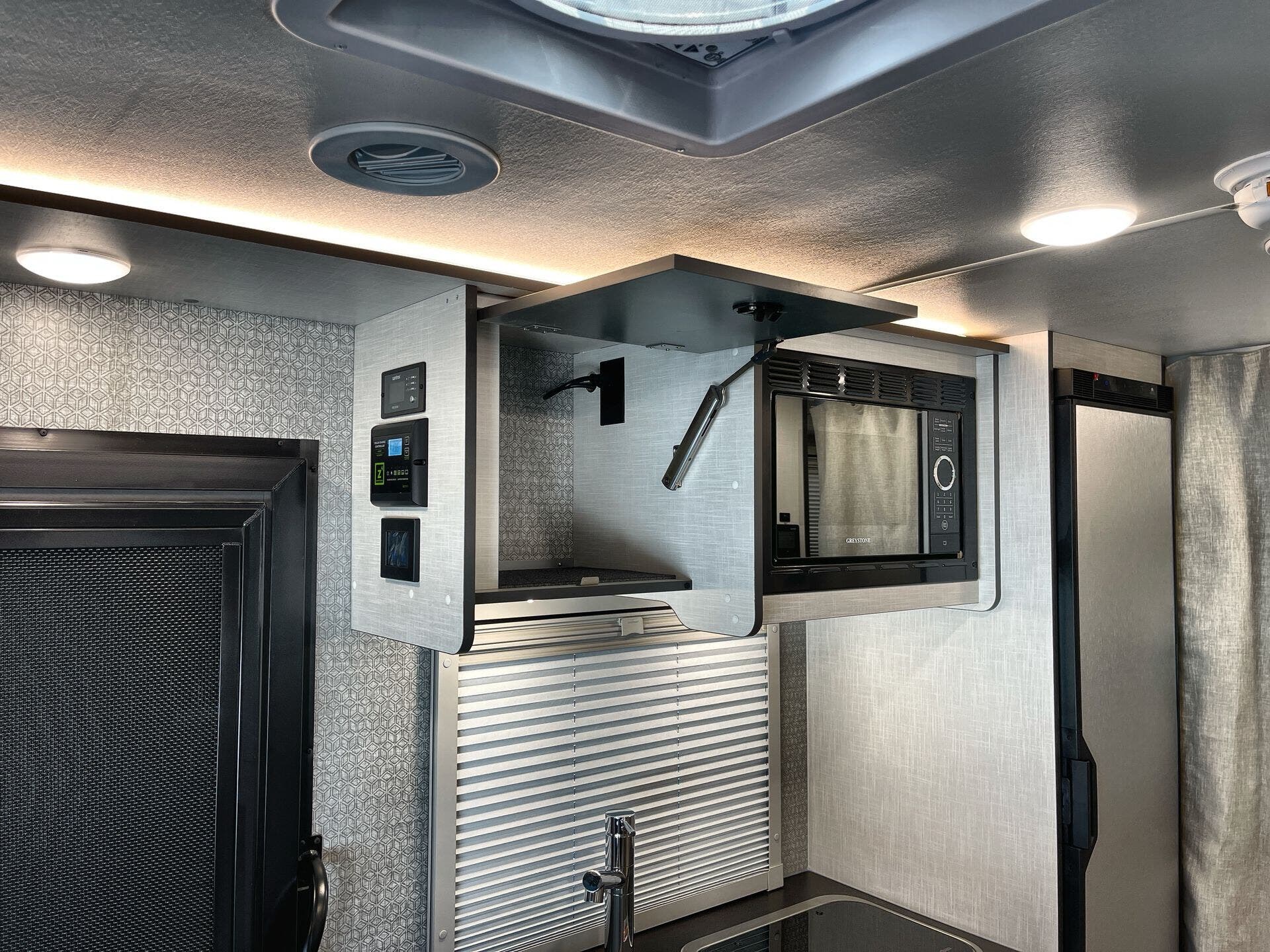 Inside, the Ekko keeps daily living simple and efficient with a well-equipped kitchen featuring a Microwave, Refrigerator, Stove, Kitchen Sink, and Overhead Cabinetry. Climate control is provided by Air Conditioning for warmer days, while Day/Night Shades offer privacy and light management. A TV delivers entertainment after a day of exploring, complemented by robust safety features including CO Detector, Smoke Detector, and Fire Extinguisher. The onboard Batteries support essential systems, helping you stay off the grid when needed.
