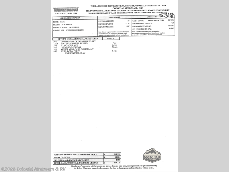 Request More Info on this 2026 Winnebago Ekko 22A Offered for sale by Colonial Airstream & RV