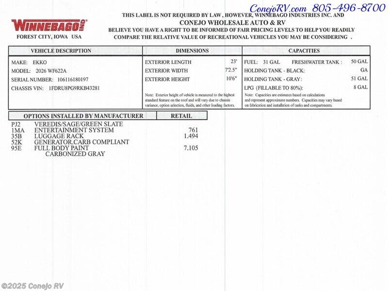 Request More Info on this 2026 Winnebago Ekko 22A Offered for sale by Conejo RV