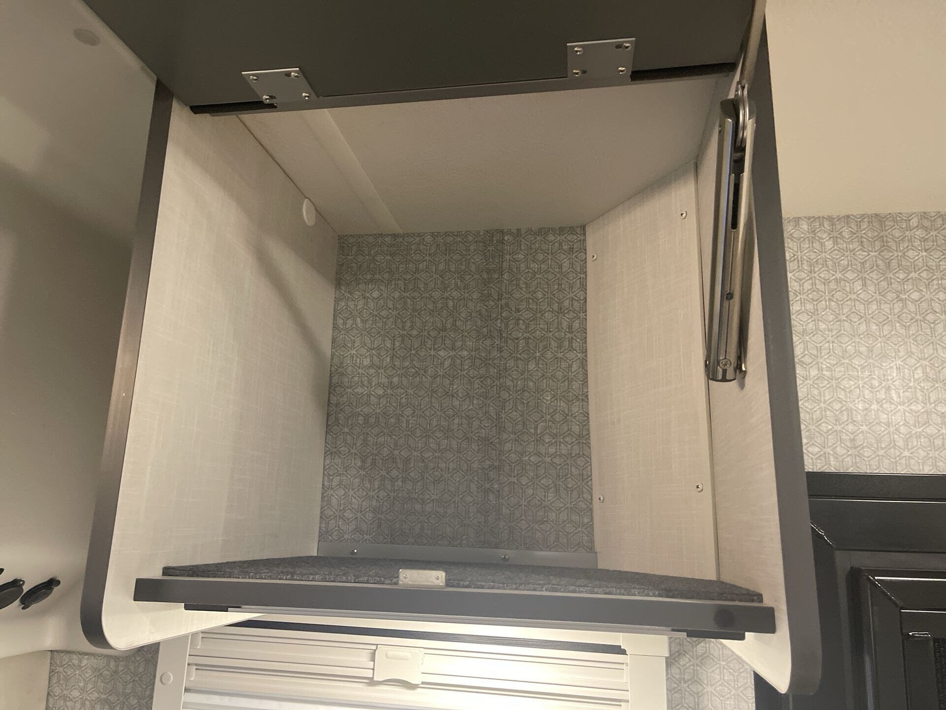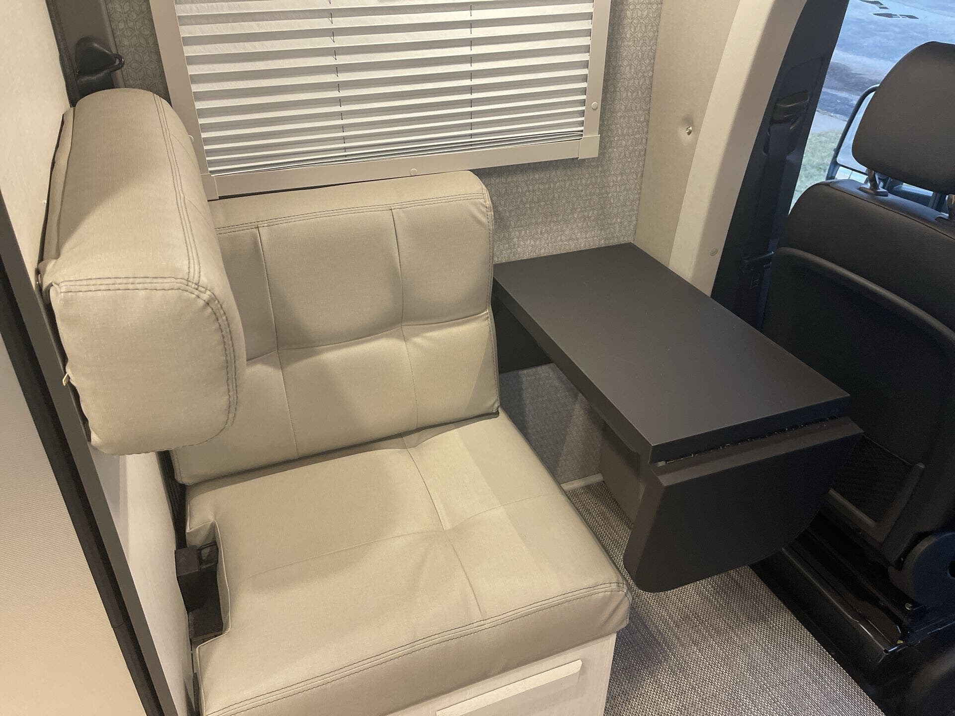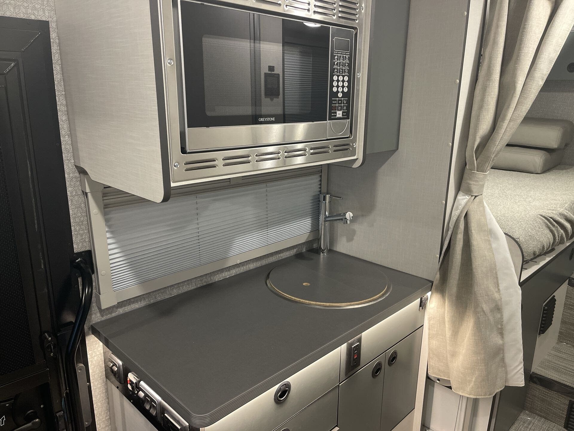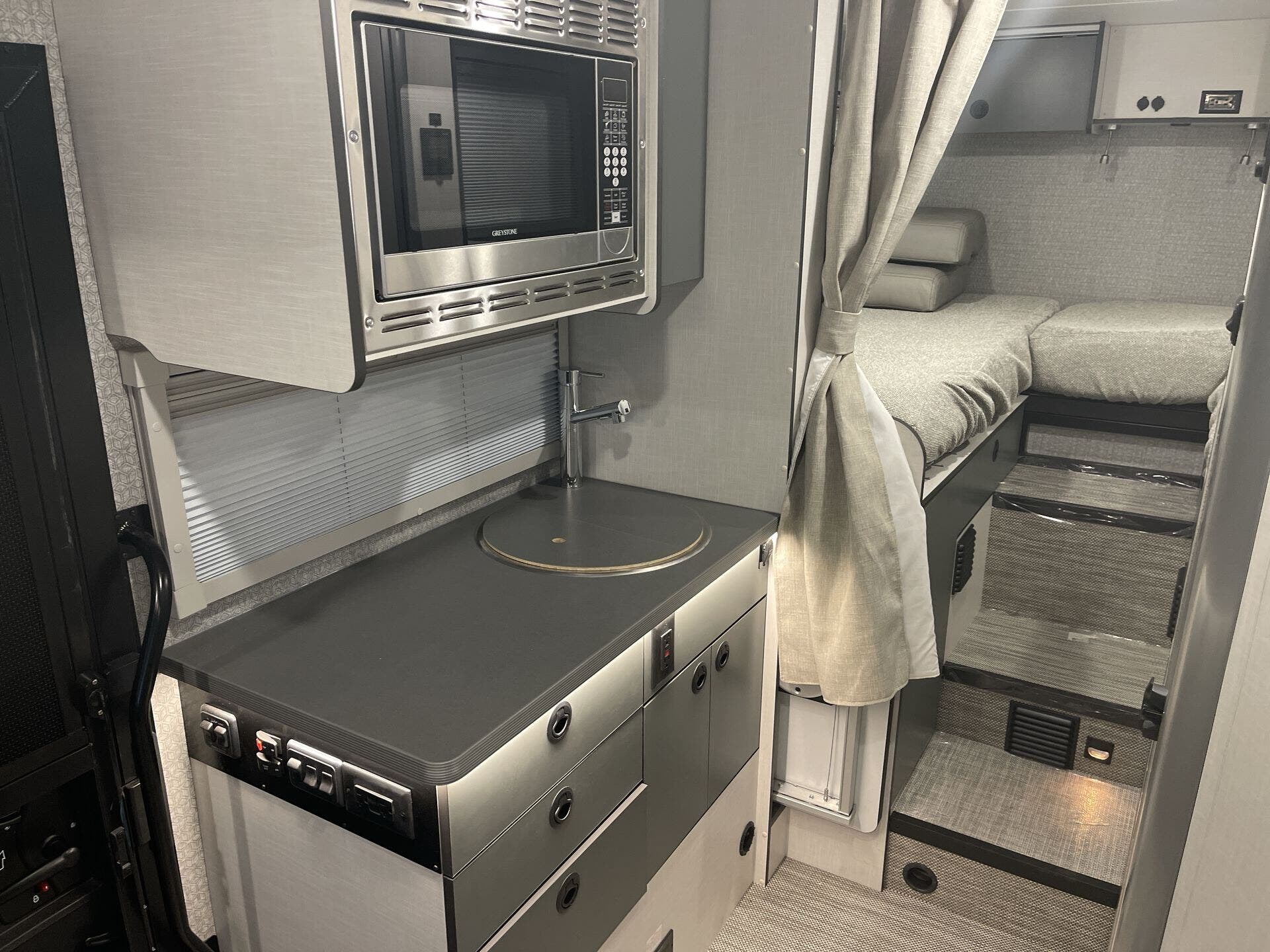 - Interior: Solid Surface Countertops, Kitchen Sink, Stove Top Burner, Microwave, Refrigerator, Water Heater, Day/Night Shades, Overhead Cabinetry, Removable Table, Shower, Toilet, Wardrobe(s)
