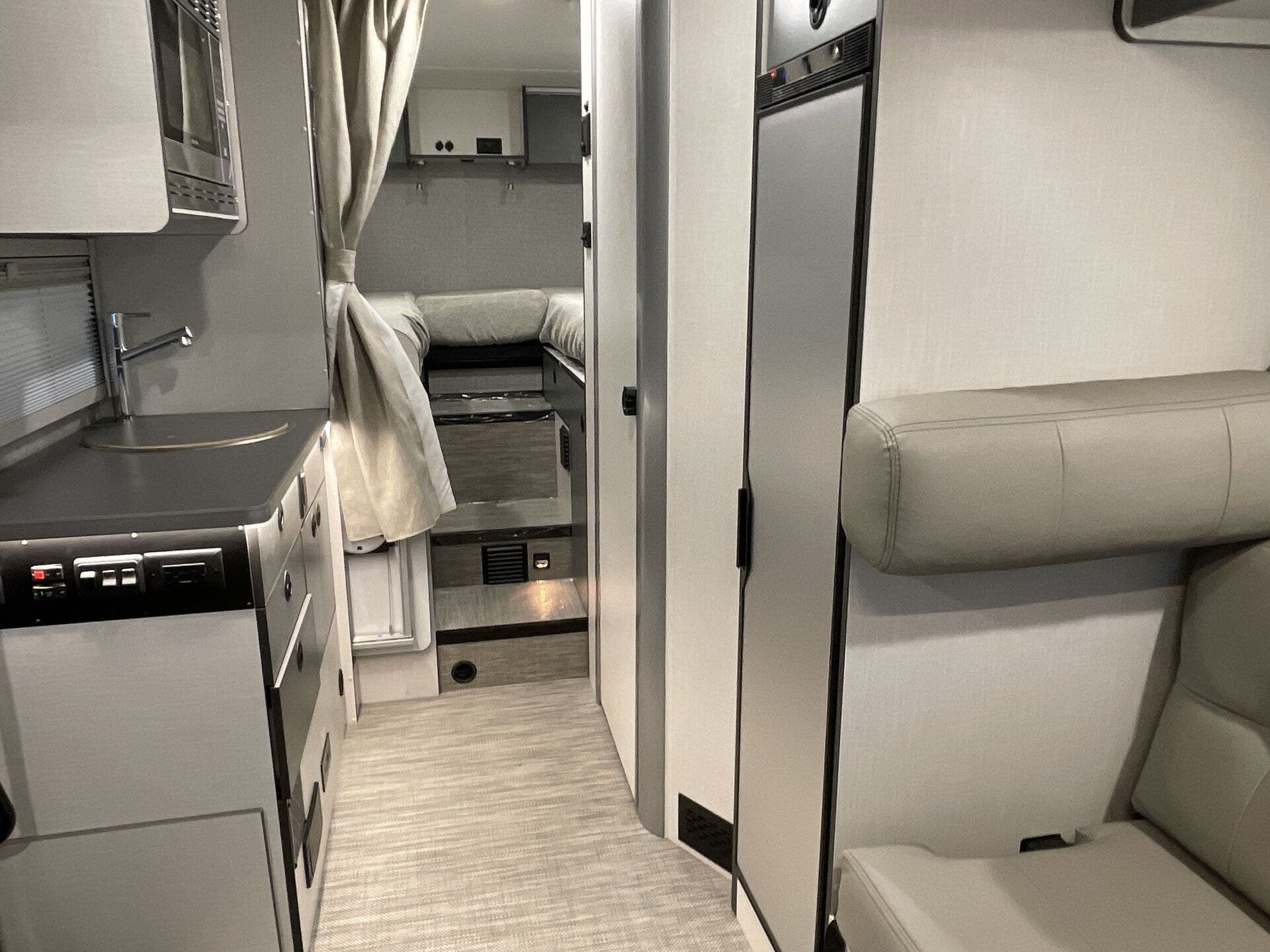 The 23B floorplan emphasizes a welcoming front living area that makes great use of the compact footprint. The mid kitchen area provides solid surface countertops for meal prep, a kitchen sink, microwave, refrigerator, and stove top burner, while the rear bedroom offers a private retreat after a day on the road. With its compact length of 24 feet 6 inches, this motorhome is easy to maneuver and park, yet it doesn’t compromise on essential living features for a comfortable RV experience.