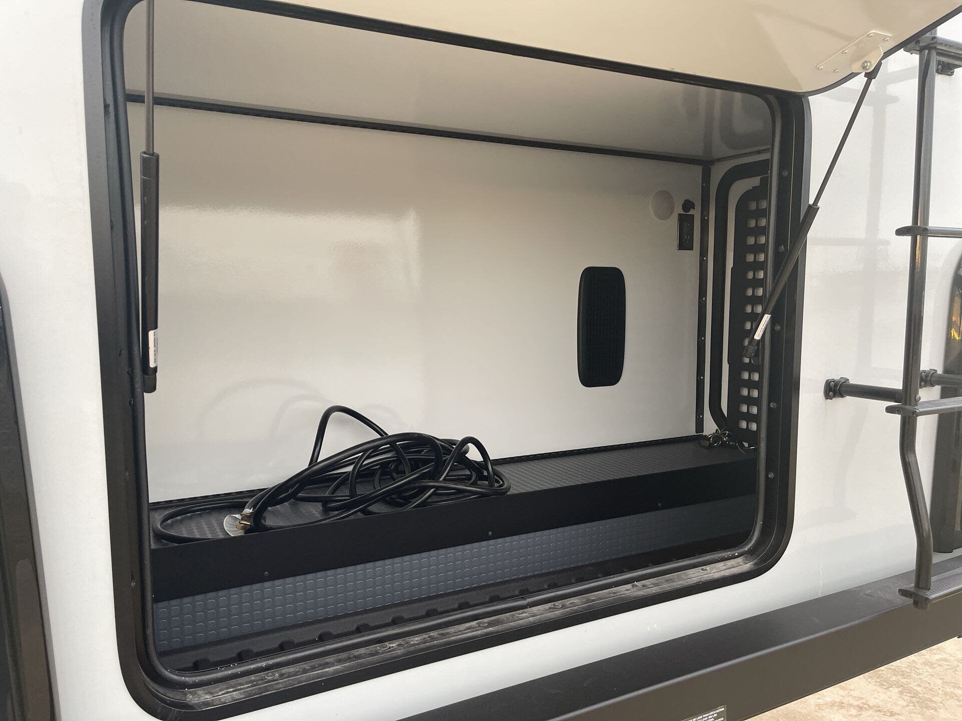 - Exterior: Power Awning, LED Lights, Backup Monitor, Pass-Thru Storage, Detachable Power Cord, Hitch, Ladder
