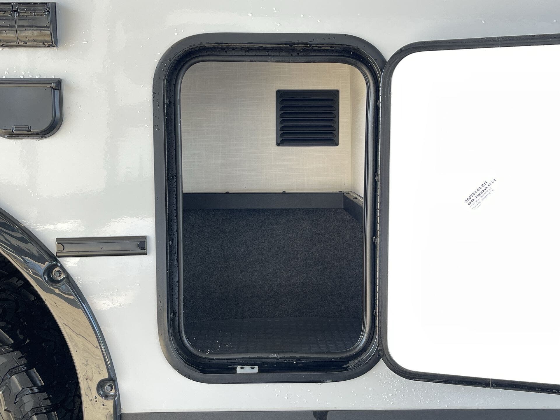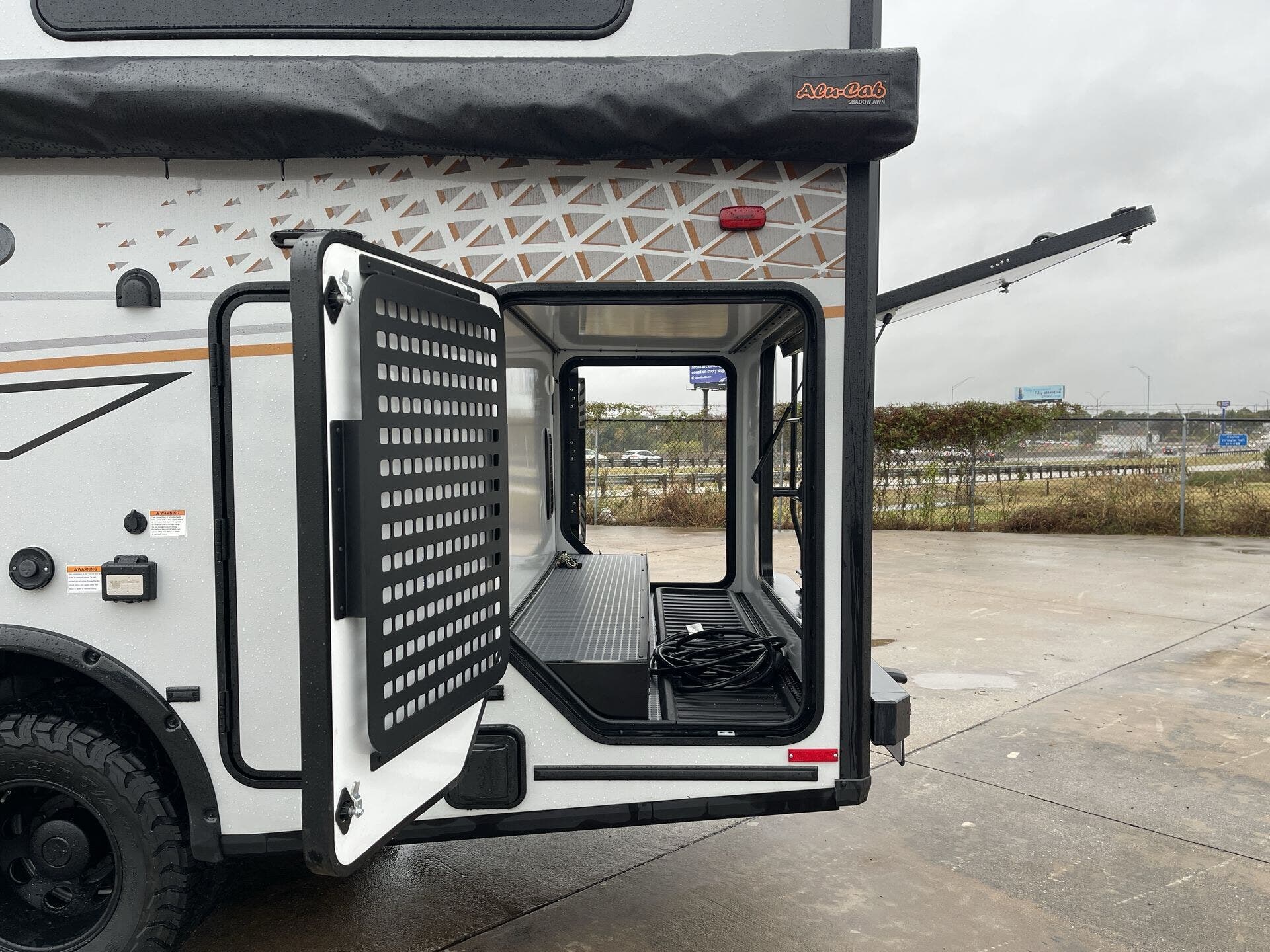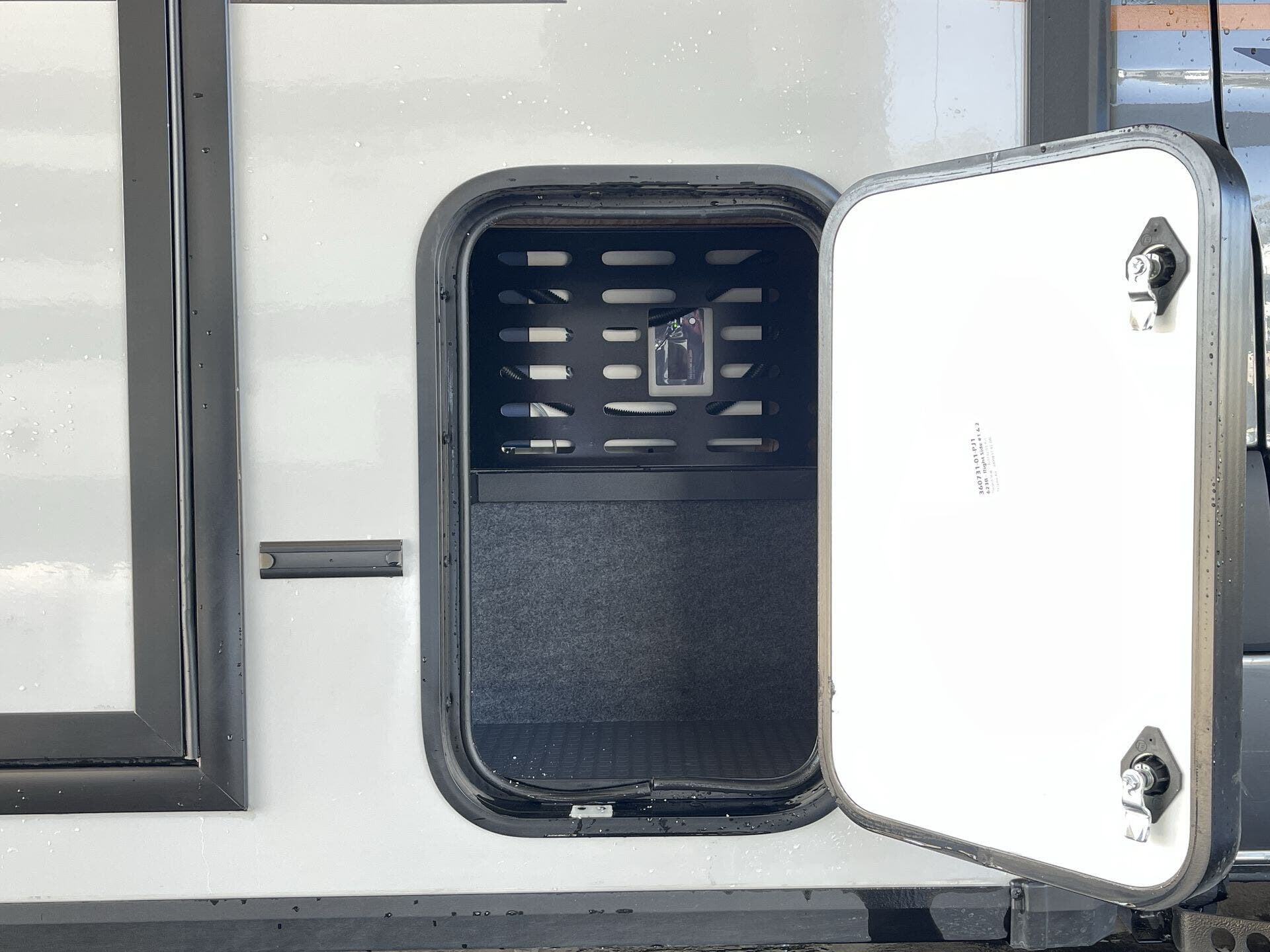 - Exterior conveniences: Power Awning, Awning- Batwing, Screen Door, Ladder, Pass-Thru Storage, Hitch, Spare Tire Kit, Luggage Rack