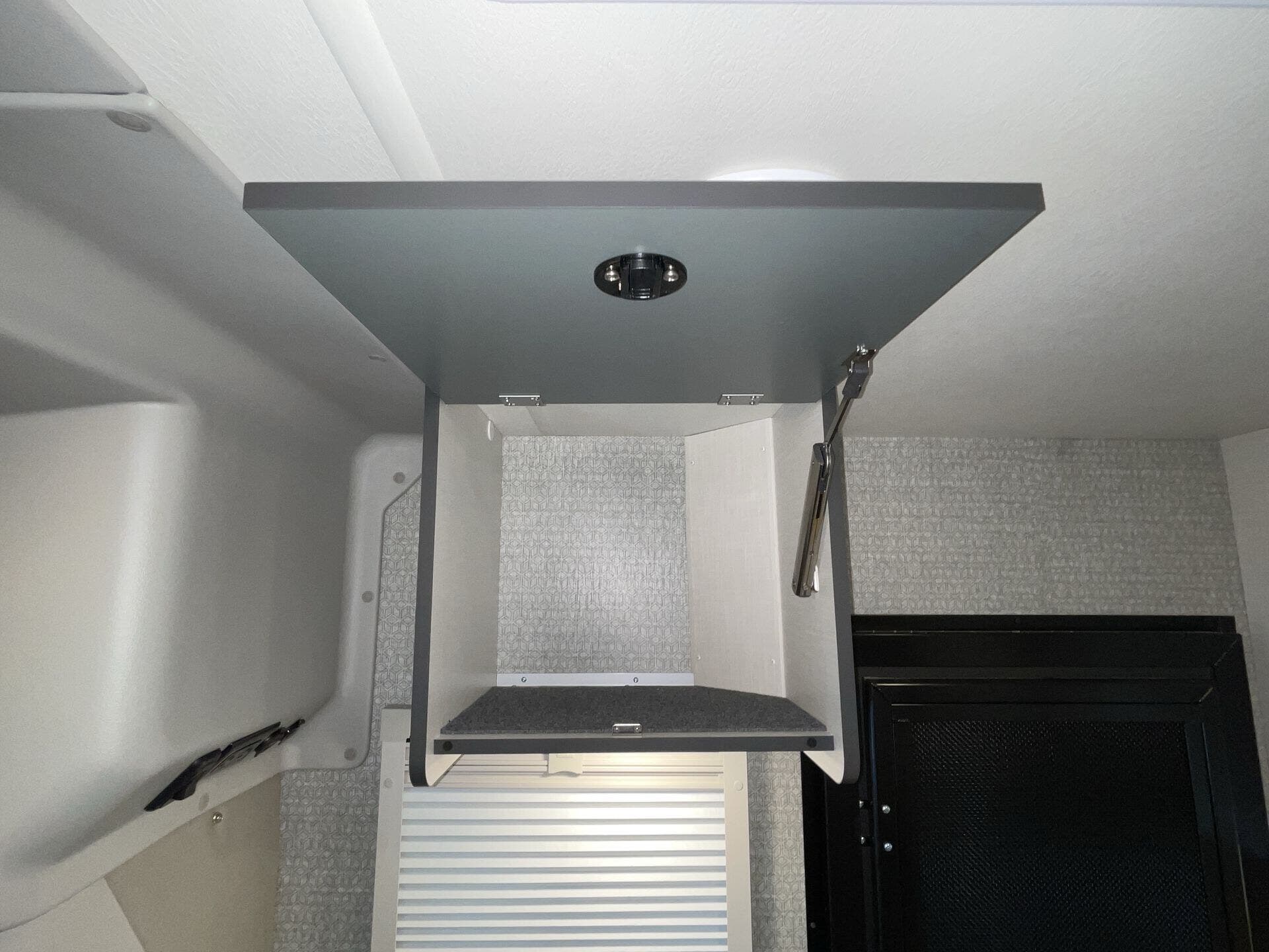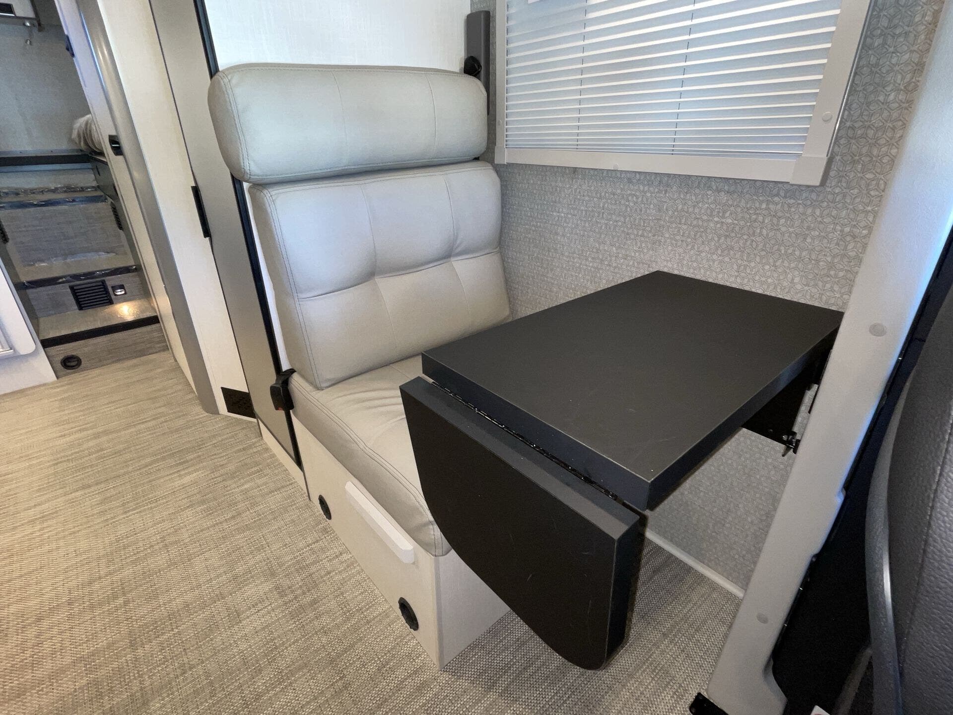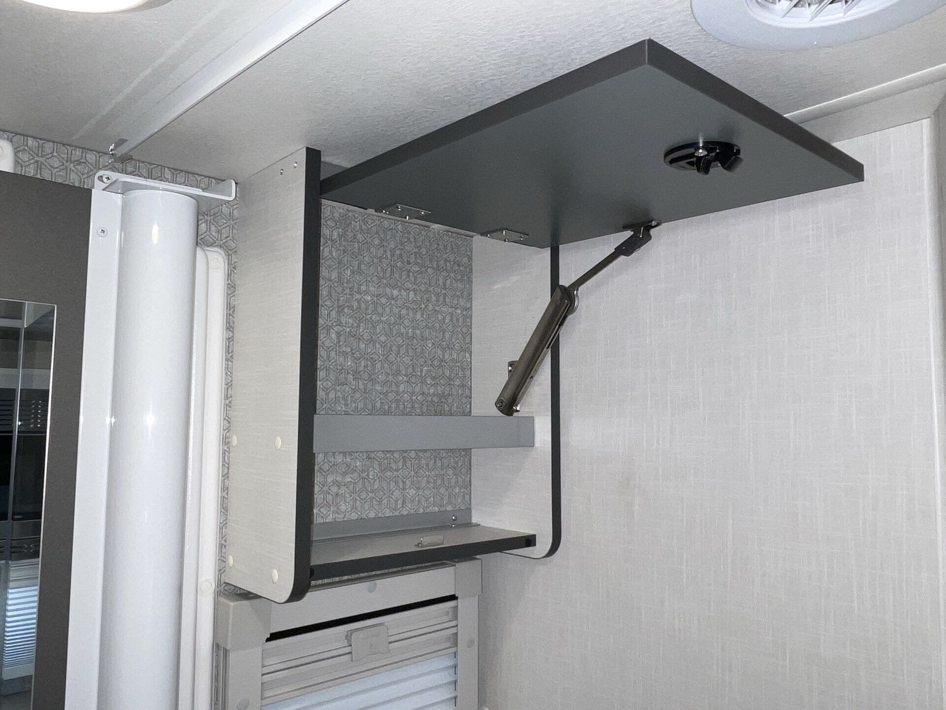 Day/Night Shades, Kitchen Sink, Medicine Cabinet, Overhead Cabinetry, Removable Table, Roof Vents, Shower, Solid Surface Countertops, Toilet, Wardrobe(s) -