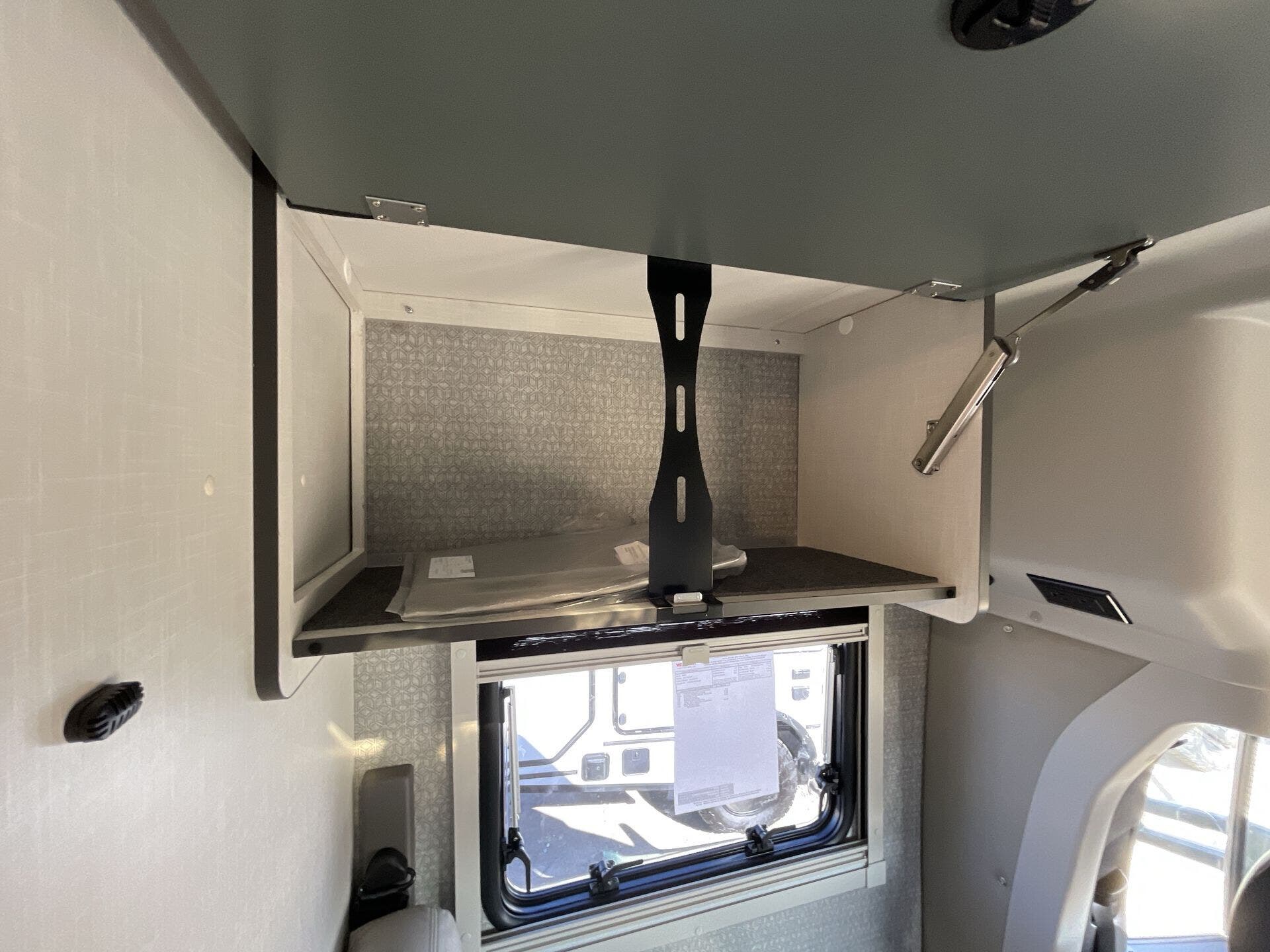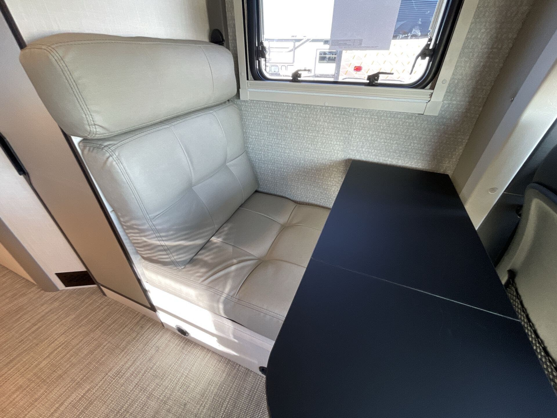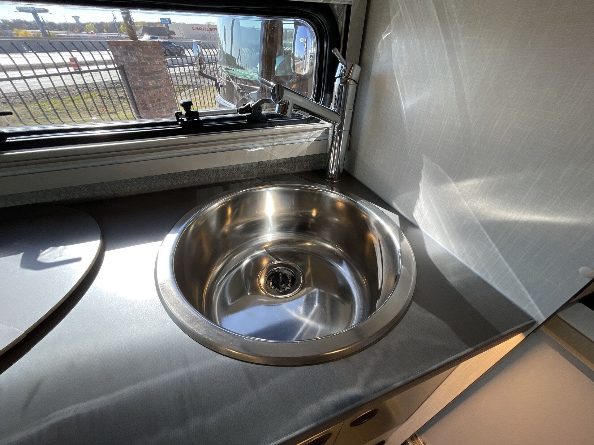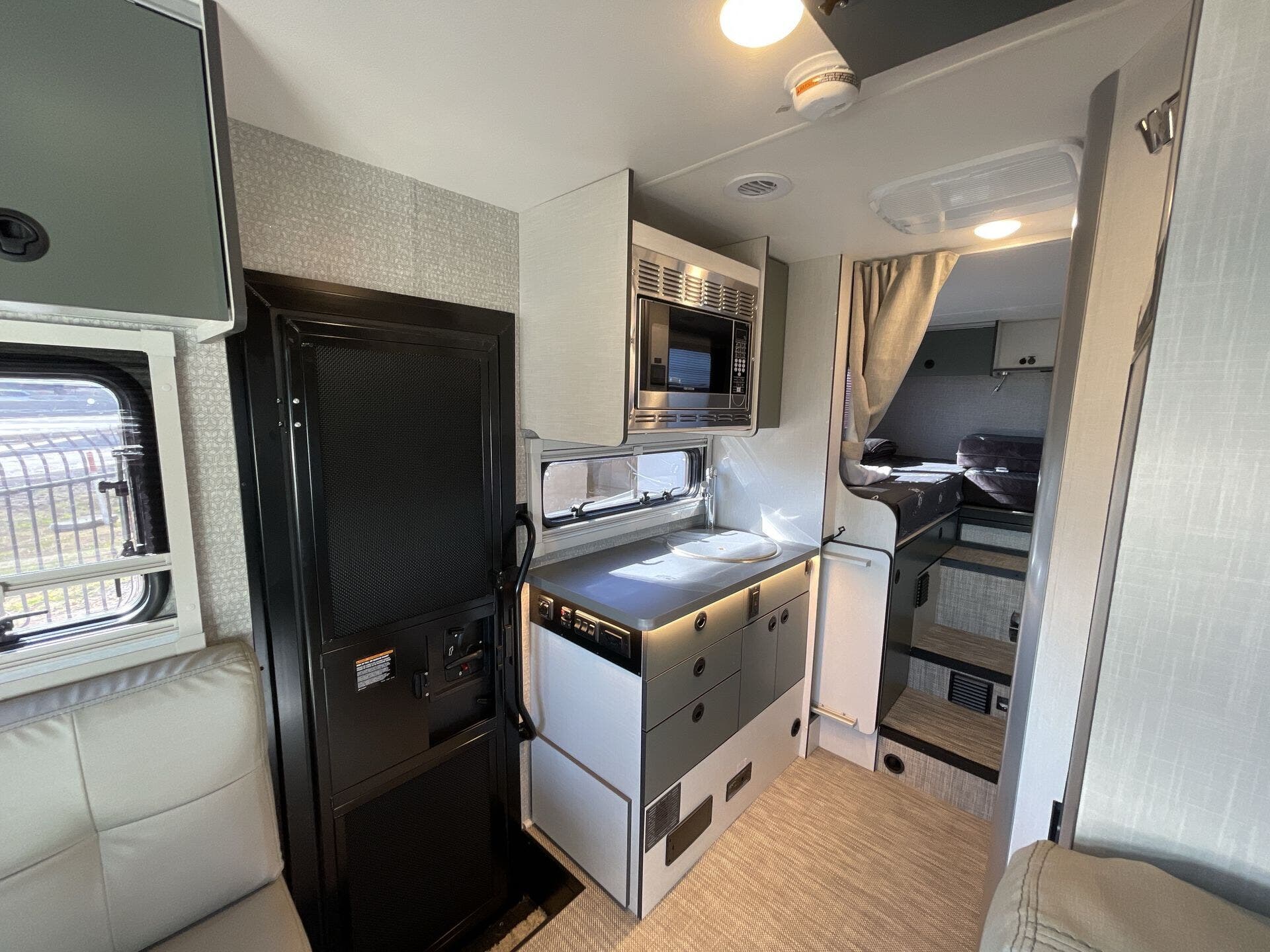 Inside, the Ekko 23B features a smart, versatile layout that maximizes every inch of space. Twin beds convert into a larger sleeping area, while the front lounge provides a comfortable place to dine, relax, or plan the next day’s route. The modern galley is fully equipped with quality appliances, ample storage, and efficient design, making meal prep easy whether you’re plugged in or off the grid. Premium materials, LED lighting, and contemporary styling give the interior a polished, upscale feel.