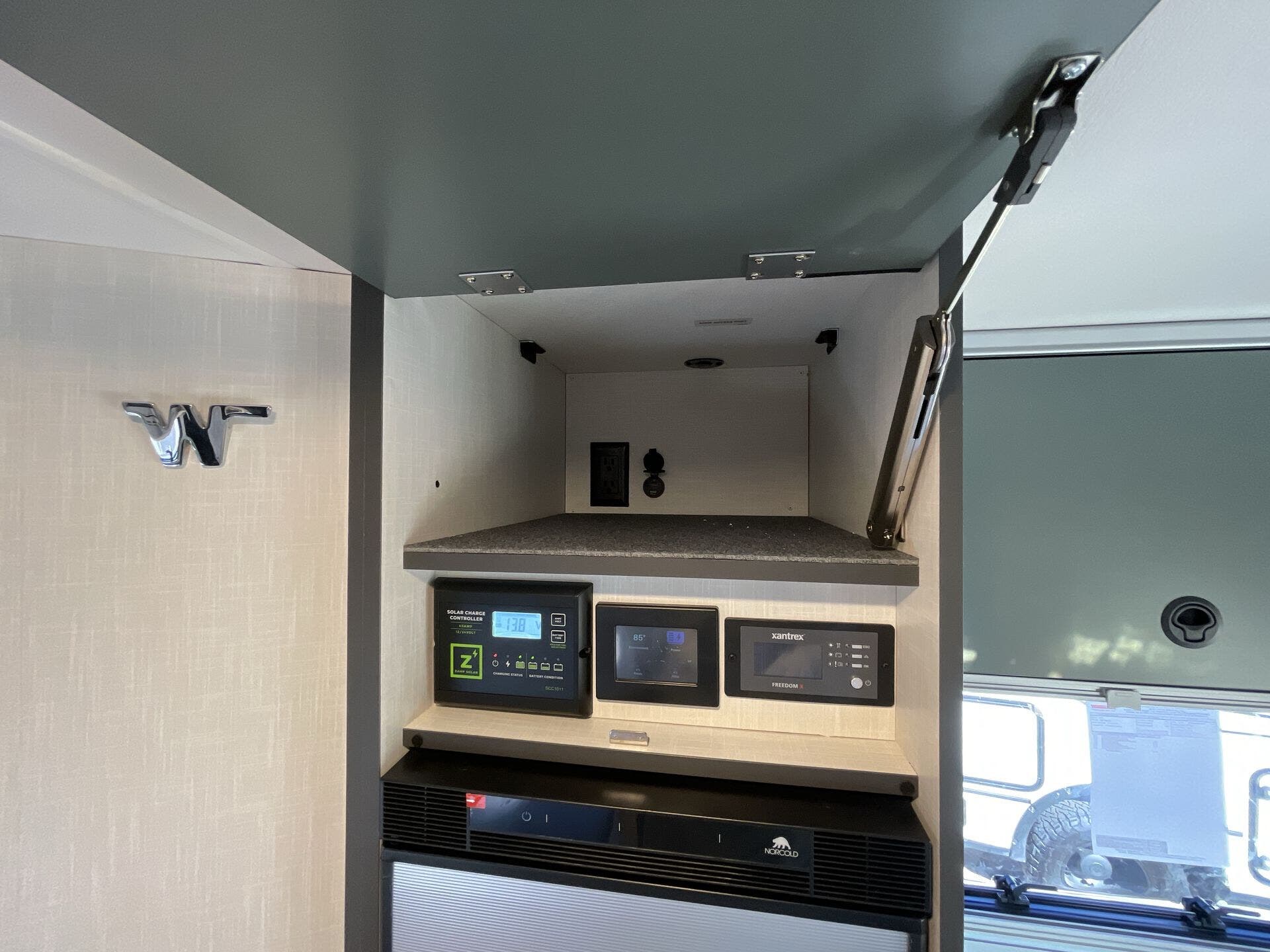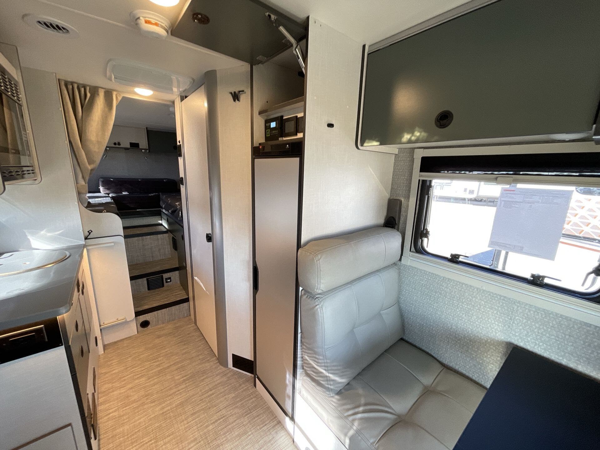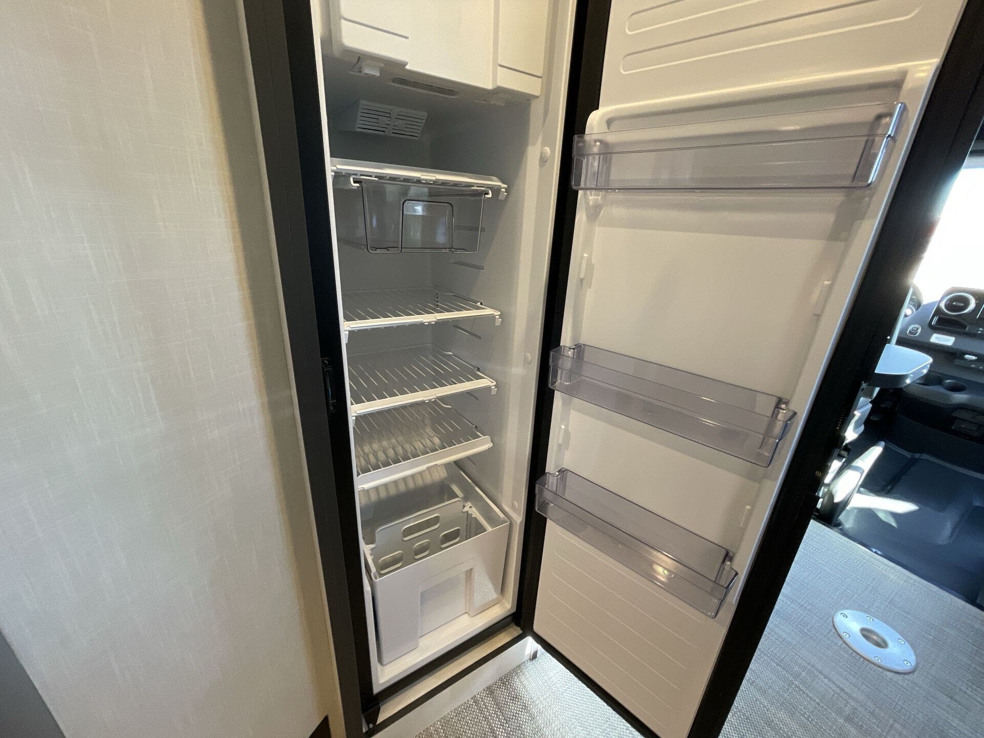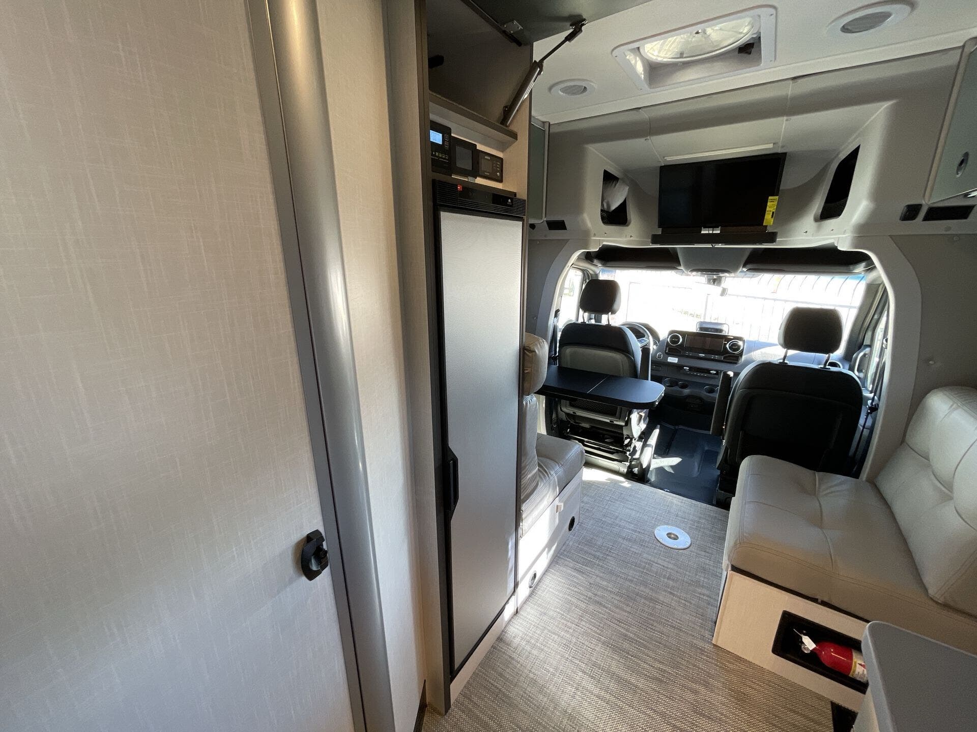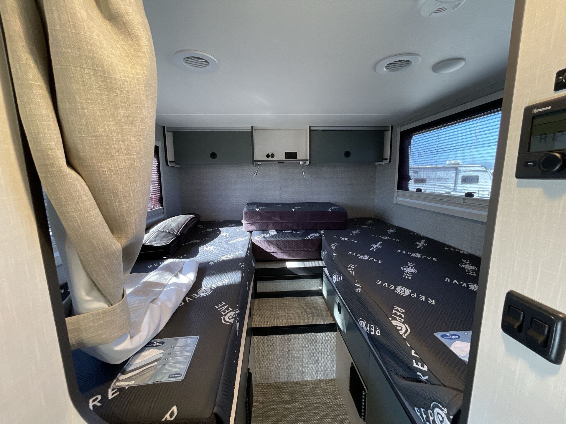 Inside, the Ekko 23B features a smart, versatile layout that maximizes every inch of space. Twin beds convert into a larger sleeping area, while the front lounge provides a comfortable place to dine, relax, or plan the next day’s route. The modern galley is fully equipped with quality appliances, ample storage, and efficient design, making meal prep easy whether you’re plugged in or off the grid. Premium materials, LED lighting, and contemporary styling give the interior a polished, upscale feel.